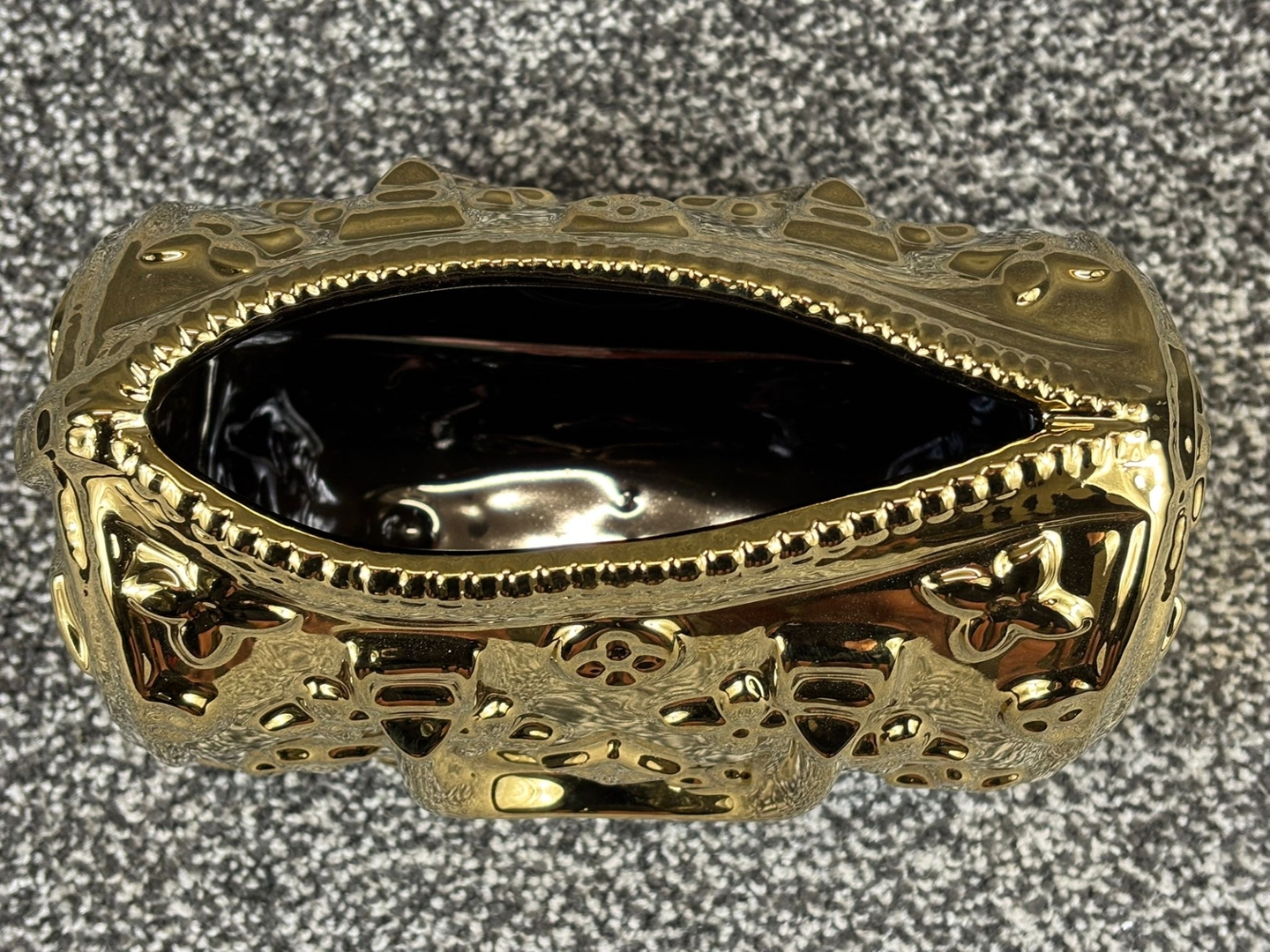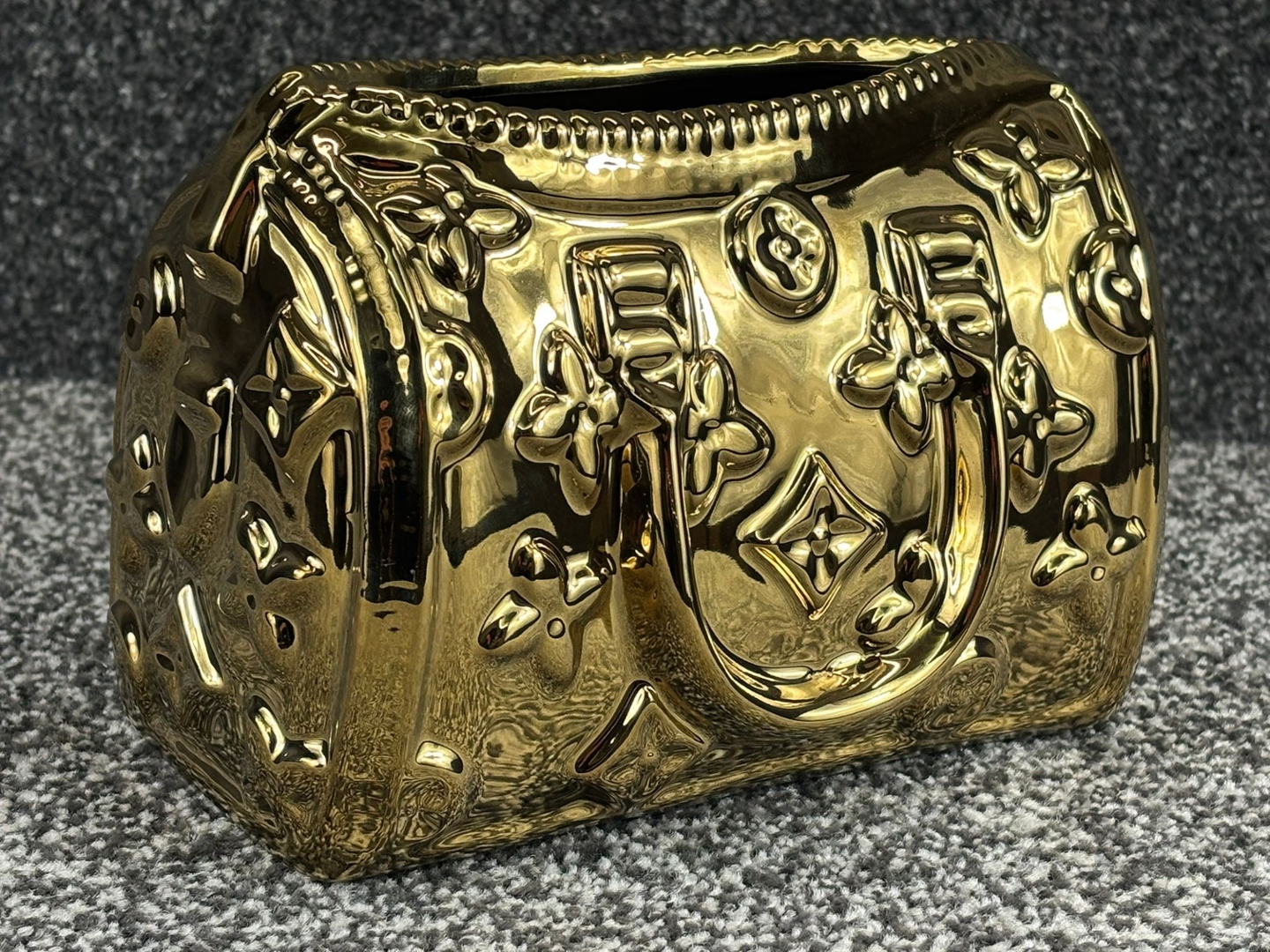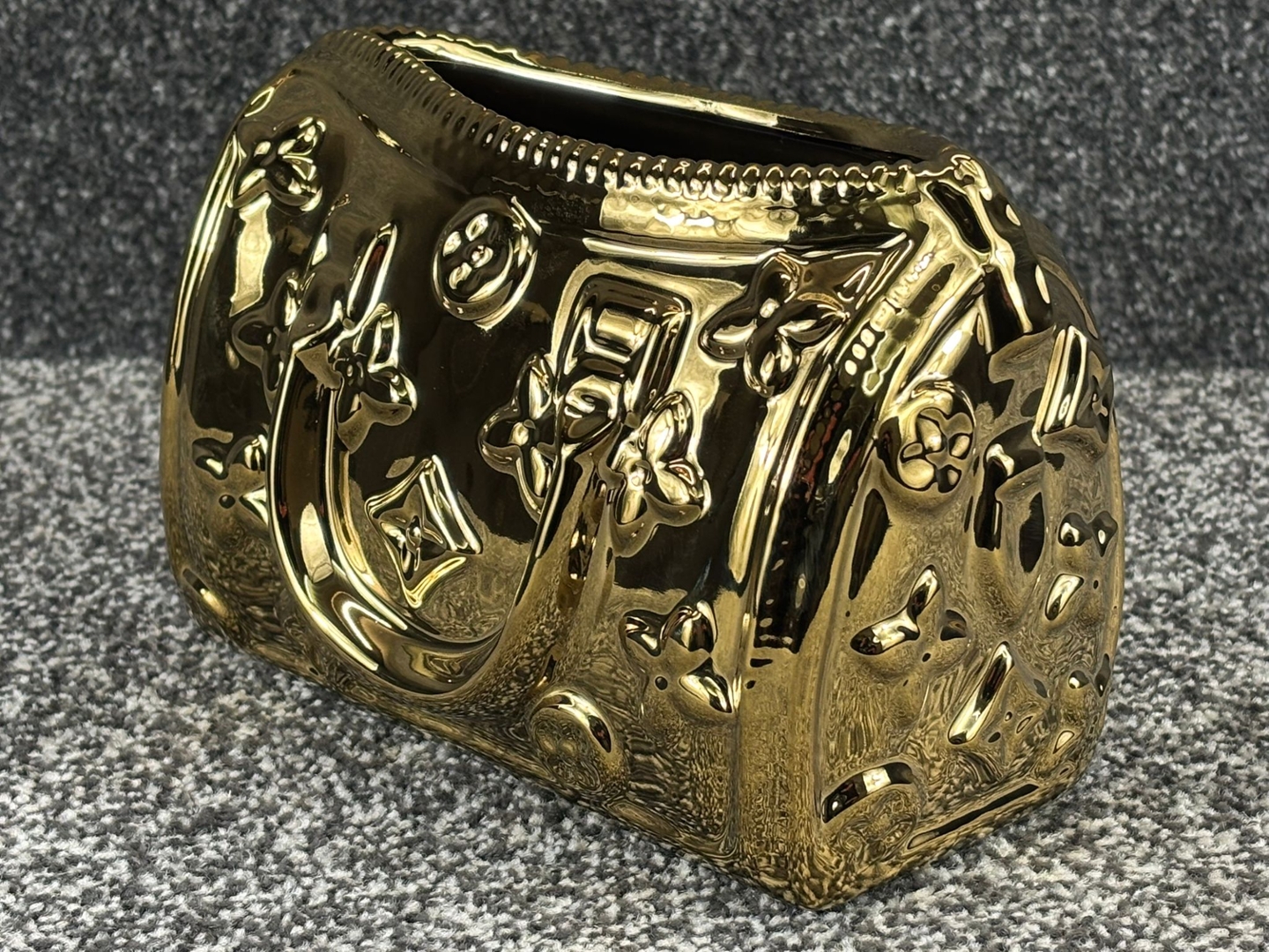 A Gold Ceramic Handbag Vase. Approx 13cm height, 19cm width, 9cm depth.