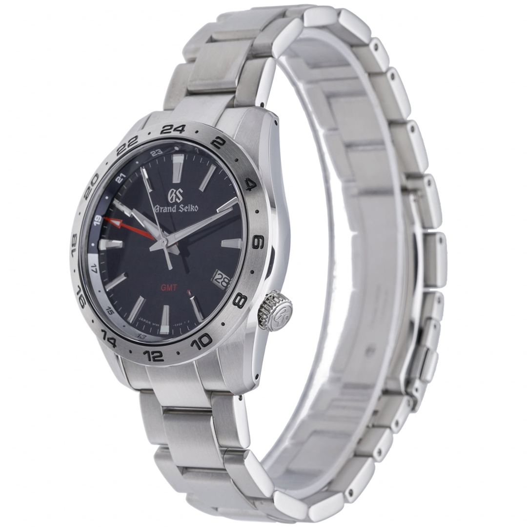 A Grand Seiko Sport Collection watch, model SBGN029G (9F86-0AK0), crafted in stainless steel with a deep blue dial and matching fixed 24-hour bezel. The 39mm case delivers sharp, angular lines with Grand Seiko’s signature Zaratsu-style finishing, while the bold applied hour markers and red GMT hand create strong contrast and outstanding legibility. The integrated steel bracelet completes the purposeful sports aesthetic, making this a highly versatile travel companion.