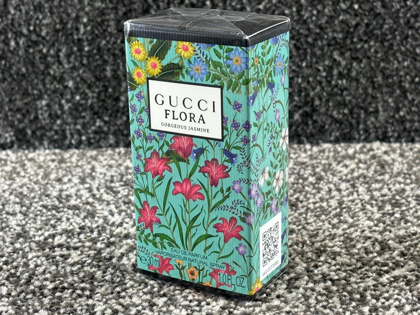 A 30ml bottle of Gucci Flora Gorgeous Jasmine Eau De Parfum, presented in its original presentation box and offering a radiant, elegant fragrance from the Gucci Flora collection. Designed to celebrate modern femininity, this scent reflects confidence and joy through a refined and contemporary character.