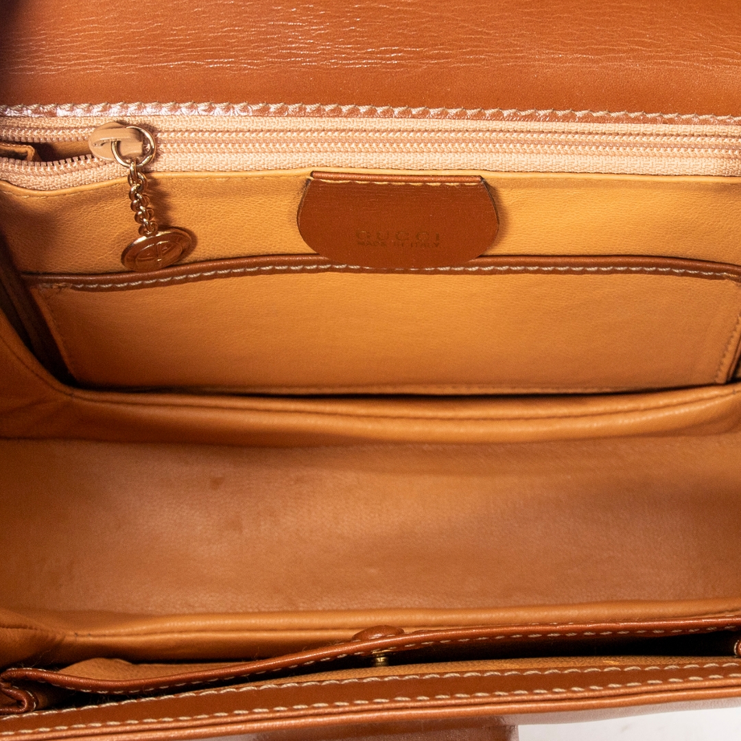 A vintage Gucci Bamboo Top Handle Flap Smooth Calfskin Leather bag with a certificate of authenticity, Approximately 15cm height, 22cm width.