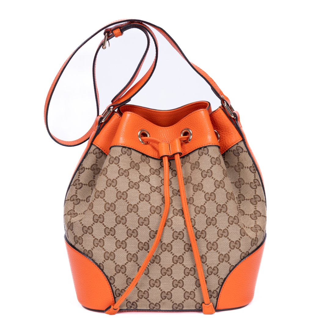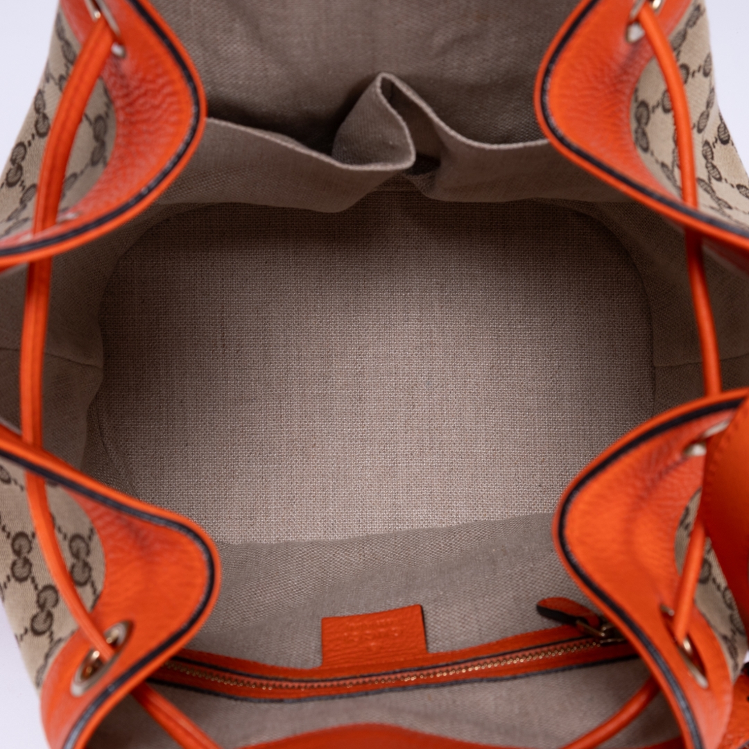A vintage Gucci beige and orange calf leather Bucket Trim bag, showcasing the house’s iconic GG monogram canvas paired with bold orange leather accents. The softly structured bucket silhouette is enhanced by smooth leather trim and clean lines, creating a striking contrast that highlights its signature Gucci aesthetic. Finished with subtle hardware detailing, the design balances heritage style with a modern edge.