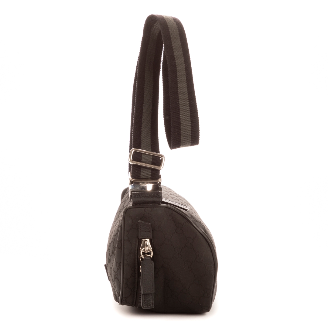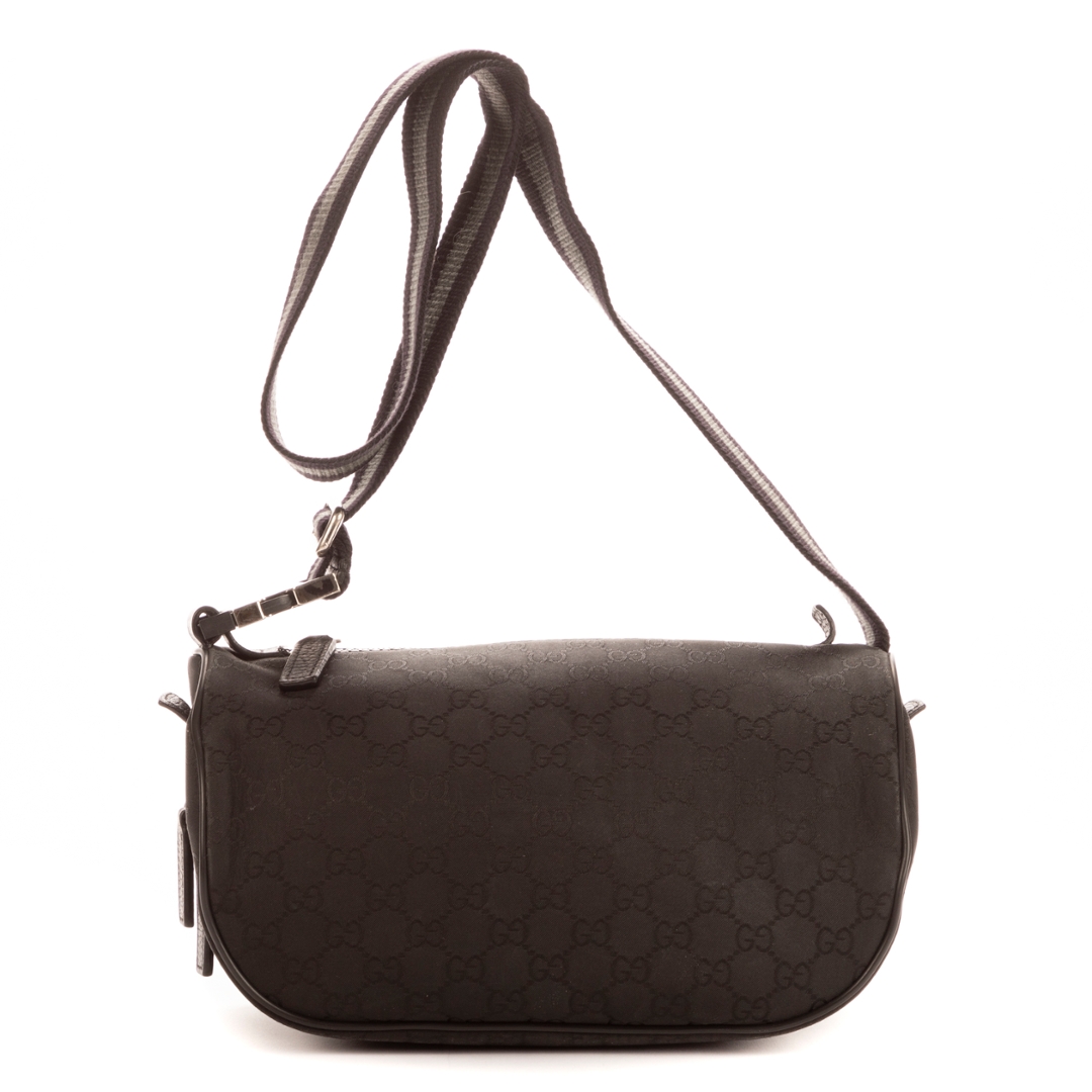 A vintage Gucci black canvas bumbag, featuring the house’s iconic GG monogram subtly woven throughout the fabric. The compact, streamlined silhouette is complemented by tonal leather trim and a discreet Gucci plaque to the front, creating a clean and understated aesthetic. Its minimalist design reflects Gucci’s ability to blend practicality with timeless style.