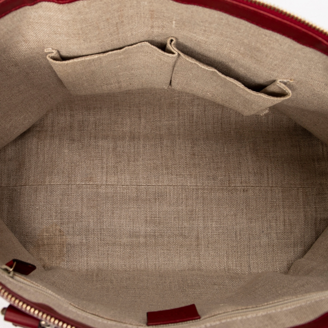 A vintage Gucci red calf leather Convertible Satchel bag with a certificate of authenticity, this elegant piece showcases the refined texture and structured shape that define Gucci’s more understated archival designs. Crafted in richly coloured red calf leather, the exterior features a distinctive woven-effect pattern that adds depth and sophistication, complemented by smooth leather trim and neatly finished seams. The dual top handles create a classic satchel profile, giving the bag a polished and timeless presence.
