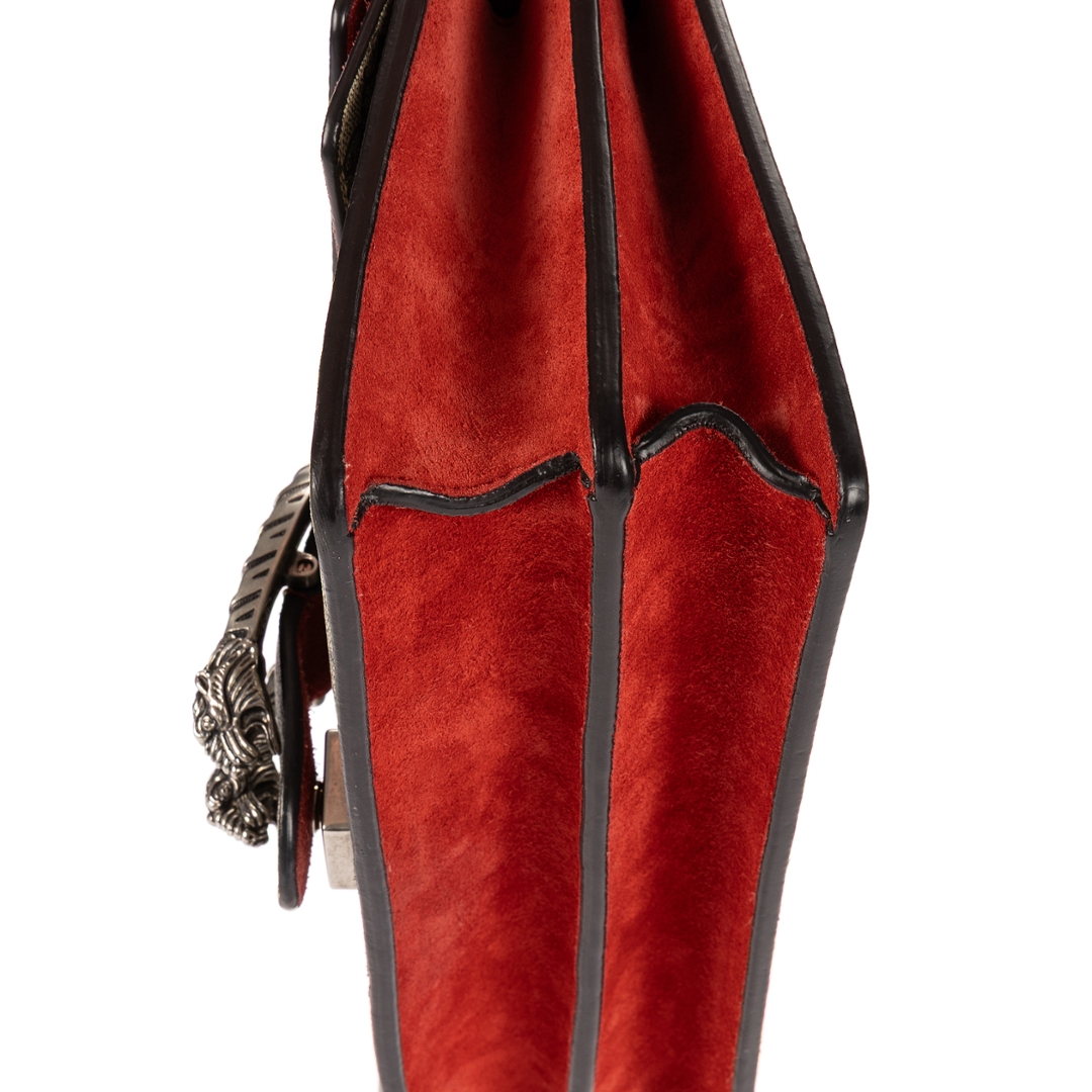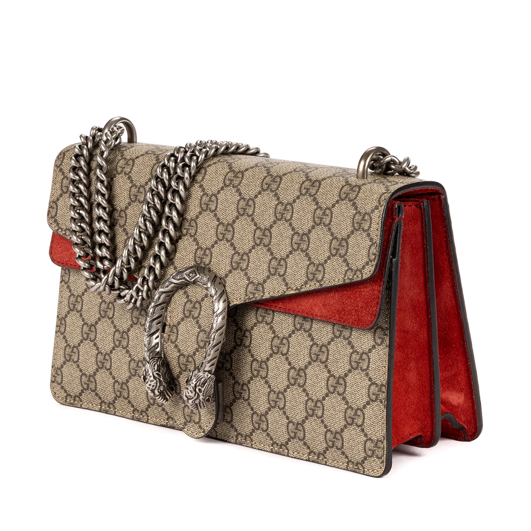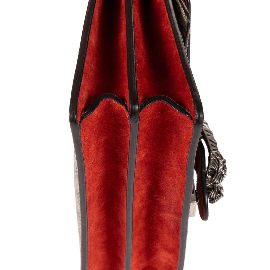 A vintage Gucci beige and red coated canvas Dionysus bag, featuring the house’s iconic GG Supreme monogram in a timeless neutral palette. The structured silhouette is enhanced by rich red suede panels, creating a bold contrast that defines its distinctive look. At the centre, the signature tiger head spur closure in aged silver-tone hardware delivers an instantly recognisable and striking focal point.