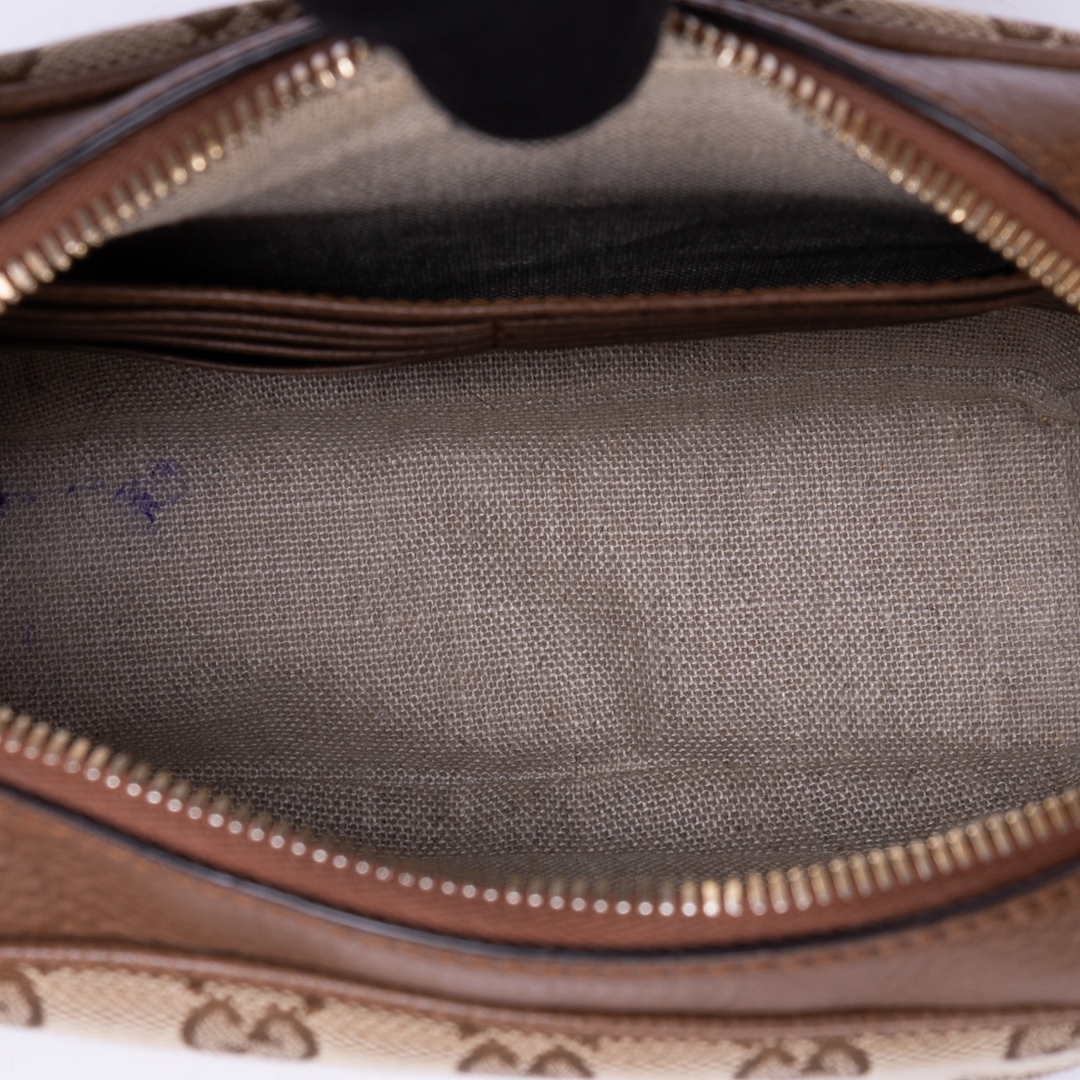 A vintage Gucci brown and beige calf leather GG Canvas Bree Camera bag, showcasing the house’s iconic GG monogram set against a classic neutral canvas. The compact silhouette is complemented by warm brown leather trim, creating a refined contrast that highlights its timeless and recognisable aesthetic. Clean lines and subtle detailing give the piece a polished, versatile finish.