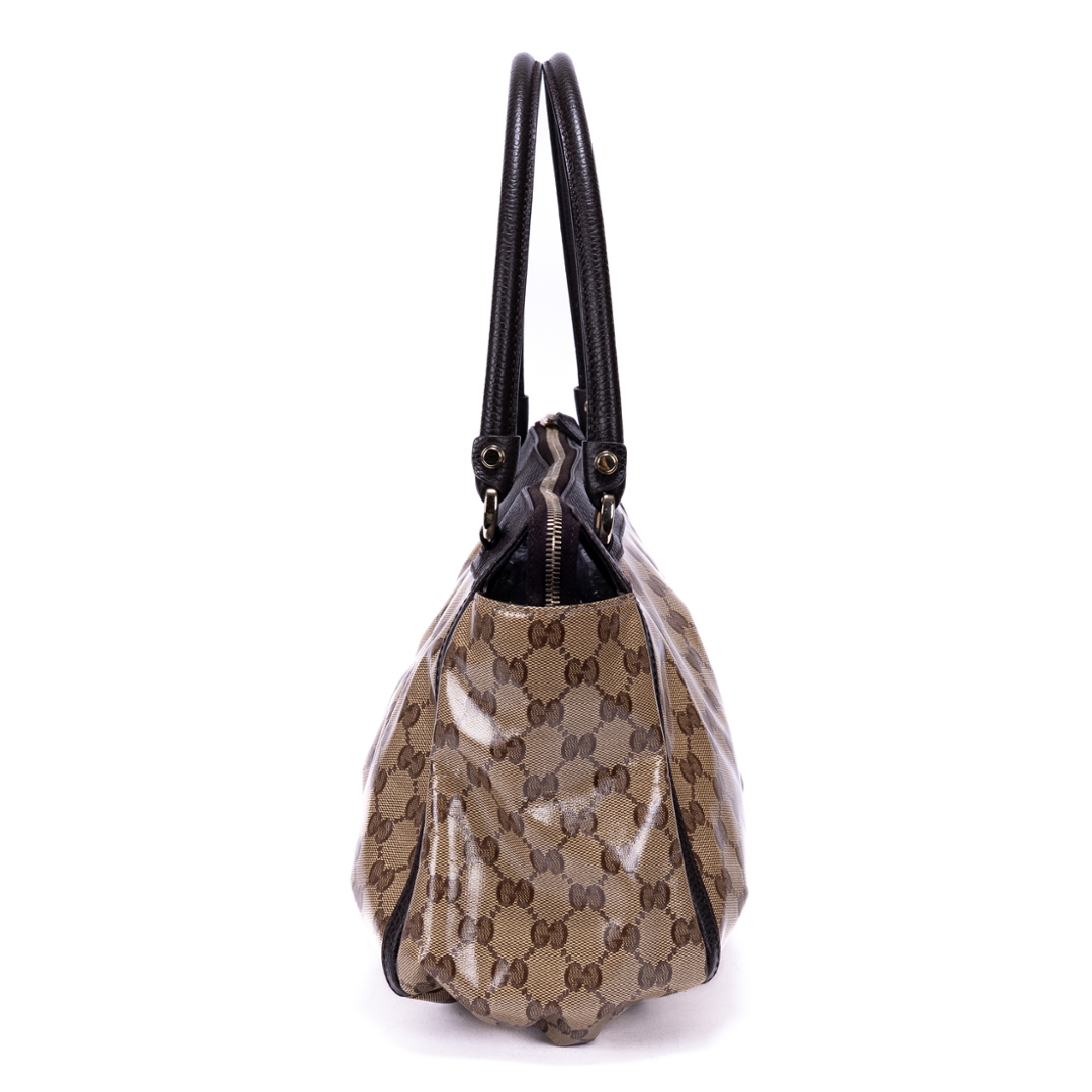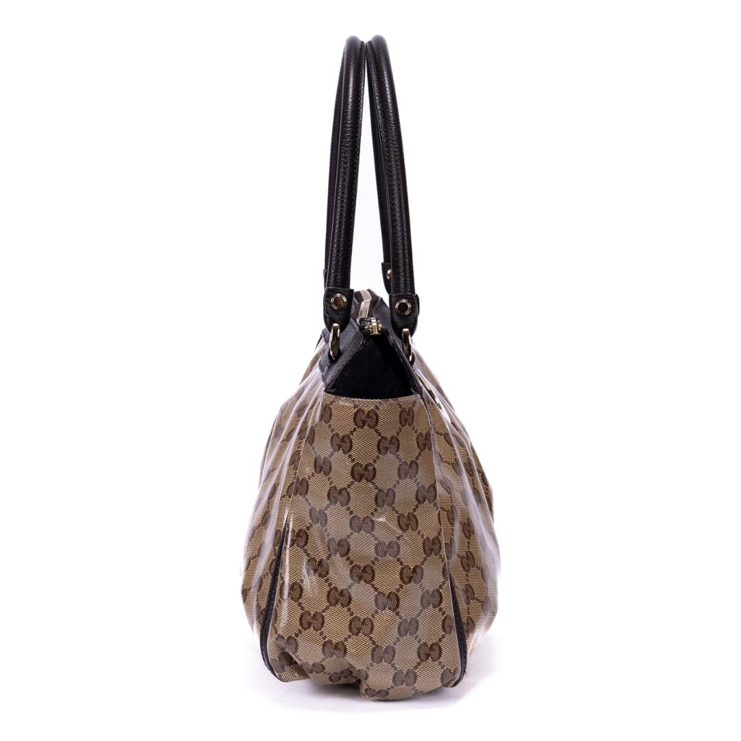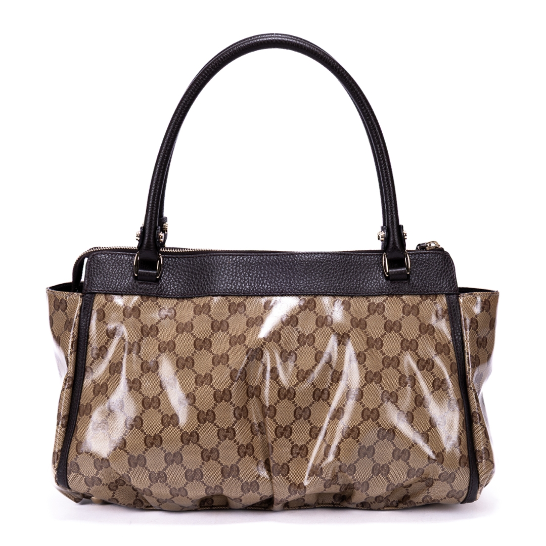 A vintage Gucci dark brown/beige calf leather GG Crystal Abbey D-Ring Tote bag with a certificate of authenticity, Approximately 23cm height, 37cm width.