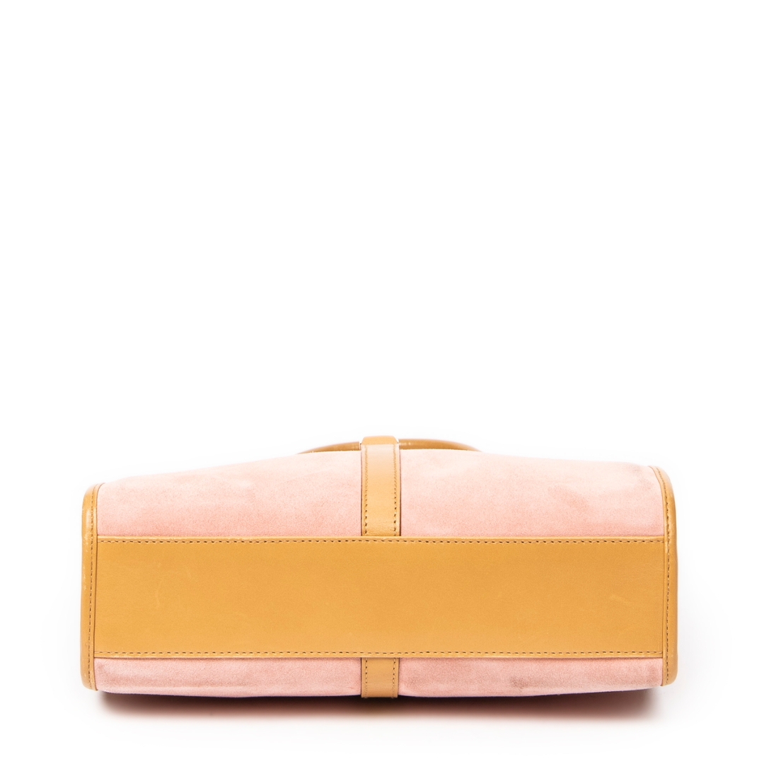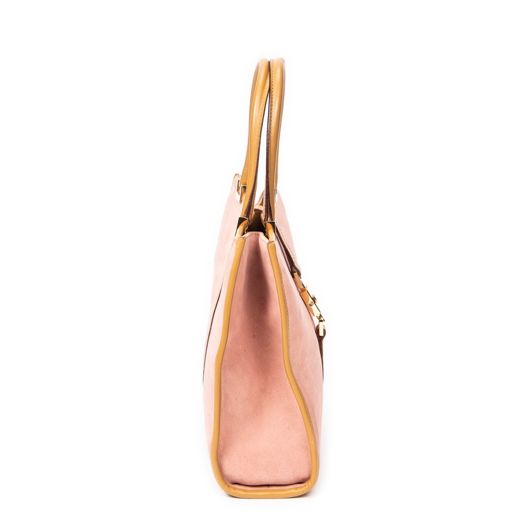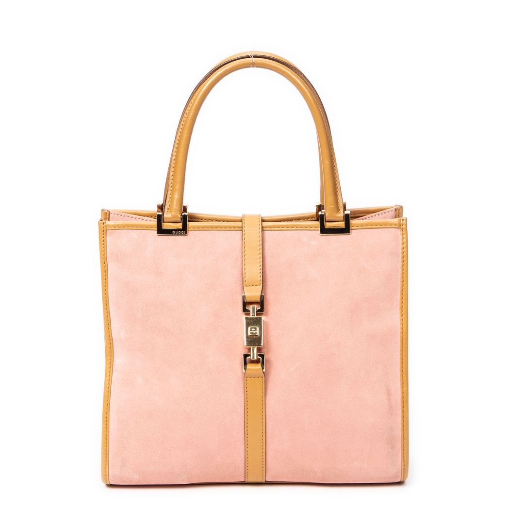 A vintage Gucci pink and brown calf leather Jackie Tote bag, blending soft feminine tones with one of the house’s most iconic silhouettes. The structured design is elevated by smooth calf leather in a muted pink hue, framed by warm brown trim and handles, while the signature piston-style clasp adds a refined, heritage-driven focal point synonymous with the Jackie line.