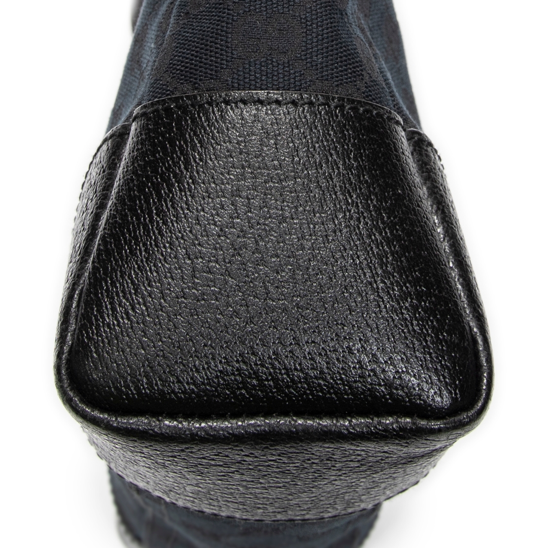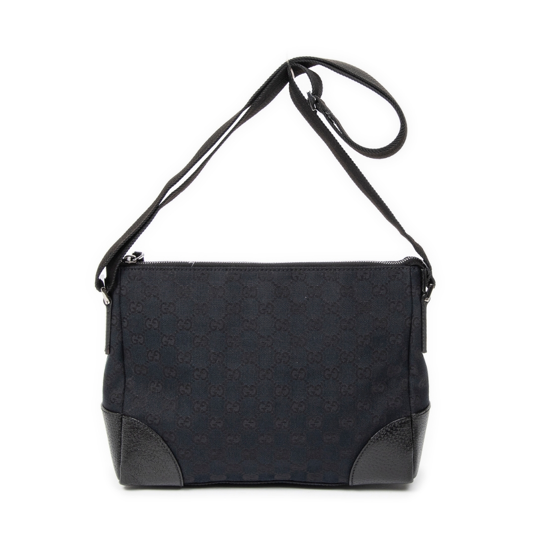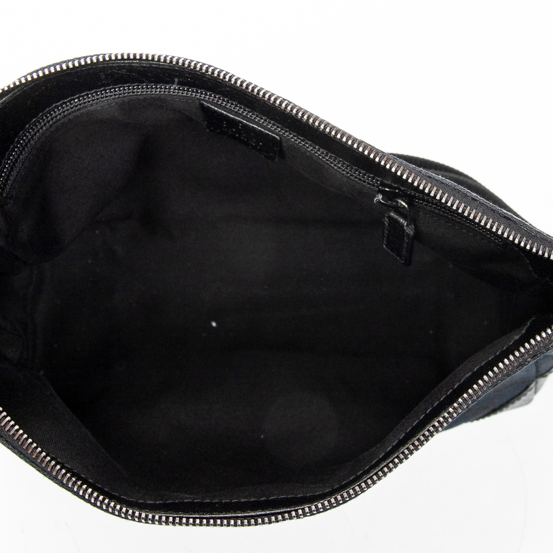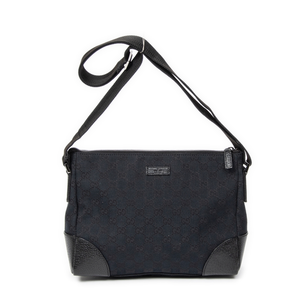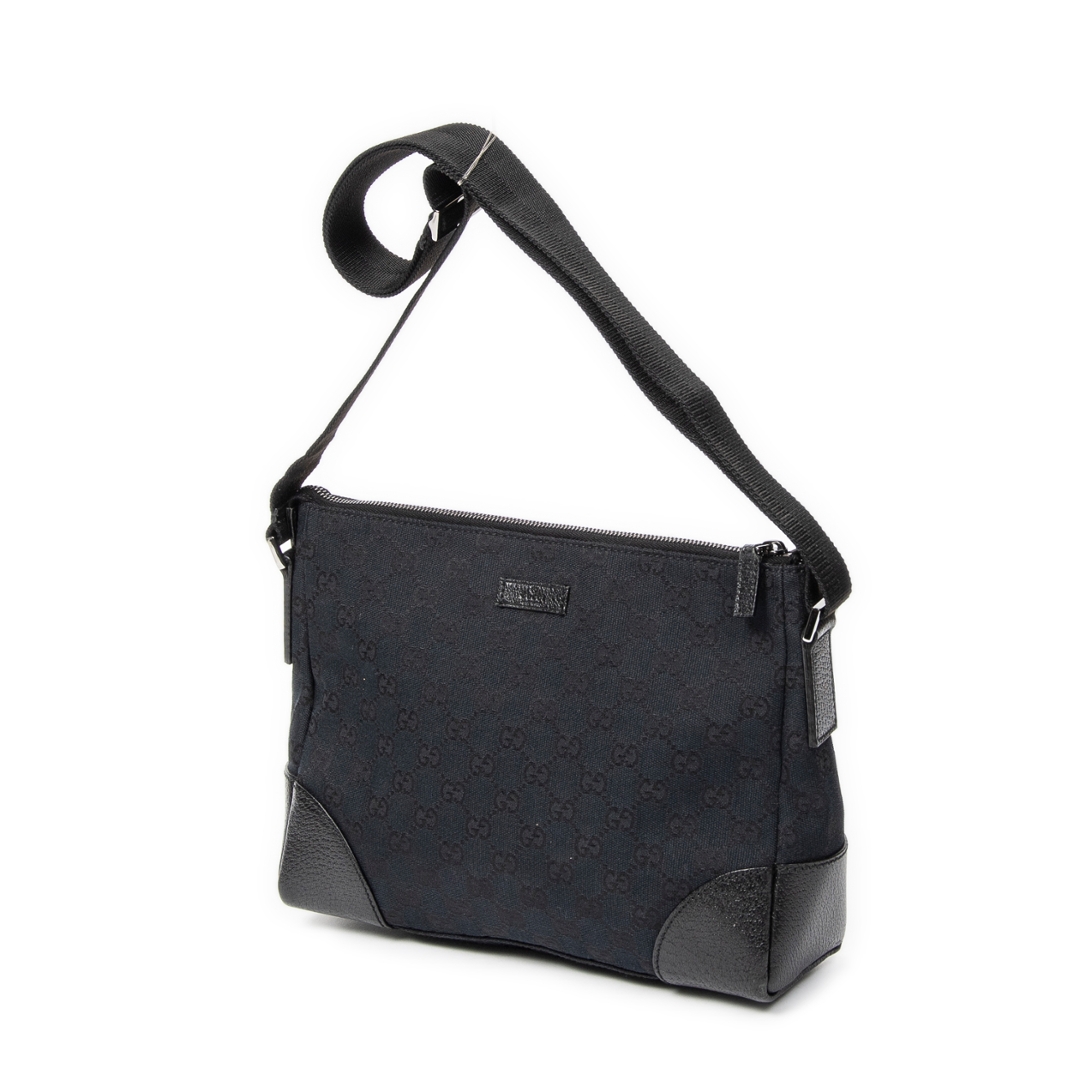 A vintage Gucci black canvas Joy Messenger bag, presenting a sleek and understated take on the house’s iconic GG monogram. The tonal black canvas is complemented by matching leather trim at the corners and edges, creating a refined, minimalist look while maintaining the instantly recognisable Gucci aesthetic.