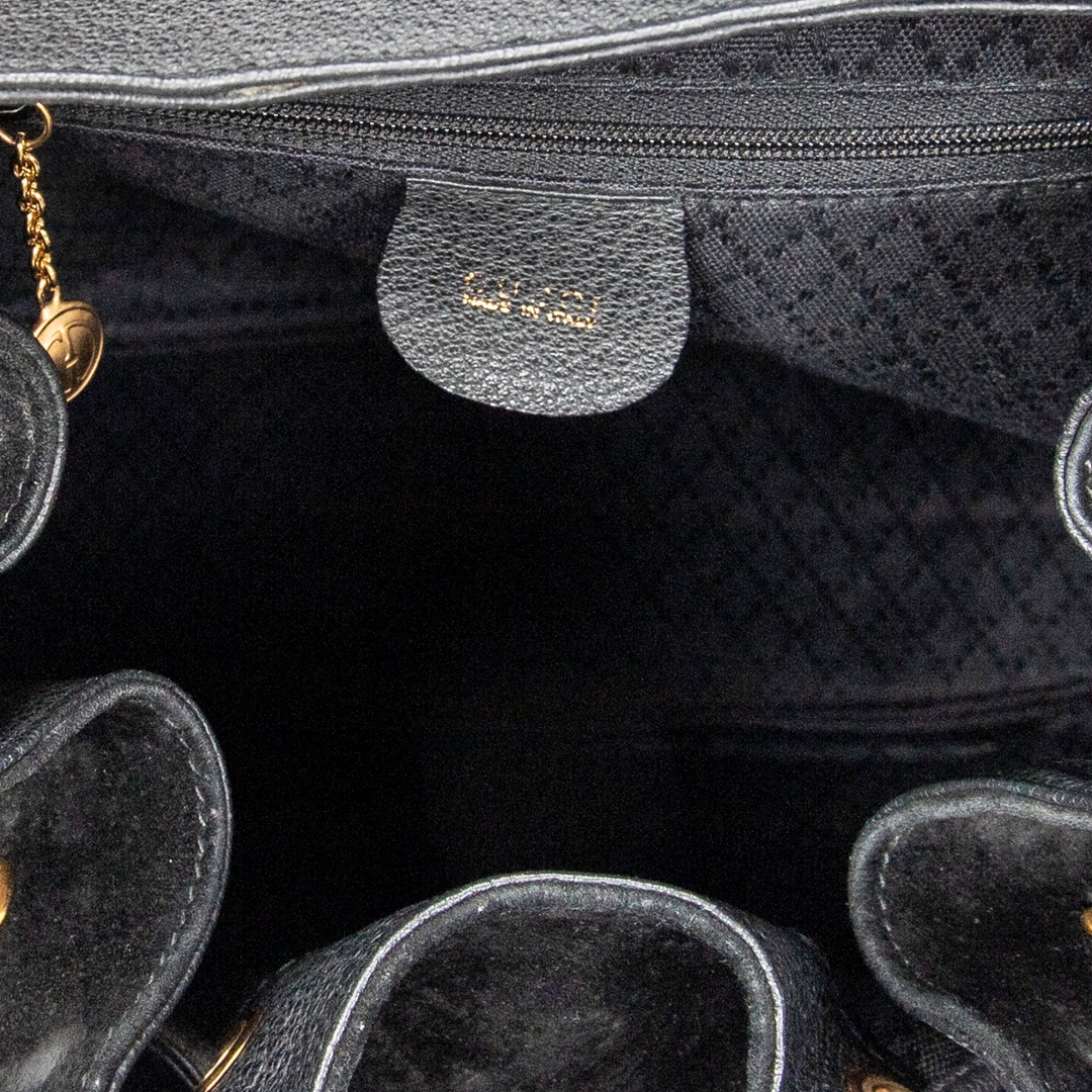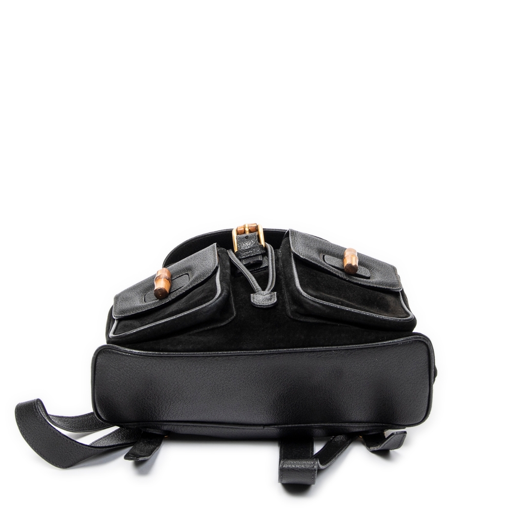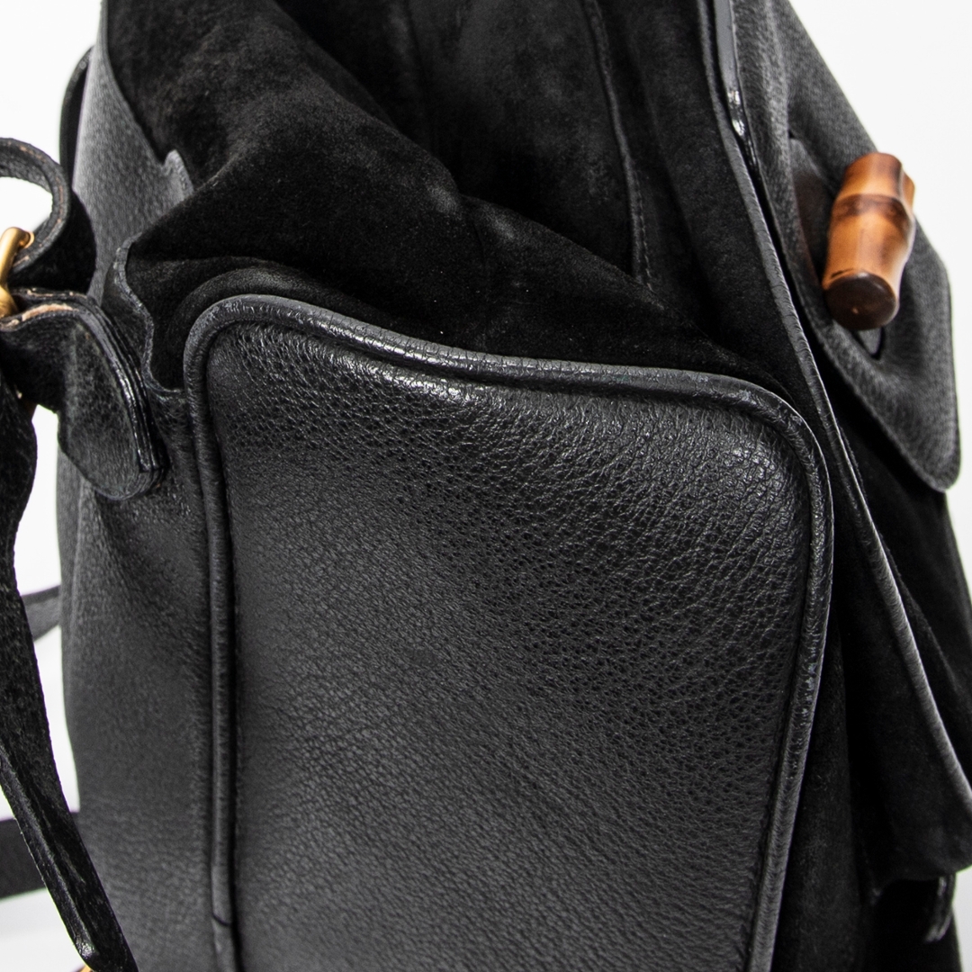 A vintage Gucci black calf leather Large Bamboo Backpack bag with a certificate of authenticity, Approximately 20cm height, 20m width.