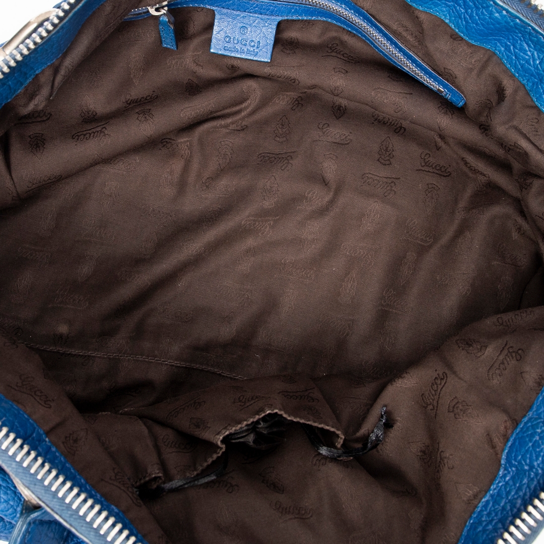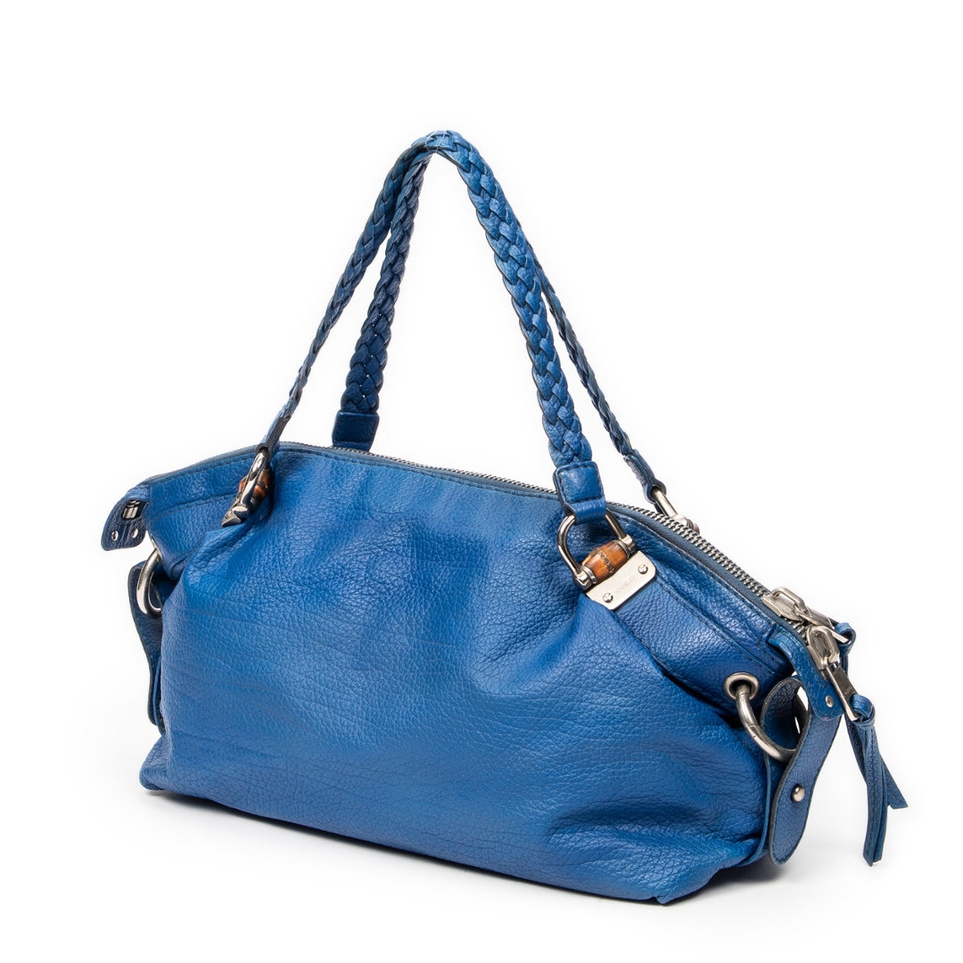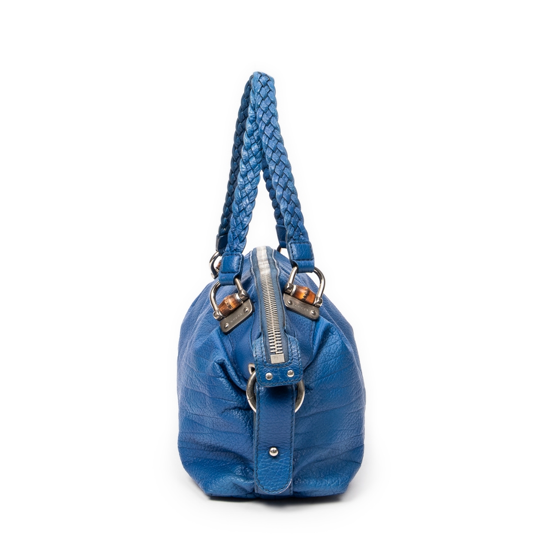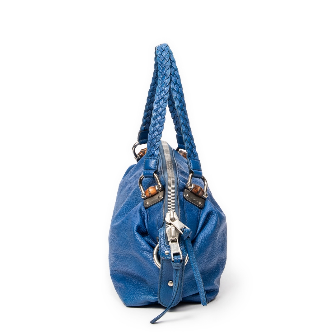 A vintage Gucci royal blue calf leather Large Bamboo Bar Boston bag with a certificate of authenticity, this striking piece showcases the bold colour, refined texture and signature detailing that define Gucci’s more distinctive archival designs. Crafted in richly saturated royal blue calf leather, the bag features a soft, naturally grained surface complemented by braided leather handles that echo the house’s iconic bamboo-inspired craftsmanship. The elongated Boston silhouette offers a relaxed yet structured profile, enhanced by silver-tone hardware that adds a subtle contemporary edge.