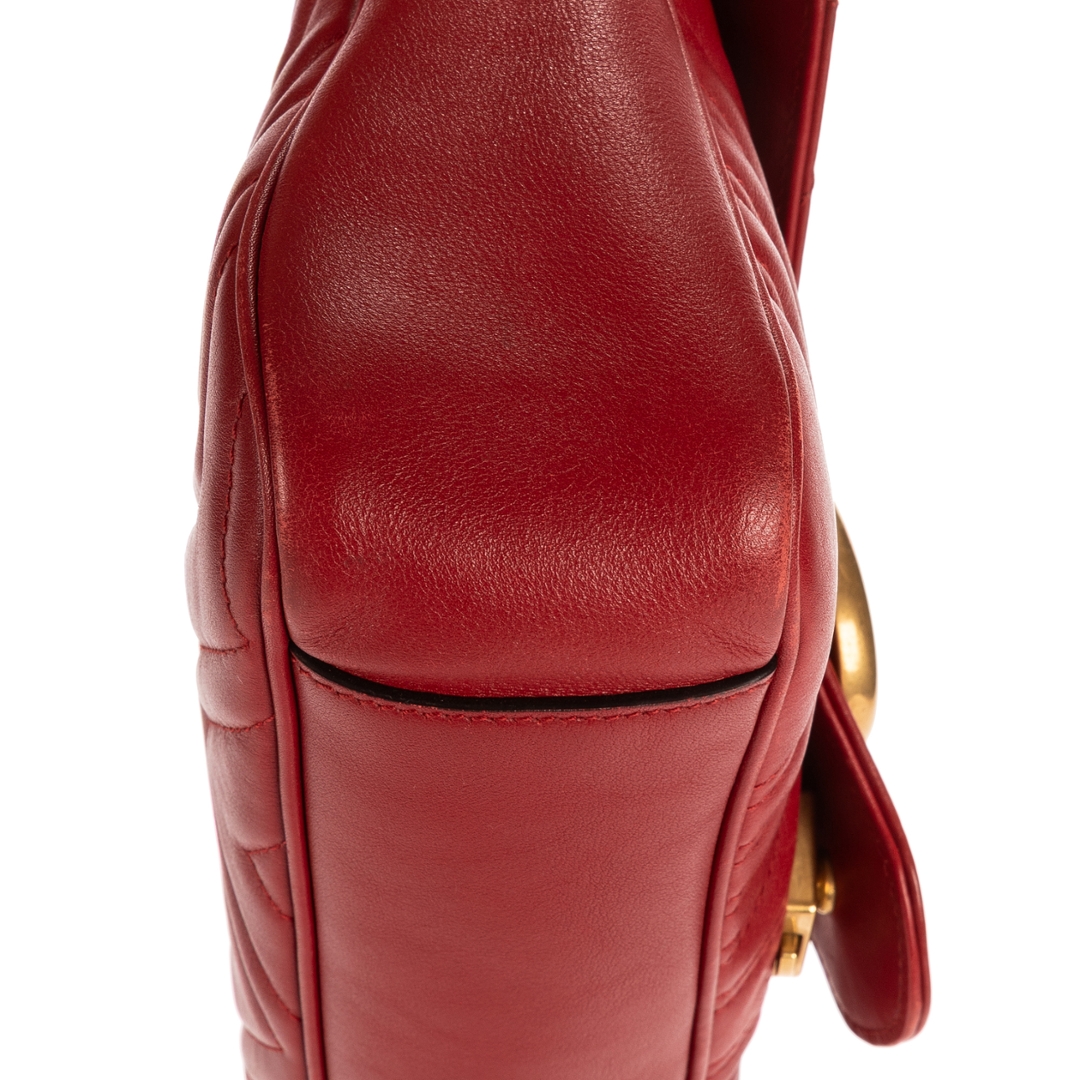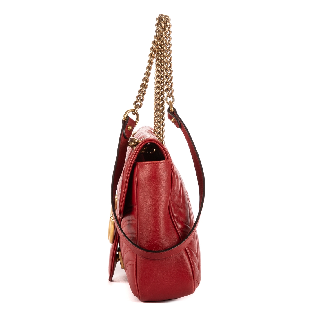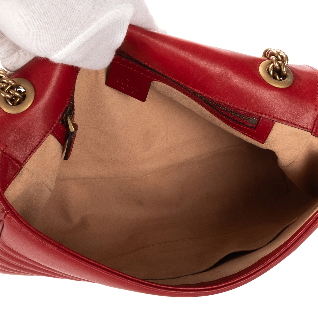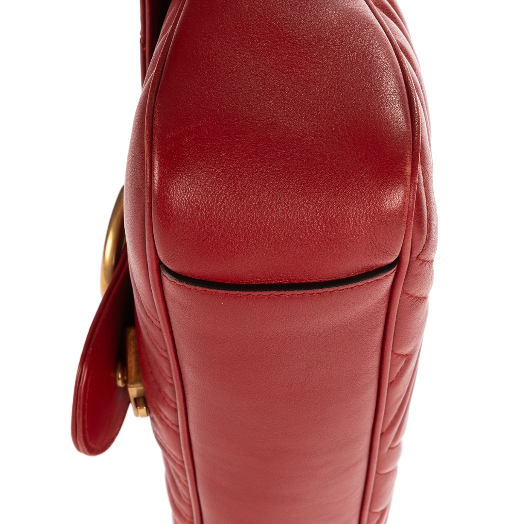 A vintage Gucci red calf leather Marmont Flap bag with a certificate of authenticity, Approximately 20cm height, 29cm width.