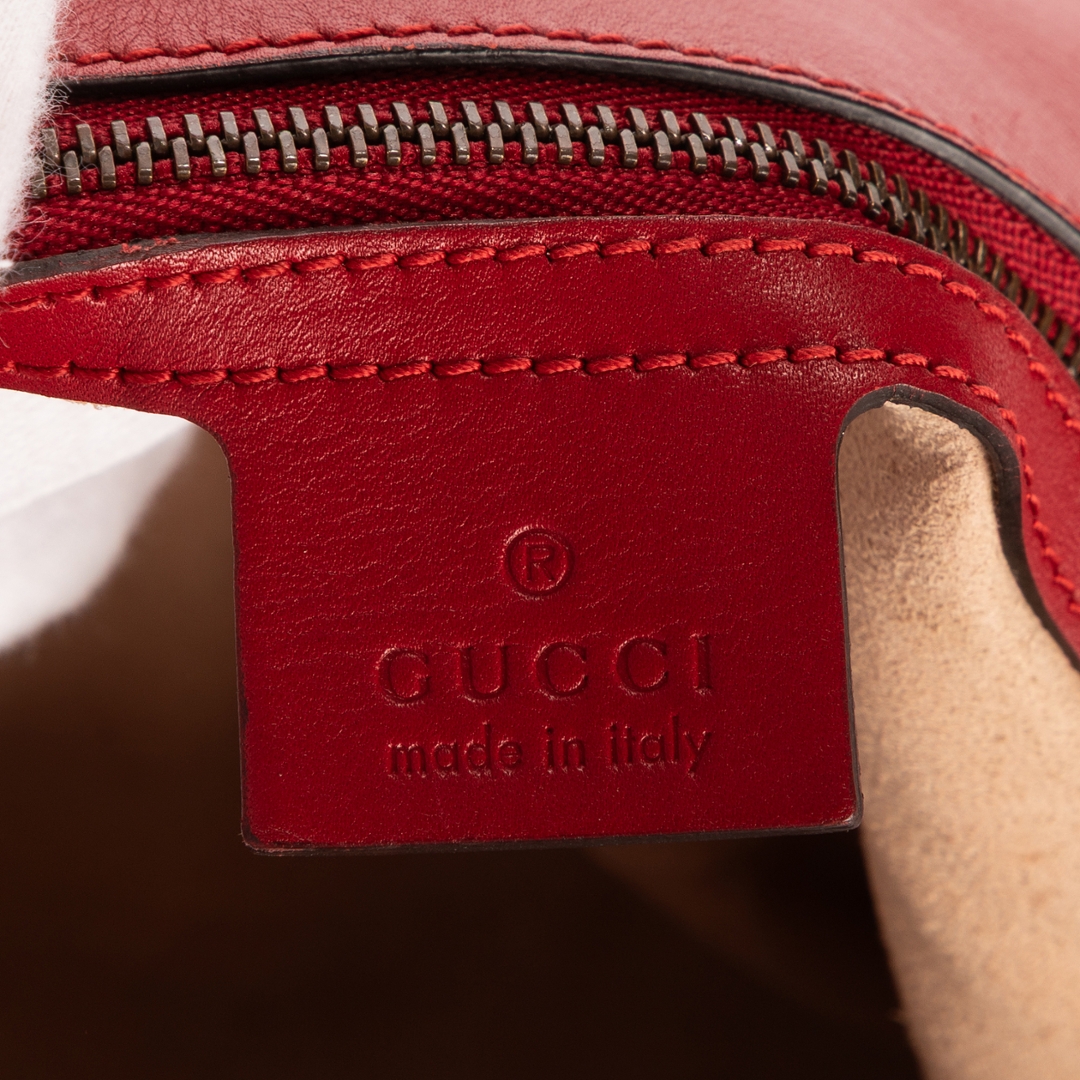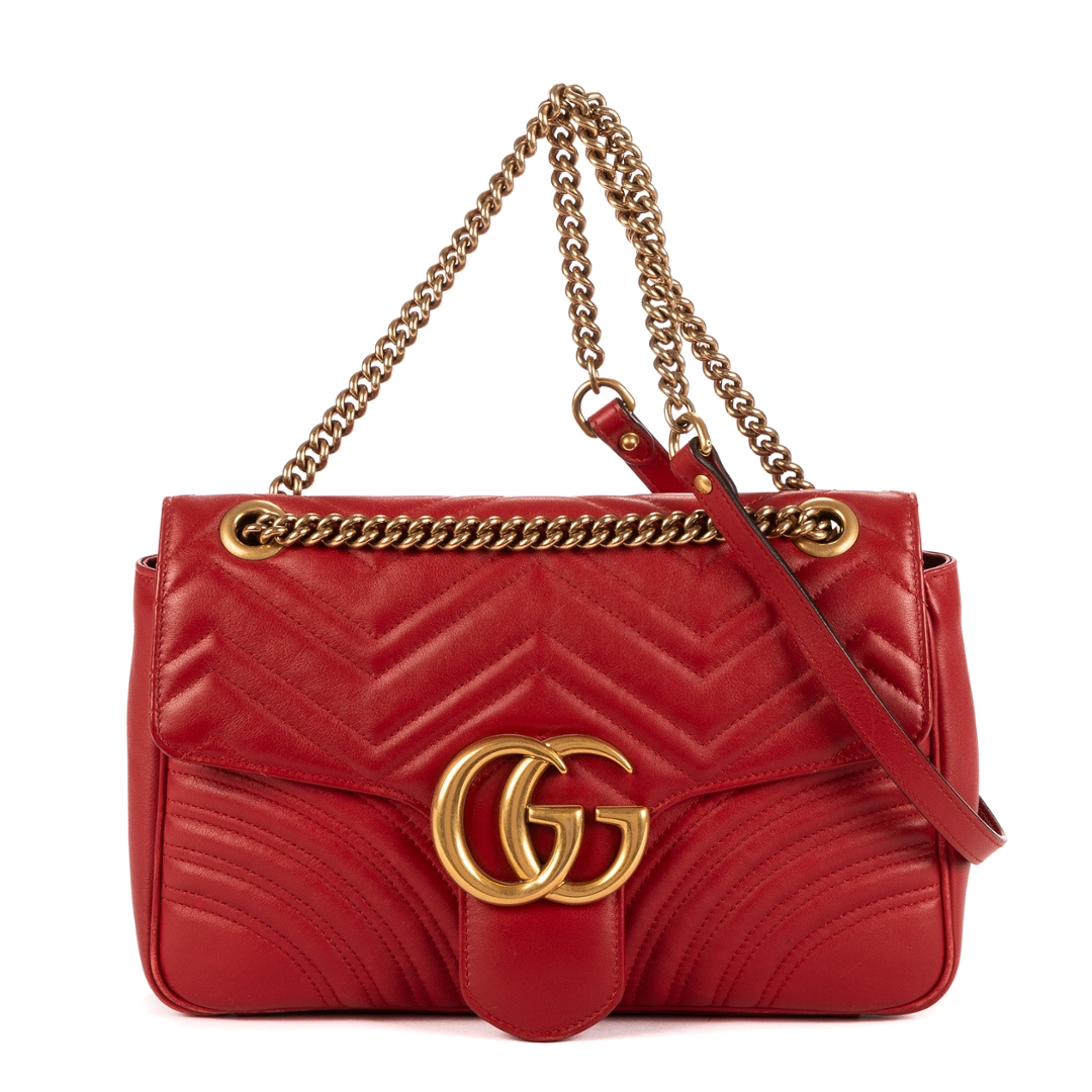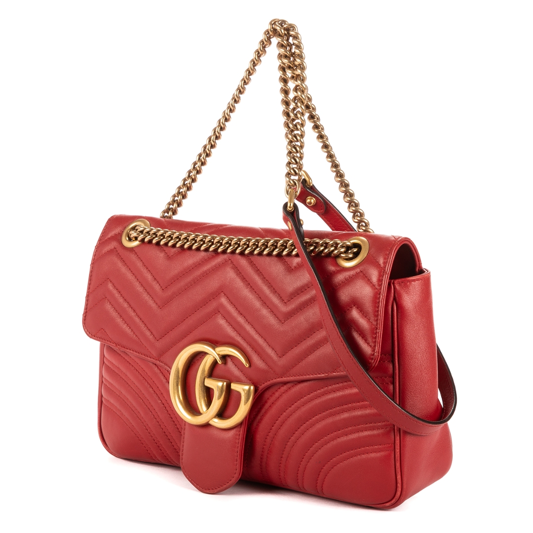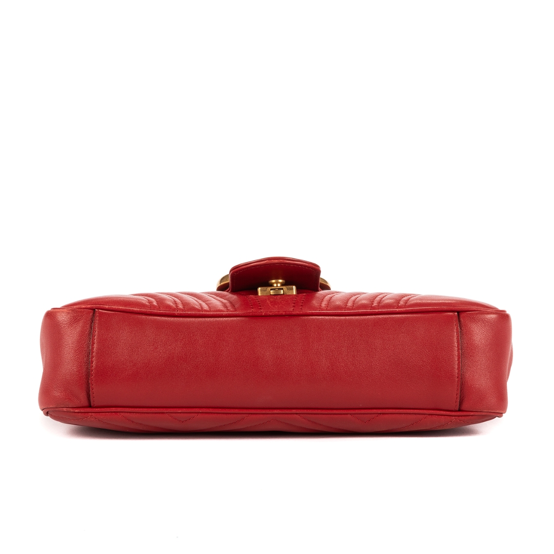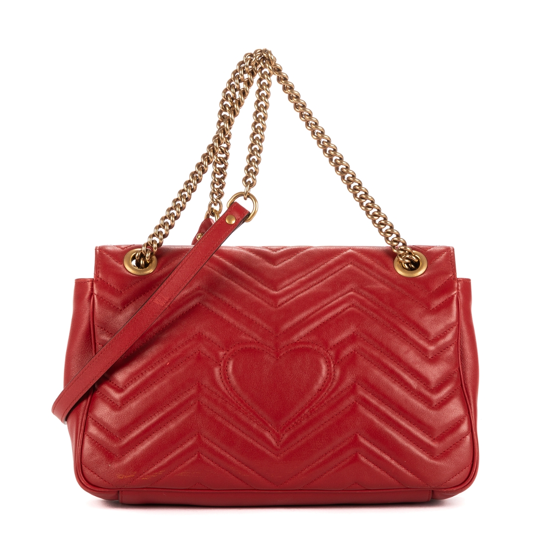 A vintage Gucci red calf leather Marmont Flap bag with a certificate of authenticity, Approximately 20cm height, 29cm width.