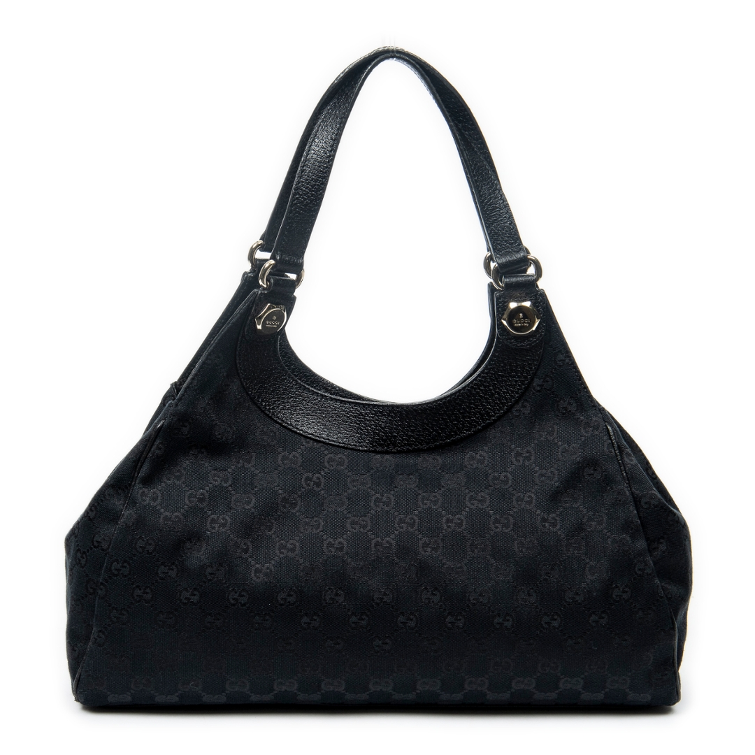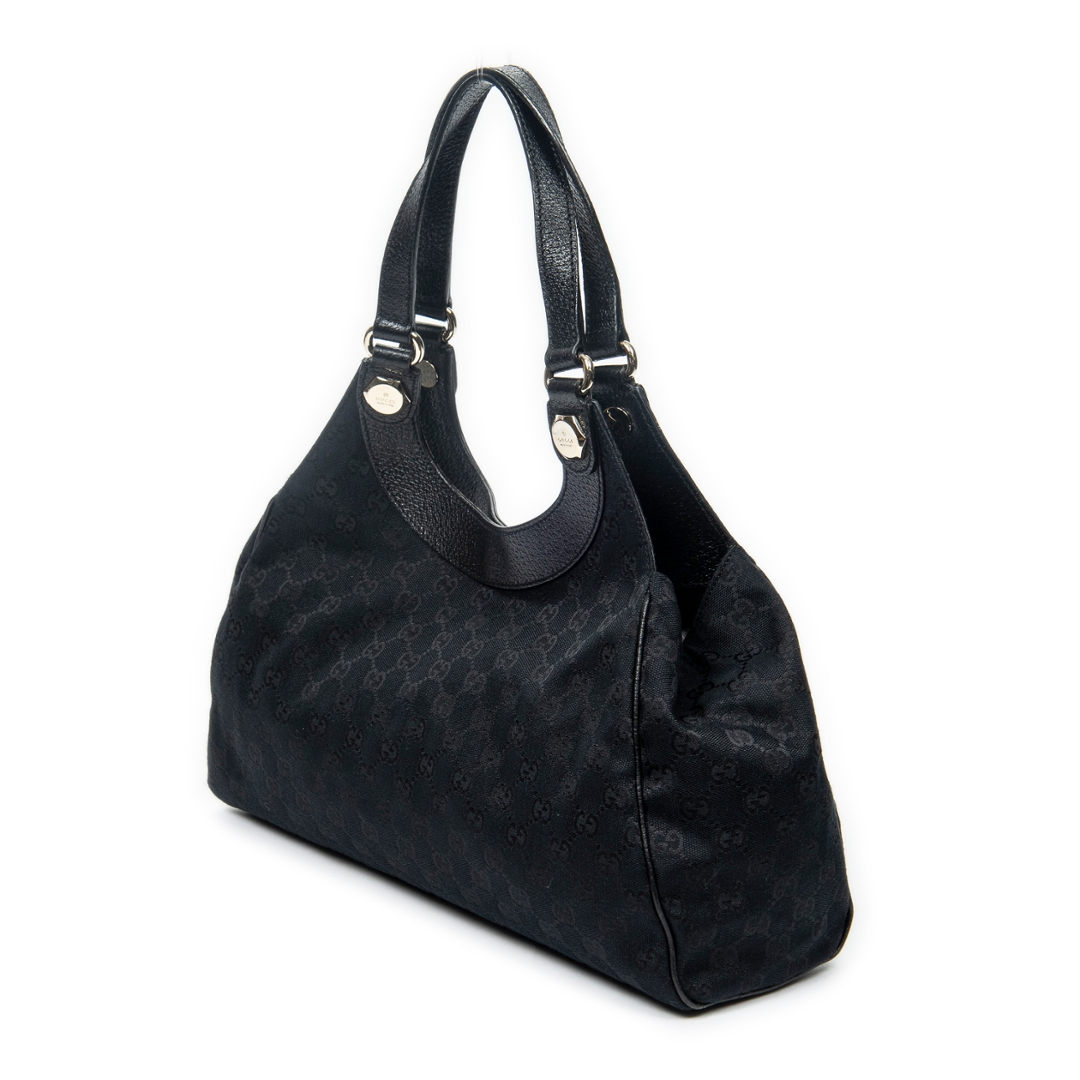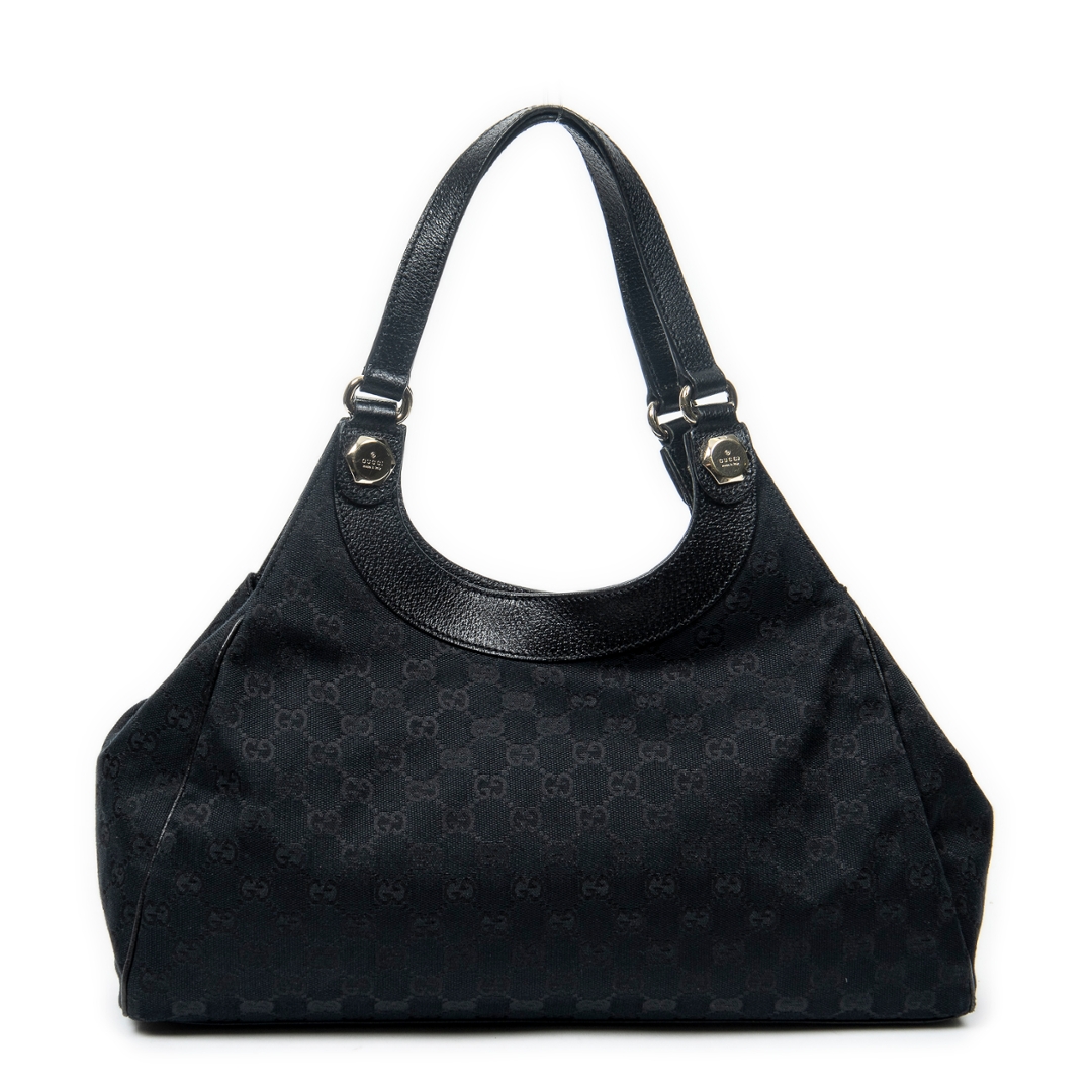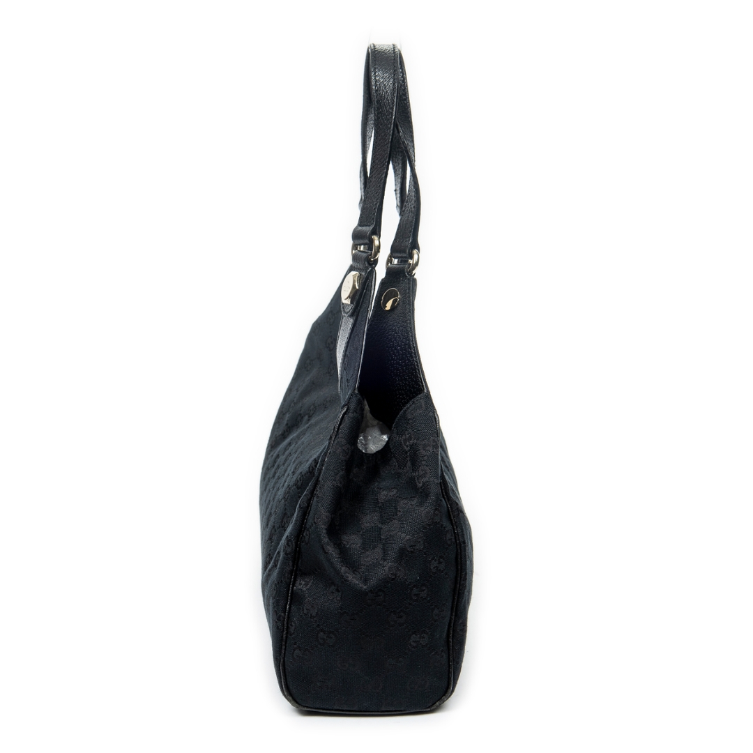 A vintage Gucci black canvas Medium Charmy Shoulder Bag with a certificate of authenticity, Approximately 22cm height, 38cm width.