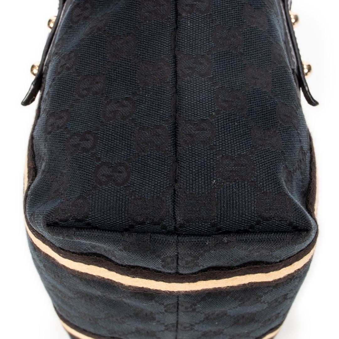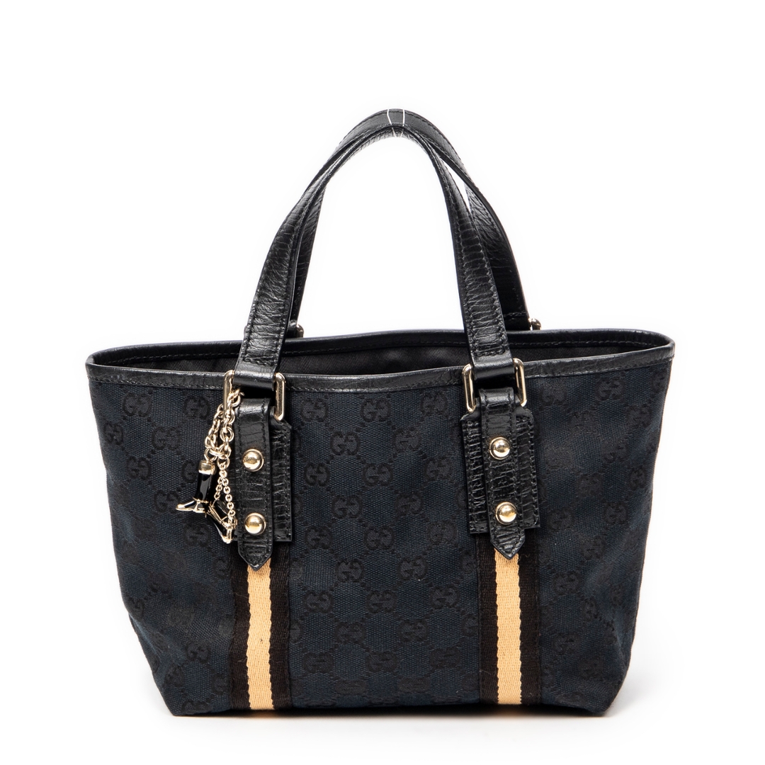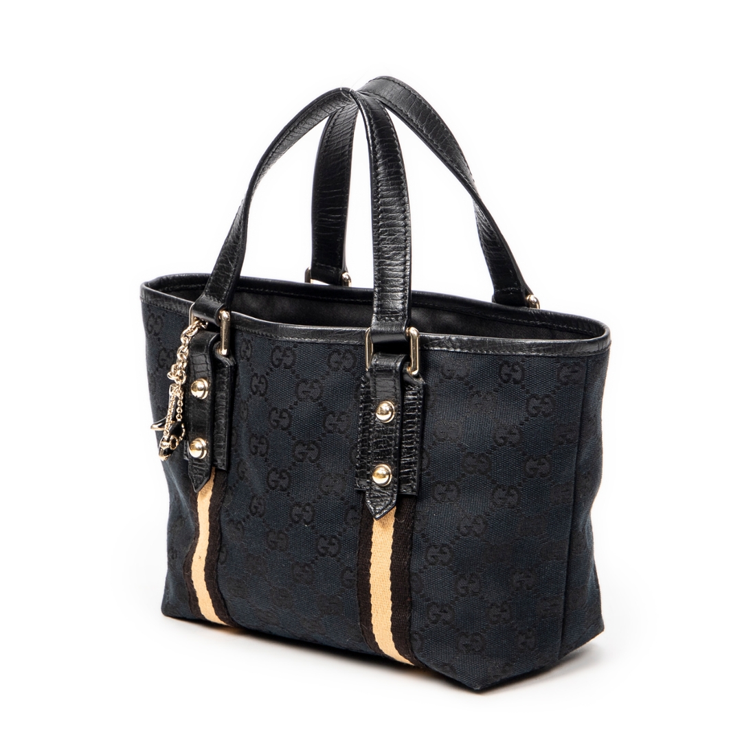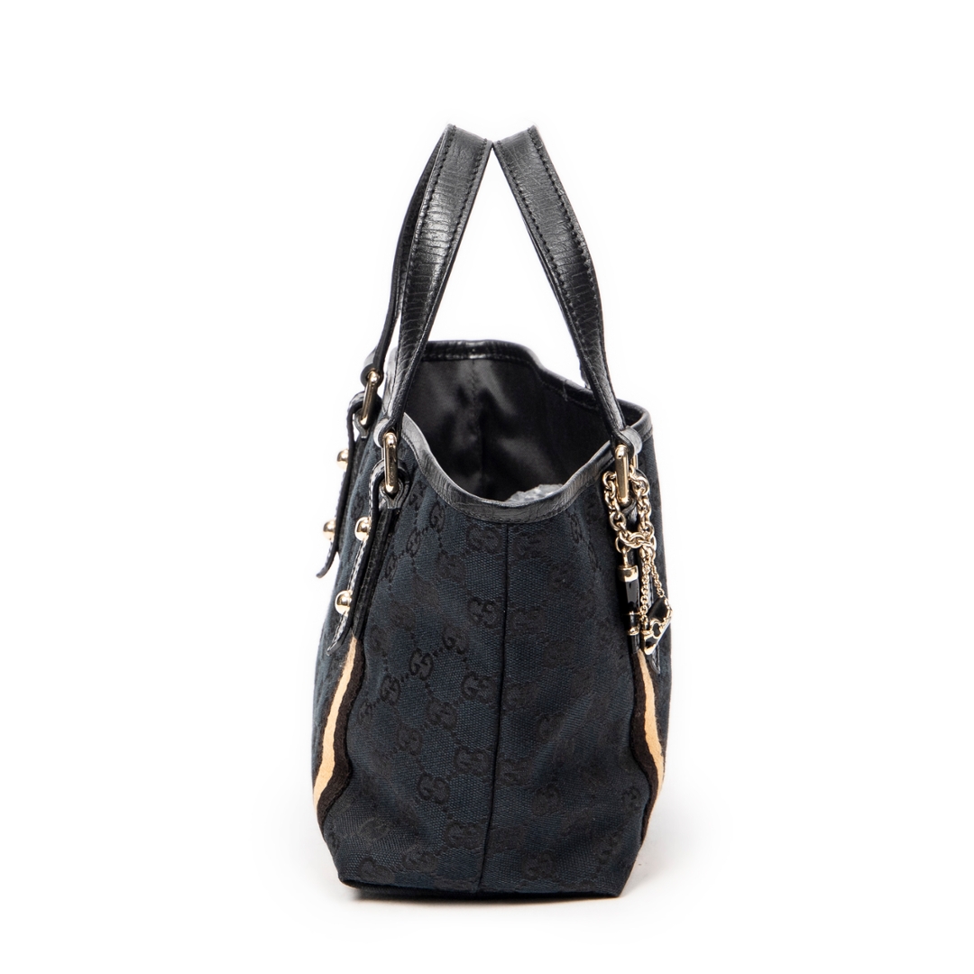 A vintage Gucci black canvas Mini Web Jolicoeur Tote bag, a charming and sophisticated piece that reflects Gucci’s distinctive blend of luxury and practicality. Crafted from the brand’s signature GG monogram canvas, this stylish tote is accented with a classic beige web stripe running down the centre, adding a touch of timeless Gucci flair. The design is further elevated by black leather trim, gold-tone hardware, and a subtle hanging charm that enhances its refined aesthetic.