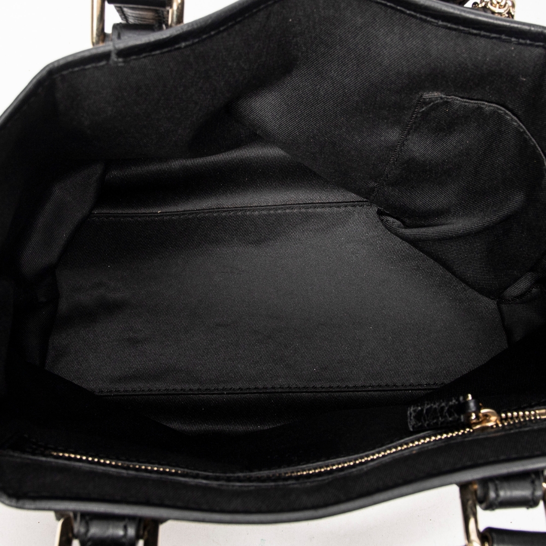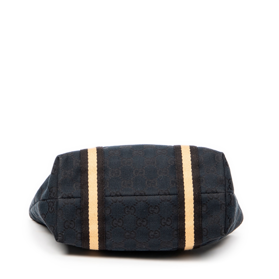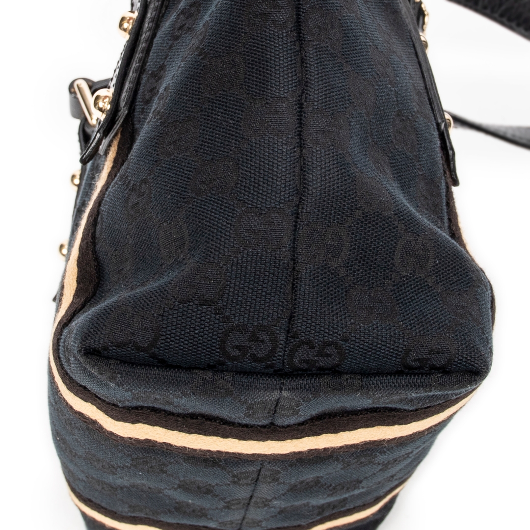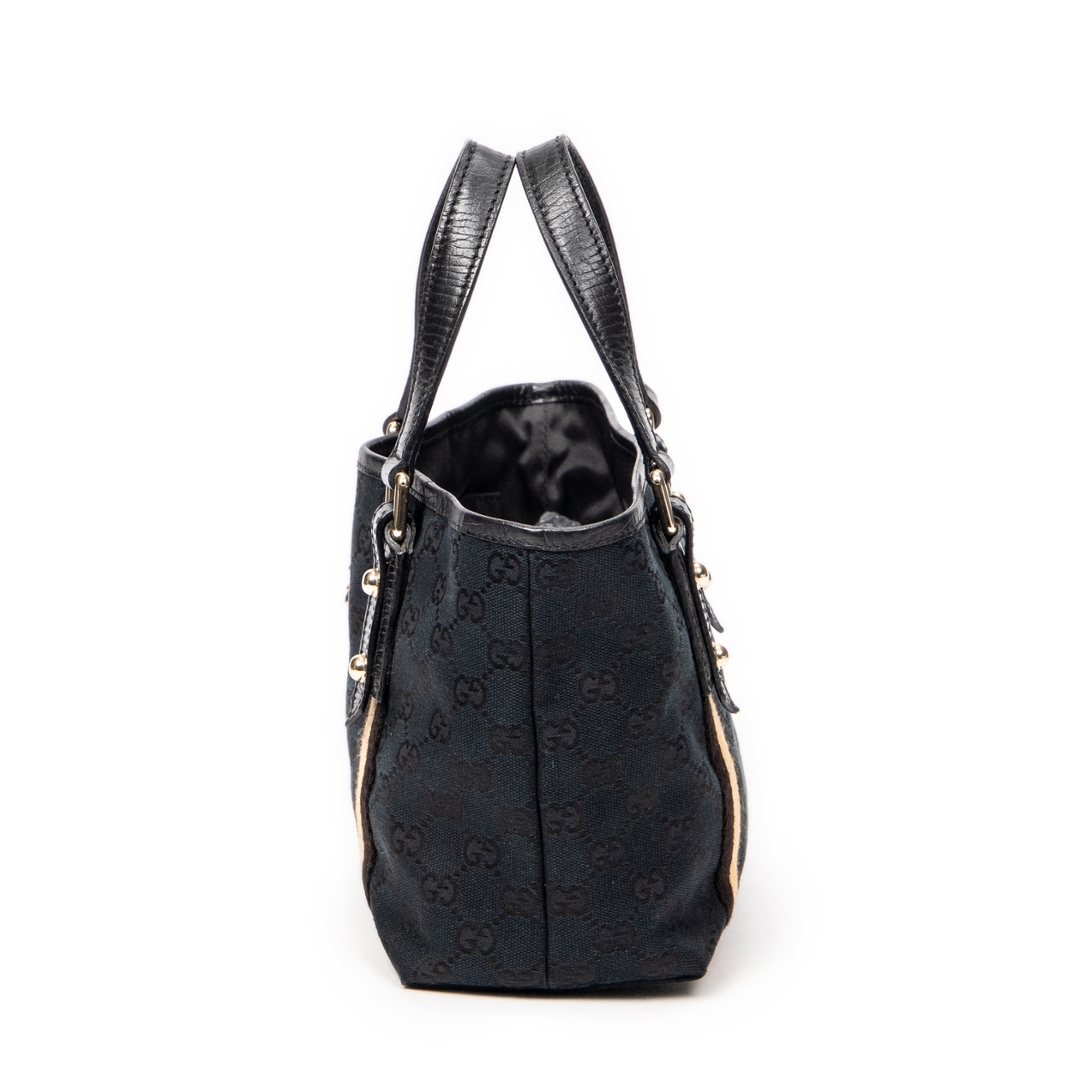 A vintage Gucci black canvas Mini Web Jolicoeur Tote bag, a charming and sophisticated piece that reflects Gucci’s distinctive blend of luxury and practicality. Crafted from the brand’s signature GG monogram canvas, this stylish tote is accented with a classic beige web stripe running down the centre, adding a touch of timeless Gucci flair. The design is further elevated by black leather trim, gold-tone hardware, and a subtle hanging charm that enhances its refined aesthetic.