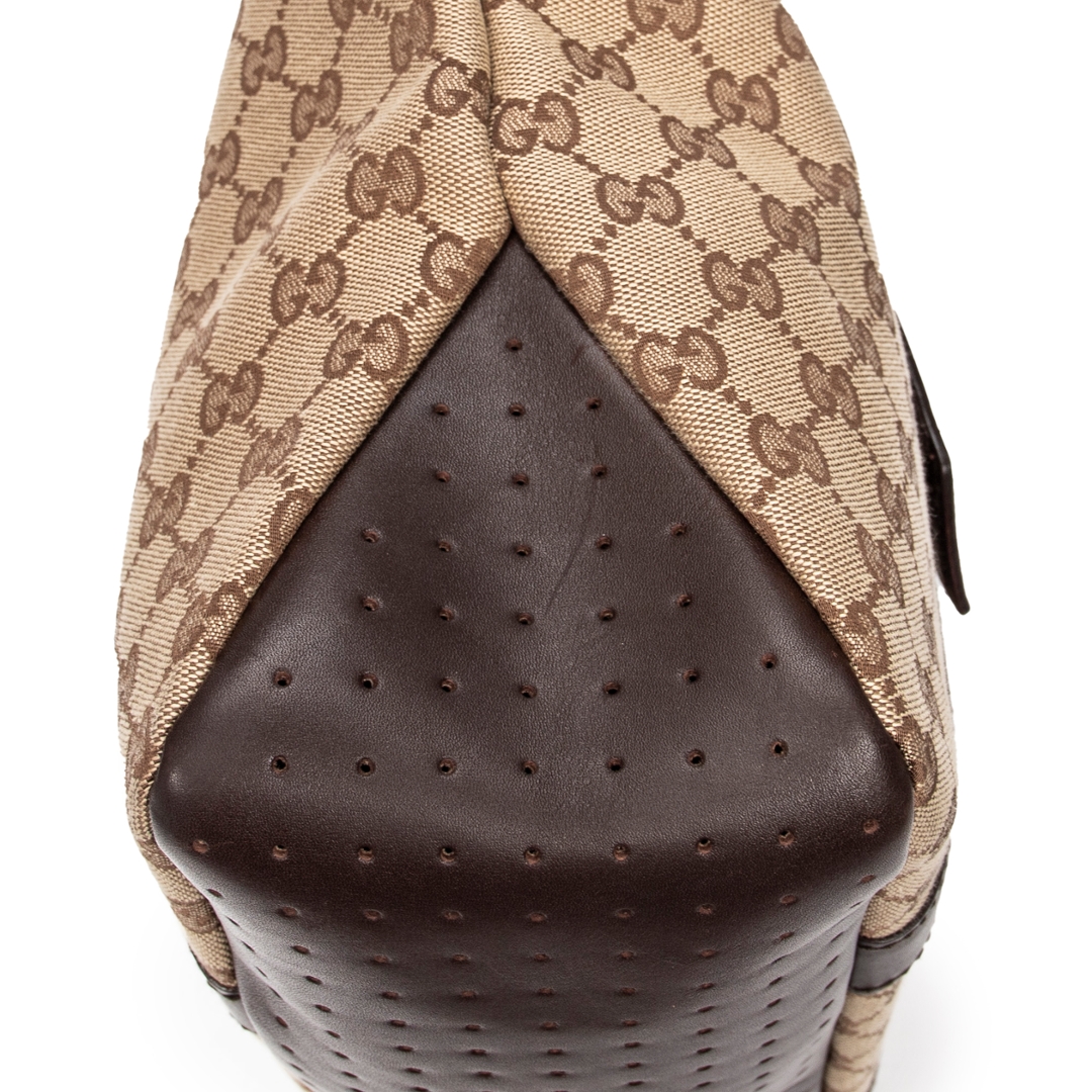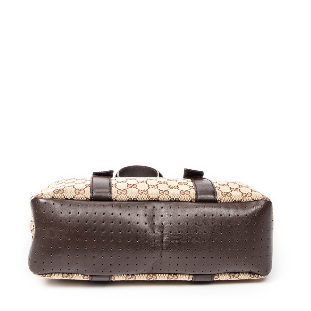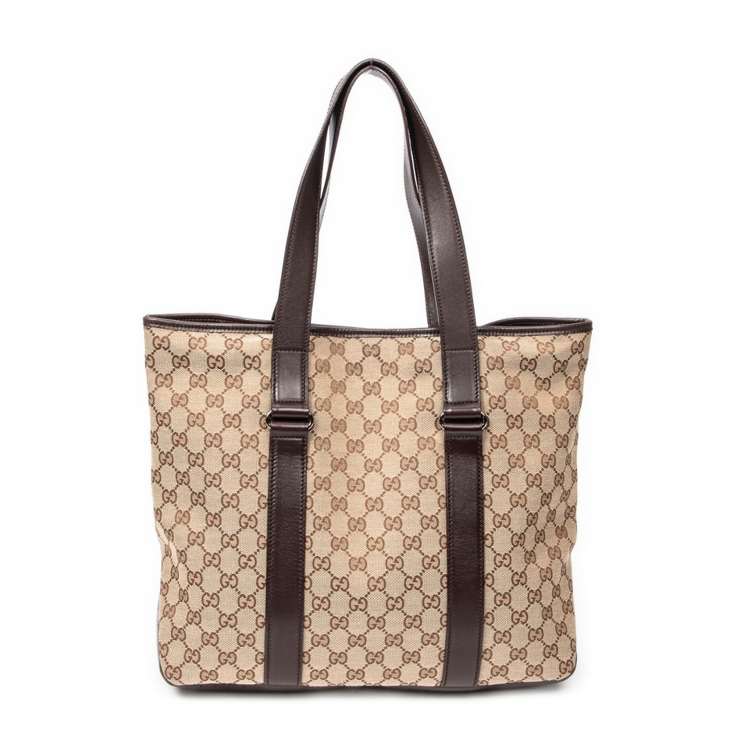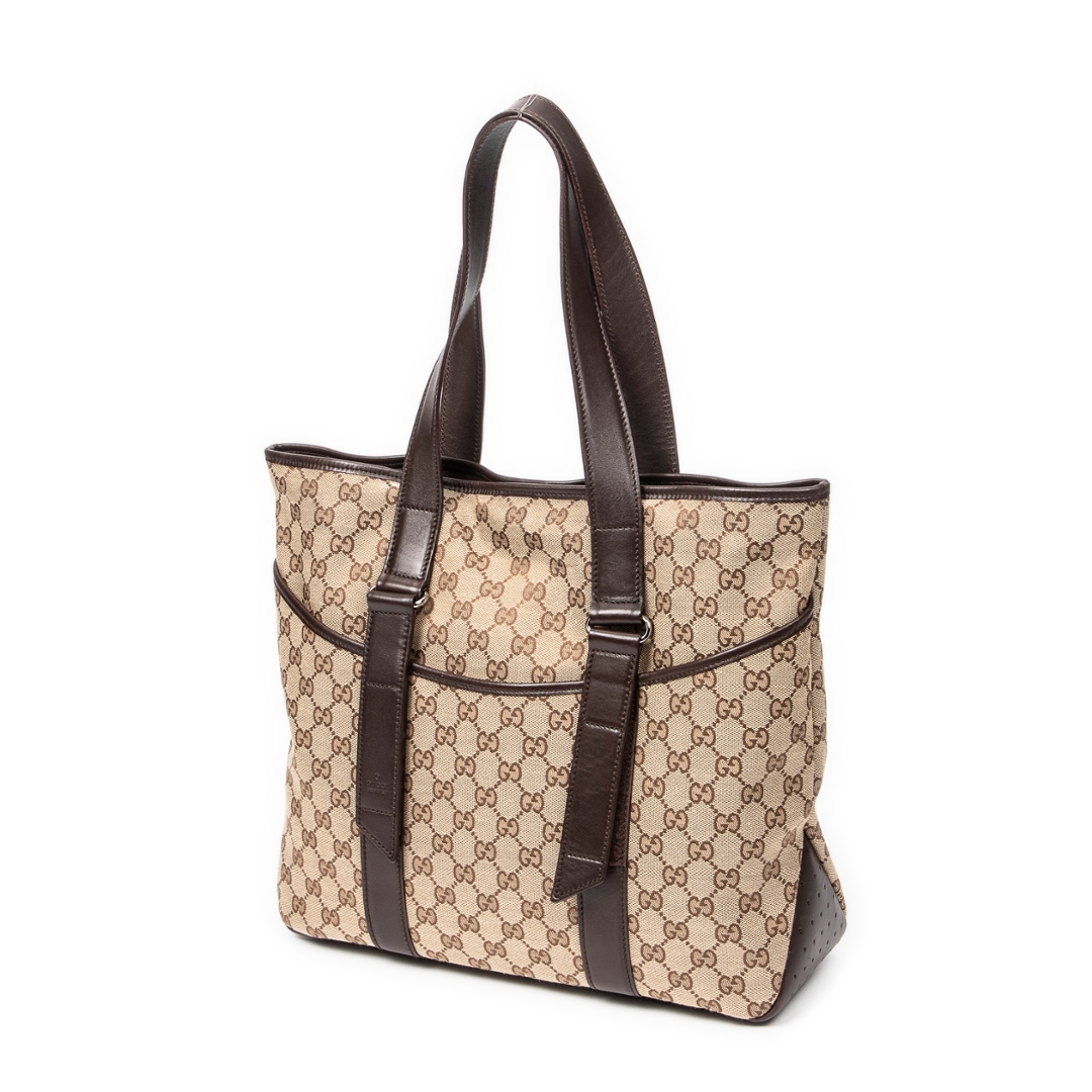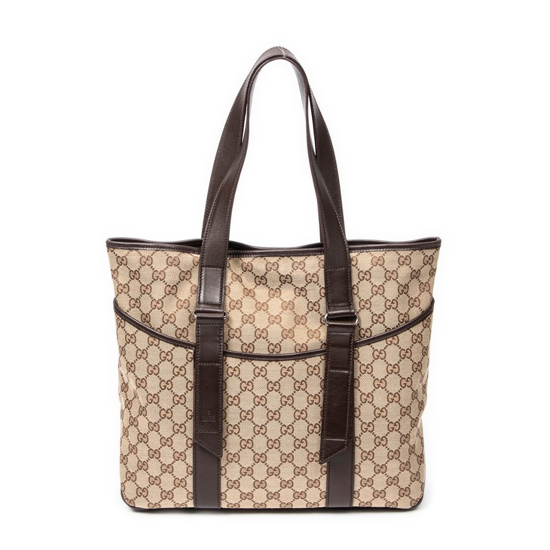A vintage Gucci beige/dark brown canvas Slip Pocket GG Tote bag with a certificate of authenticity, Approximately 30cm height, 35cm width.