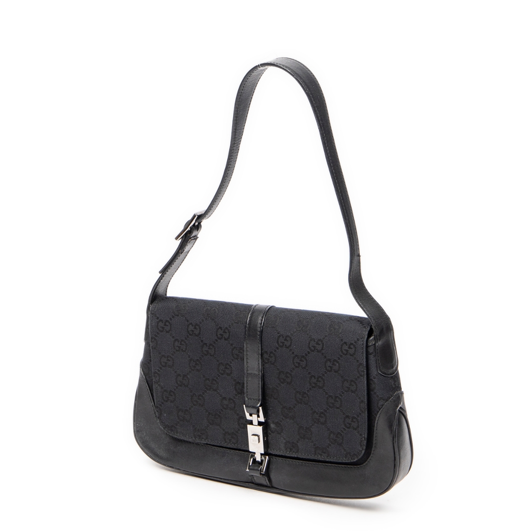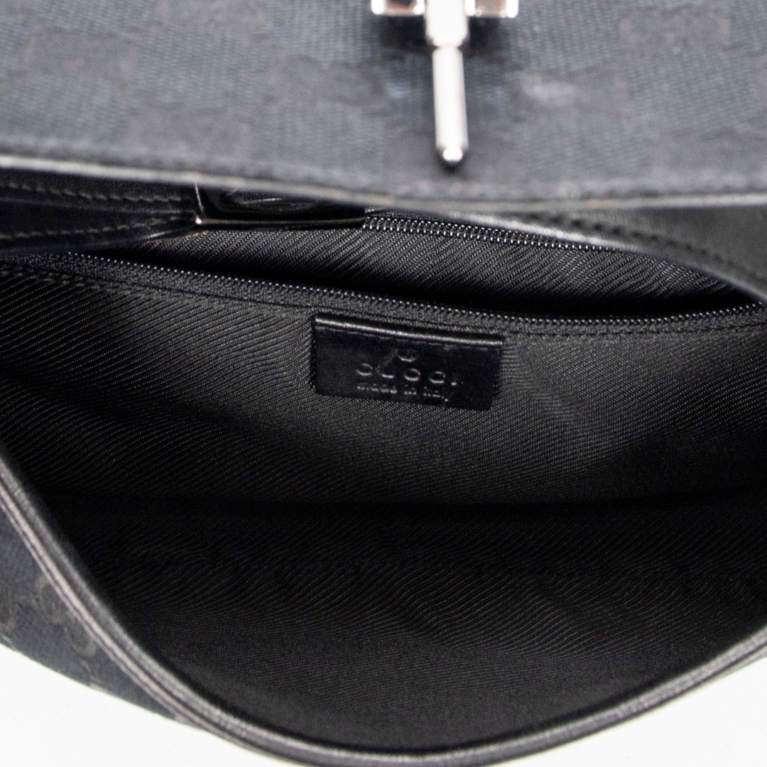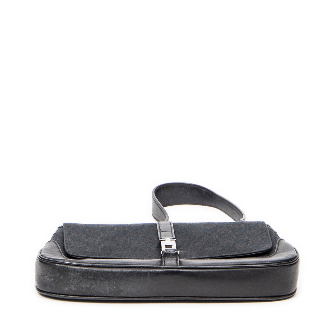 A vintage Gucci black canvas Small Jackie Flap bag, an effortlessly chic piece that embodies the understated sophistication for which Gucci is renowned. Crafted in the brand’s signature GG monogram canvas, this elegant shoulder bag features smooth black leather trim and the iconic piston clasp — a defining detail of the Jackie line that reflects Gucci’s timeless heritage. The sleek flap closure and curved silhouette lend the piece a refined yet versatile appeal, ideal for both day and evening wear.