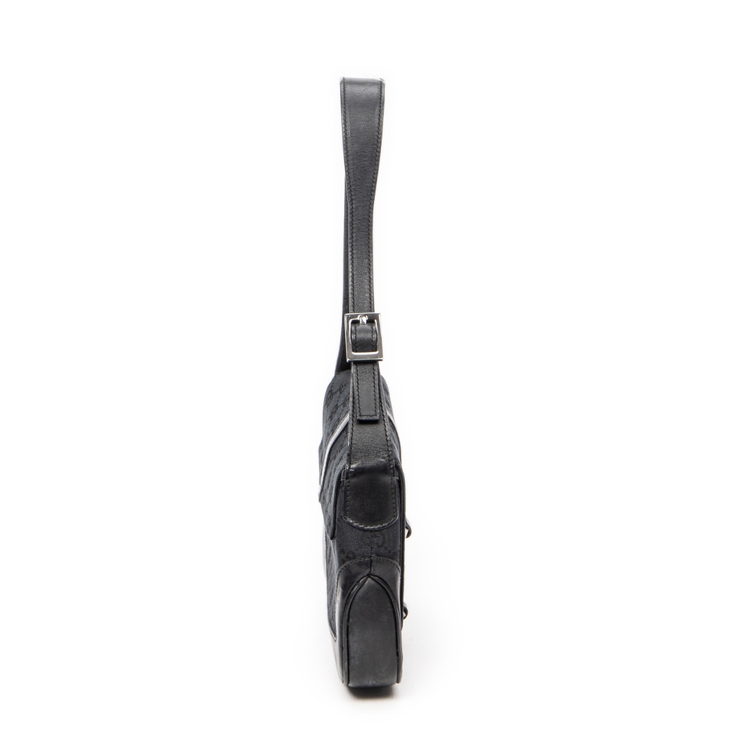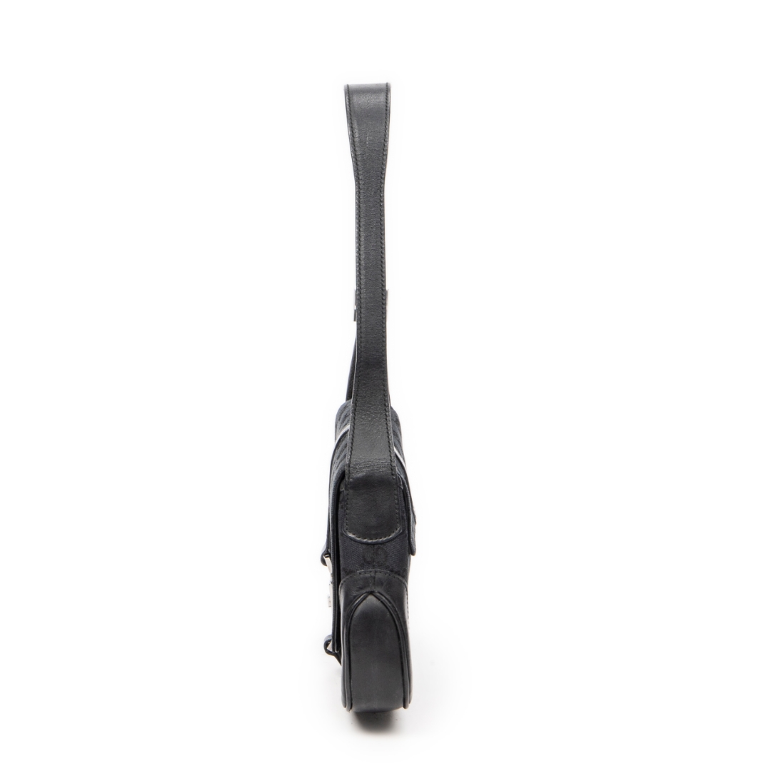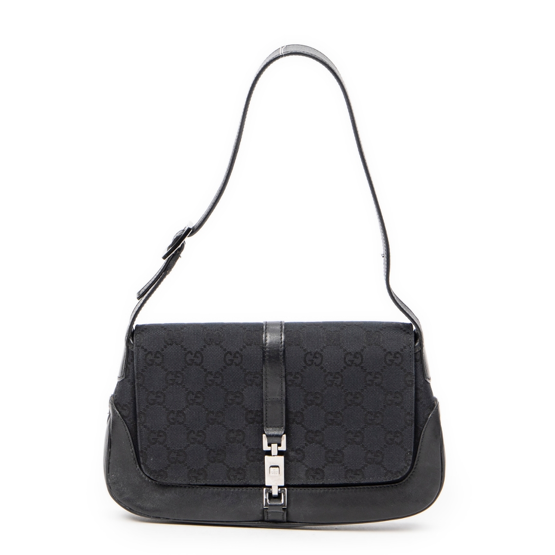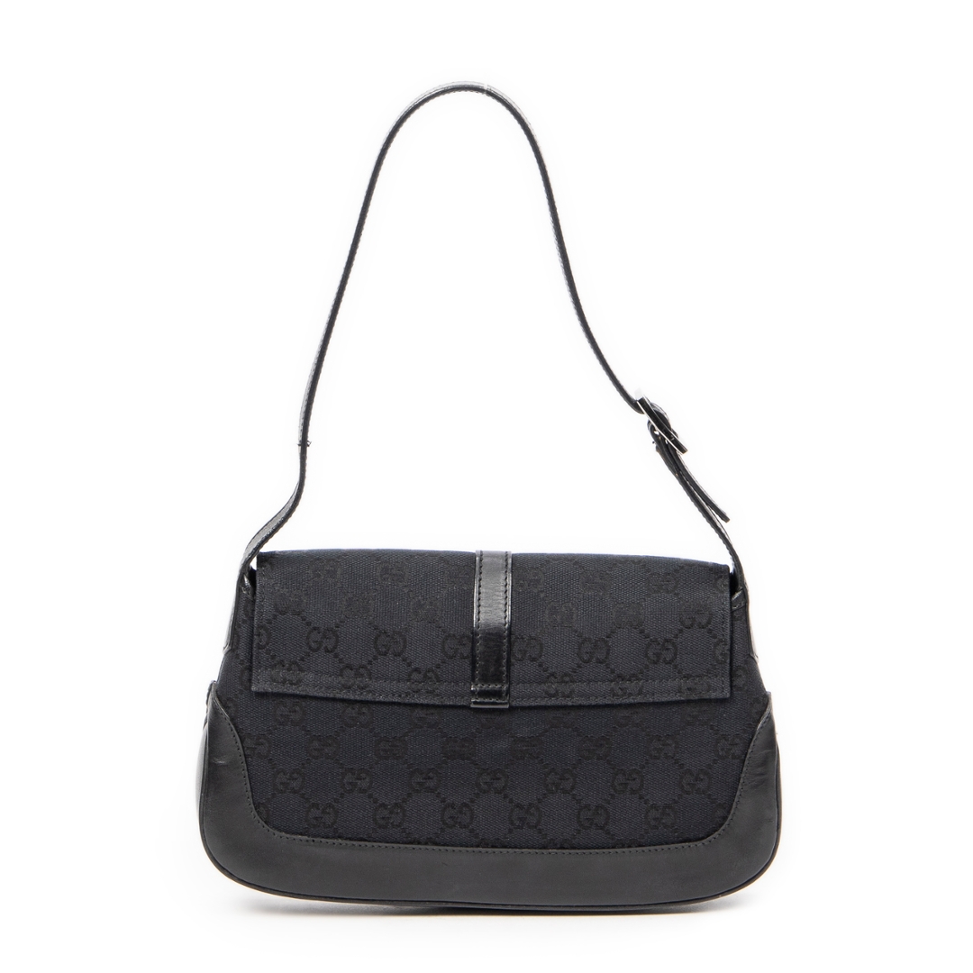 A vintage Gucci black canvas Small Jackie Flap bag, an effortlessly chic piece that embodies the understated sophistication for which Gucci is renowned. Crafted in the brand’s signature GG monogram canvas, this elegant shoulder bag features smooth black leather trim and the iconic piston clasp — a defining detail of the Jackie line that reflects Gucci’s timeless heritage. The sleek flap closure and curved silhouette lend the piece a refined yet versatile appeal, ideal for both day and evening wear.