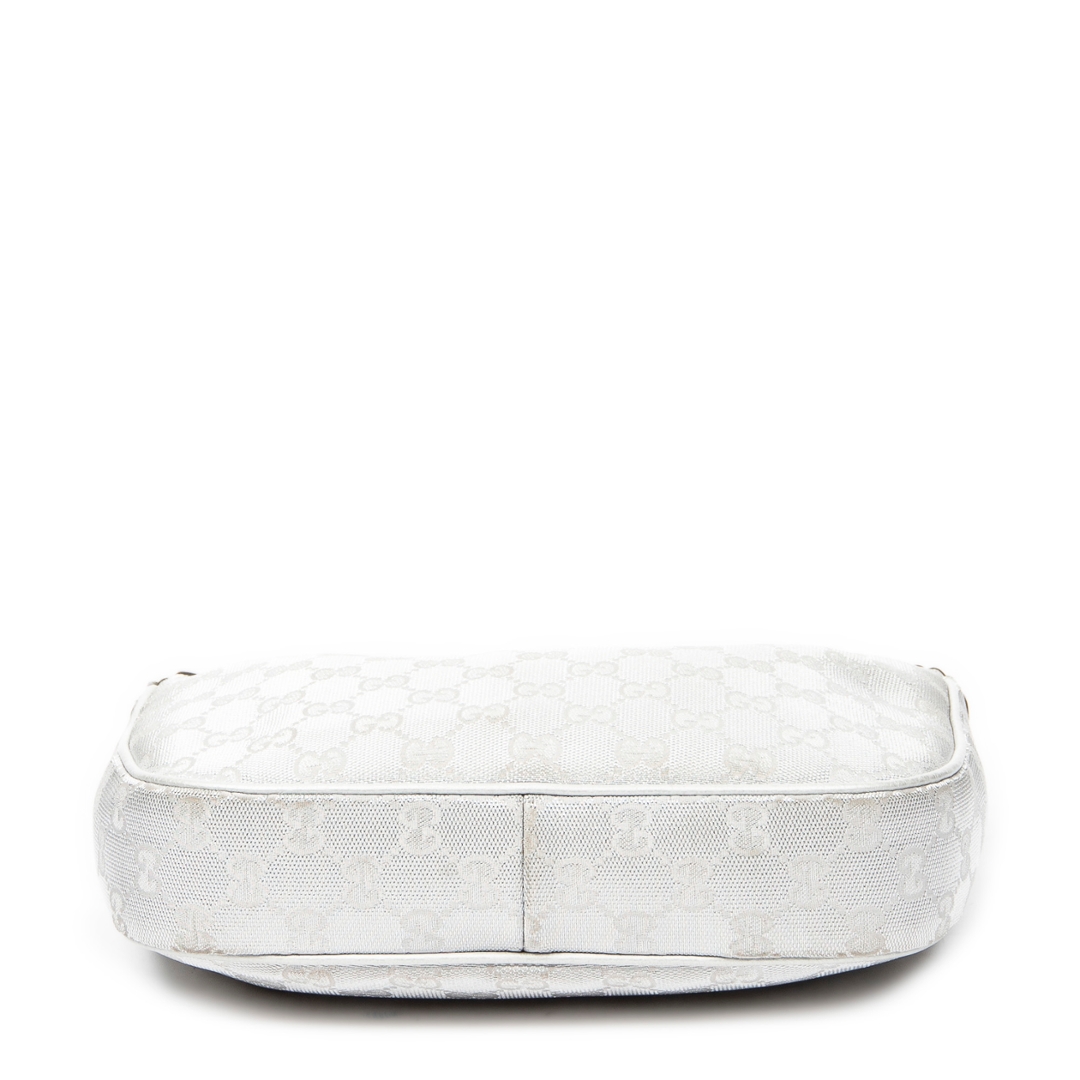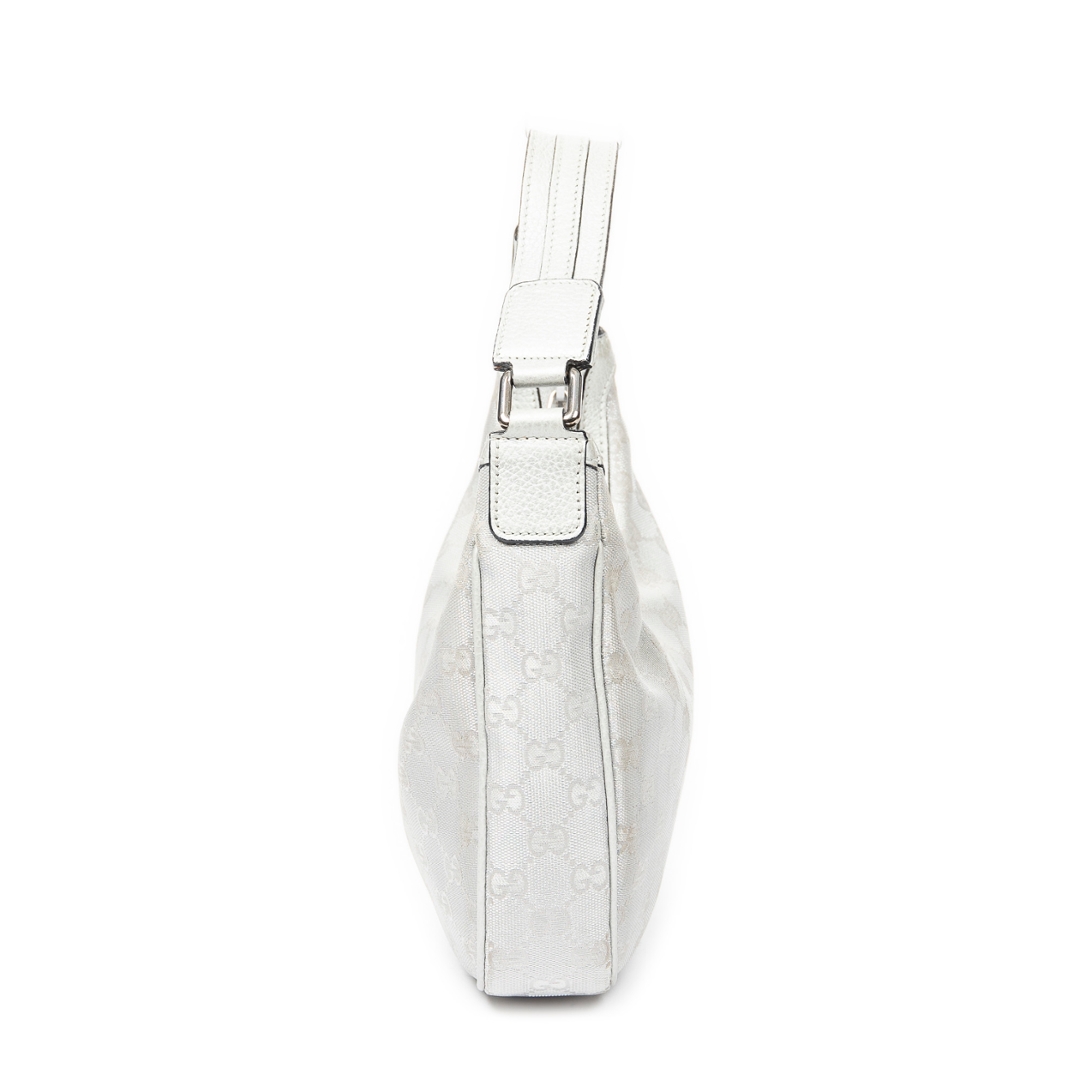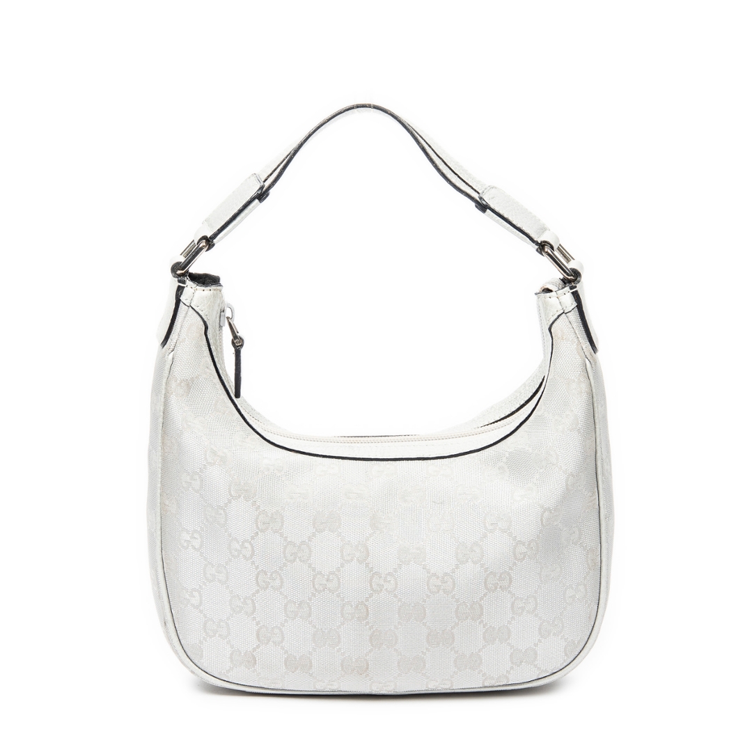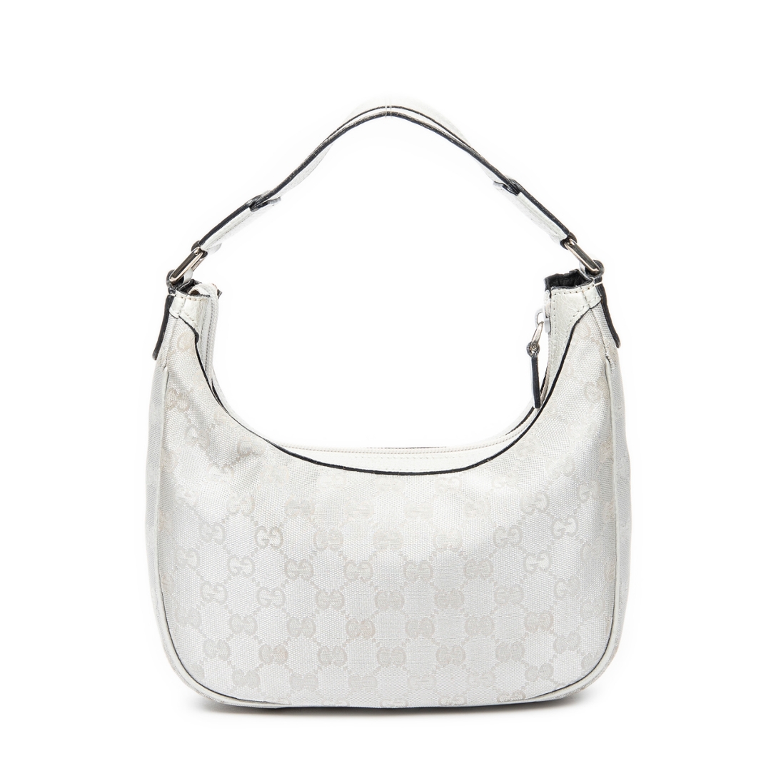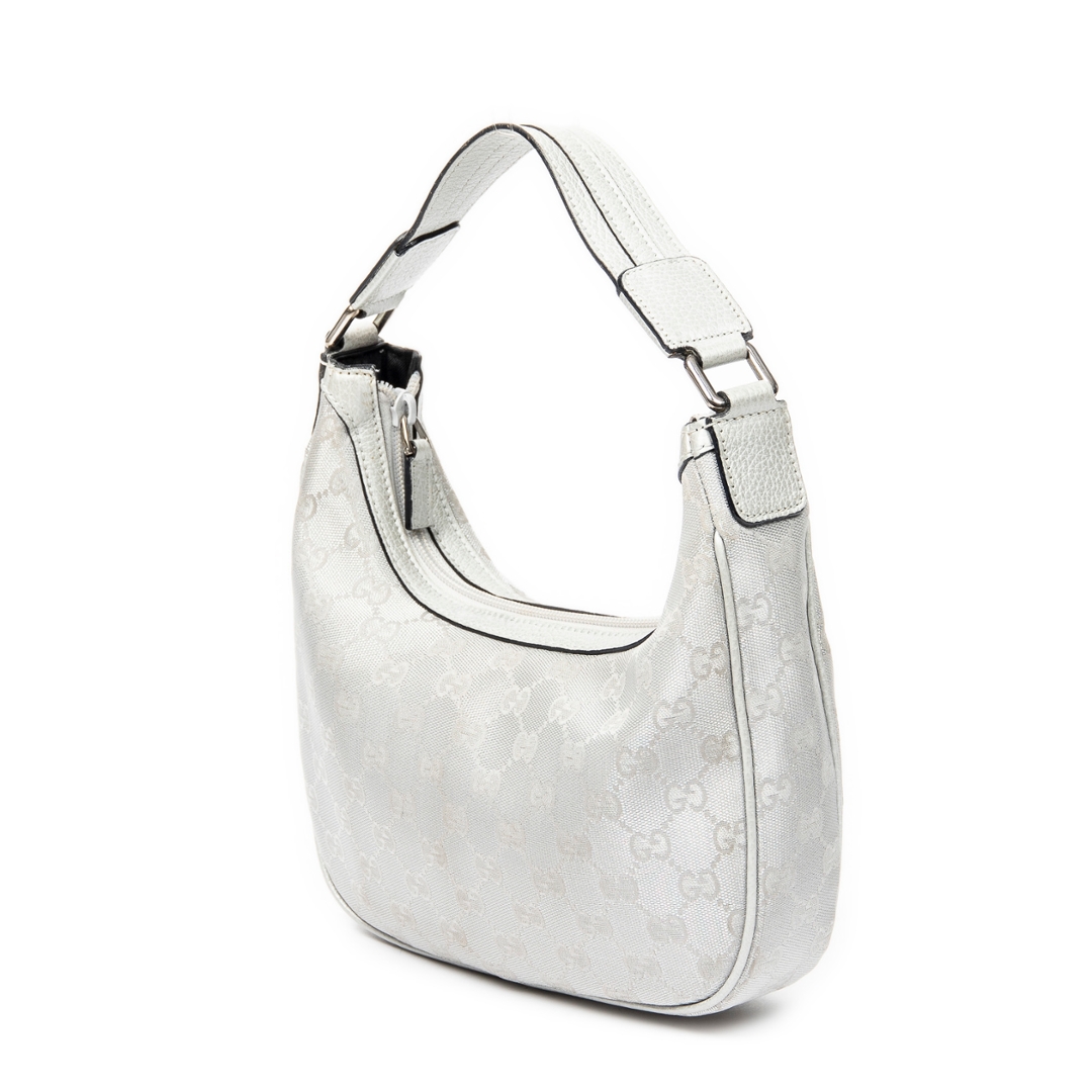 A vintage Gucci silver canvas Small Zip Hobo bag, a refined and contemporary take on one of Gucci’s most beloved silhouettes. Crafted from shimmering silver canvas embossed with the iconic GG monogram, this elegant piece captures the perfect balance of luxury and modern design. The soft, curved shape is complemented by smooth silver leather trim and a single structured handle, creating a look that’s both chic and understated.