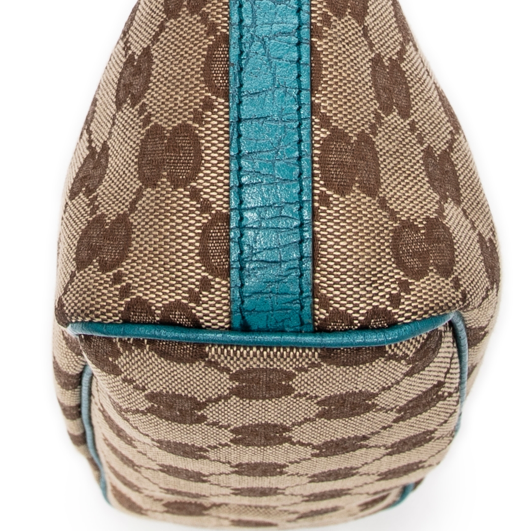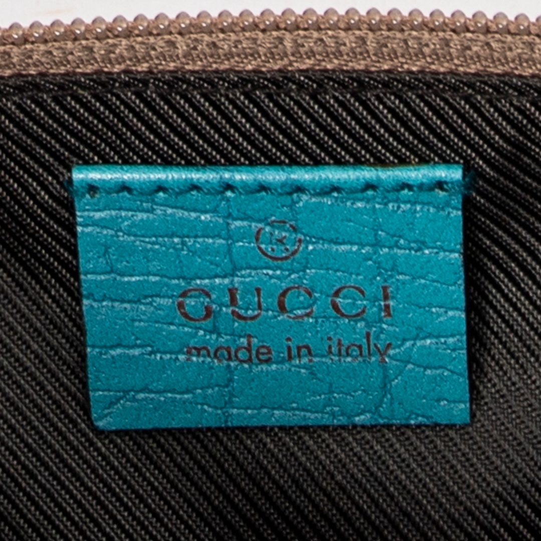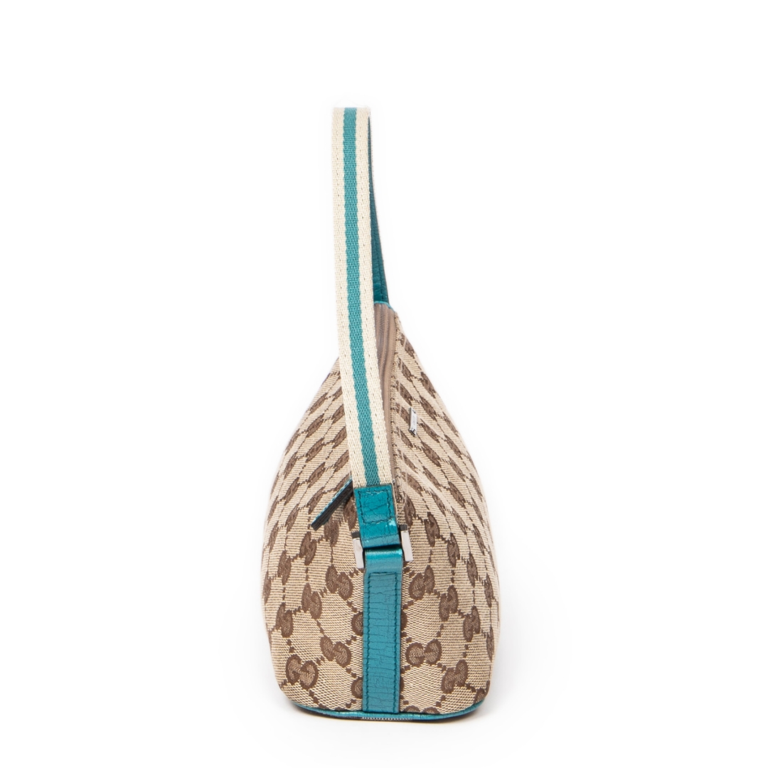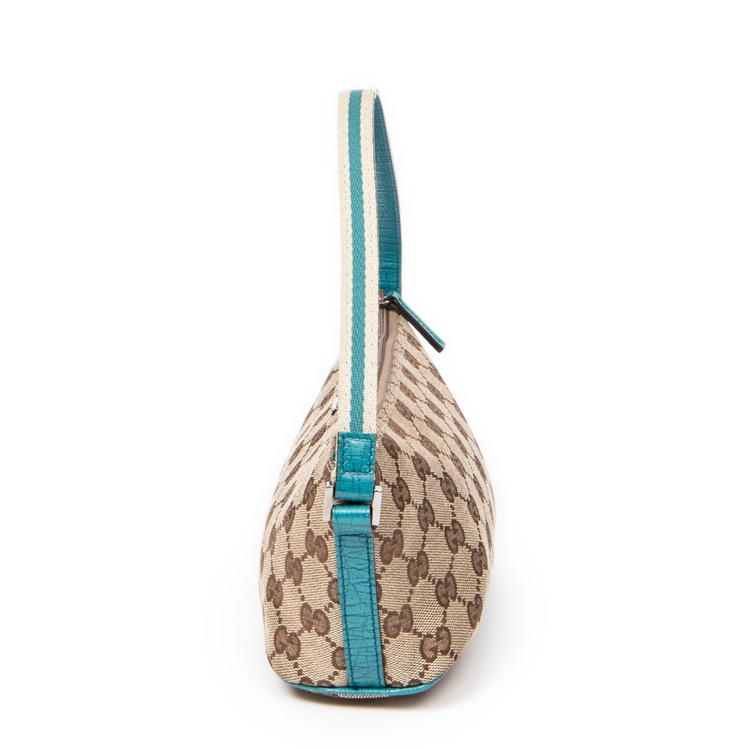 A vintage Gucci beige/teal canvas Web Boat Pochette bag with a certificate of authenticity, Approximately 10cm height, 22cm width.