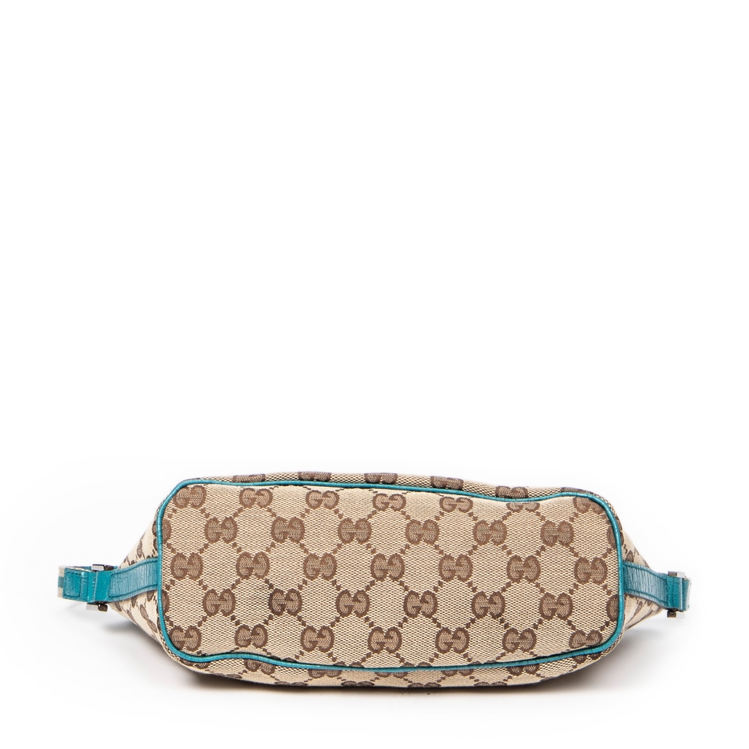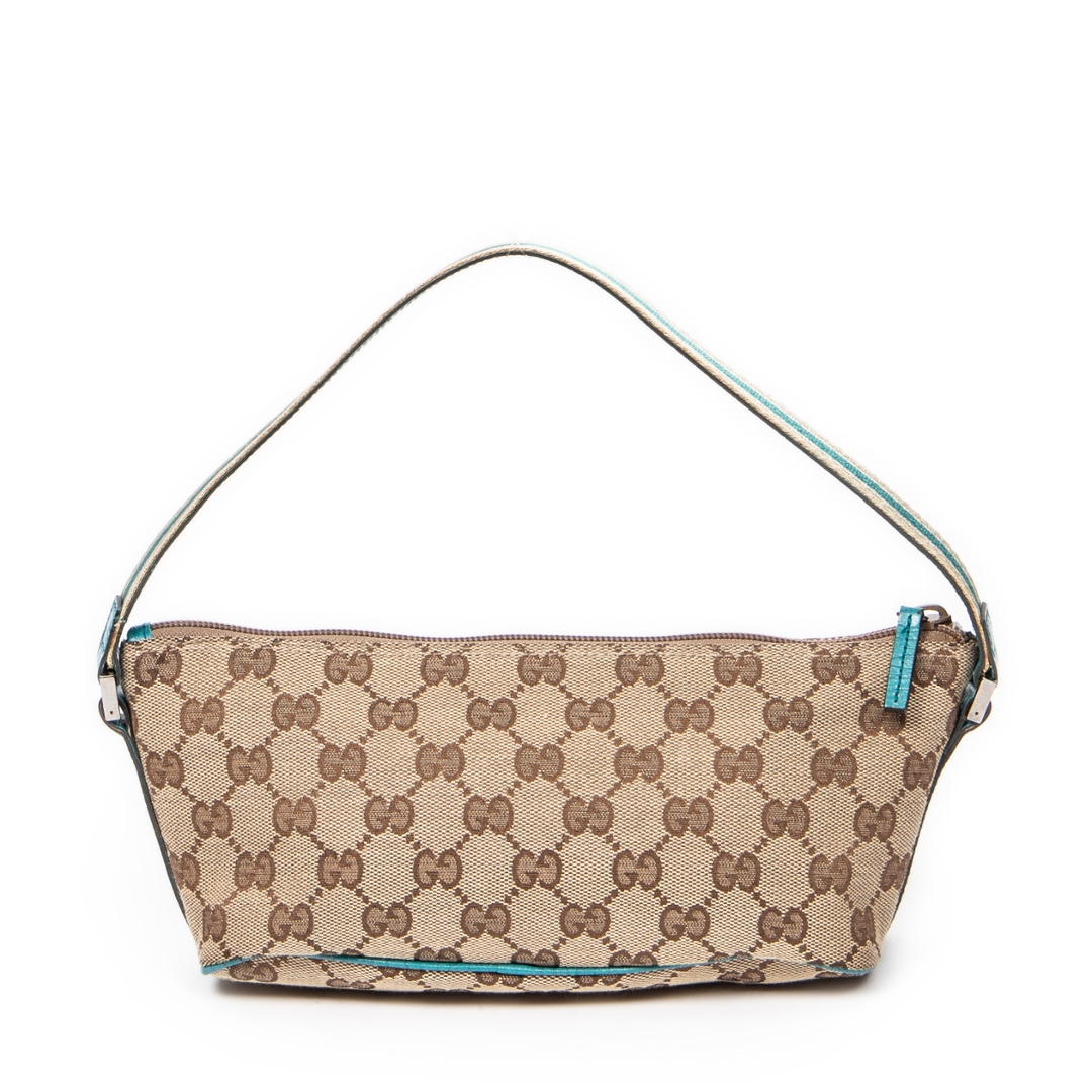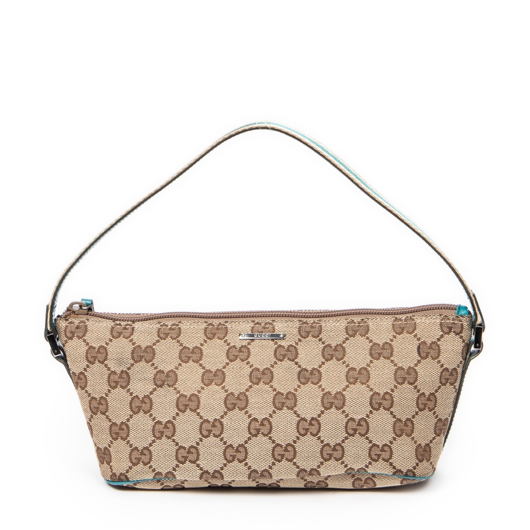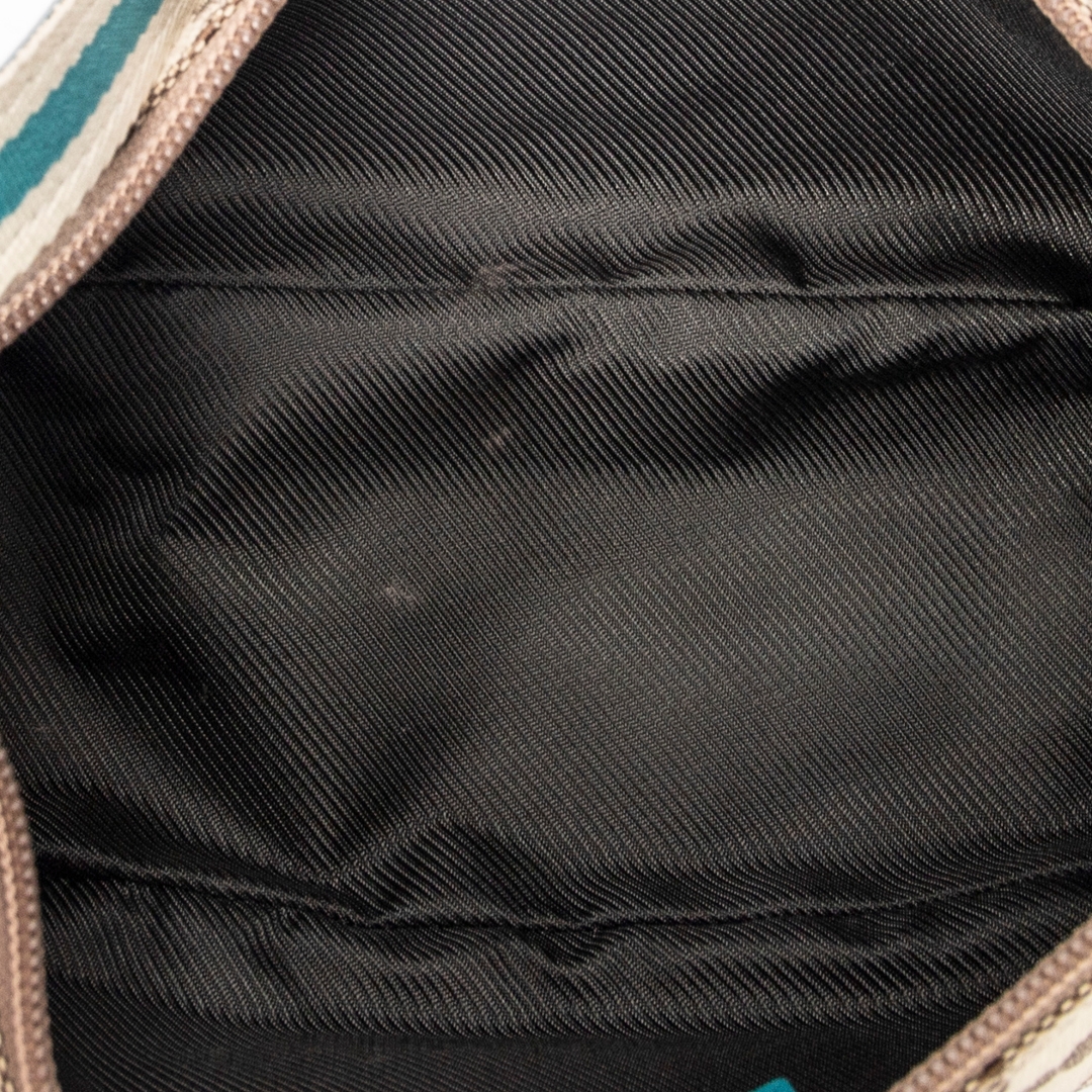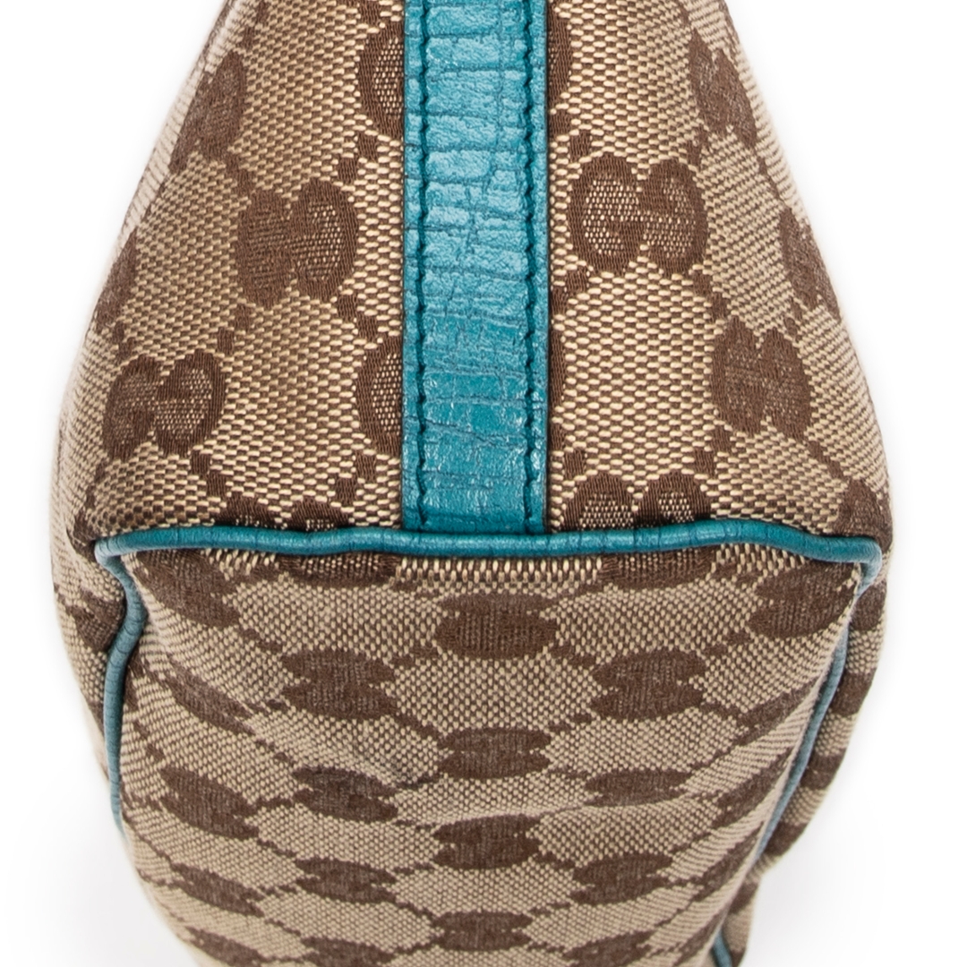 A vintage Gucci beige/teal canvas Web Boat Pochette bag with a certificate of authenticity, Approximately 10cm height, 22cm width.