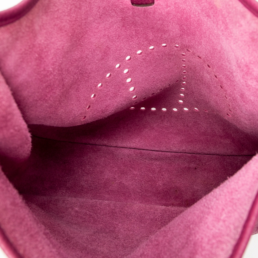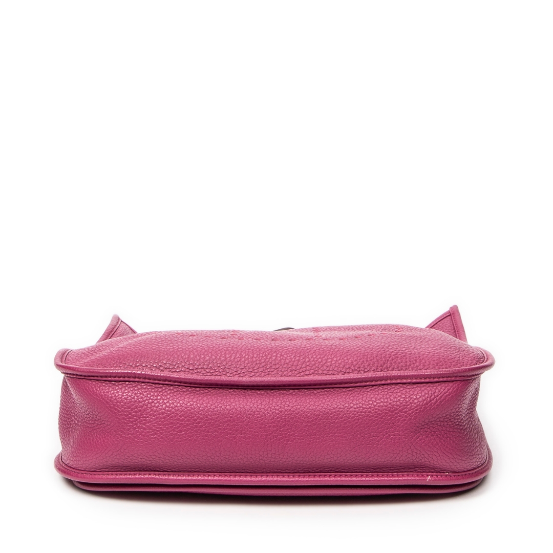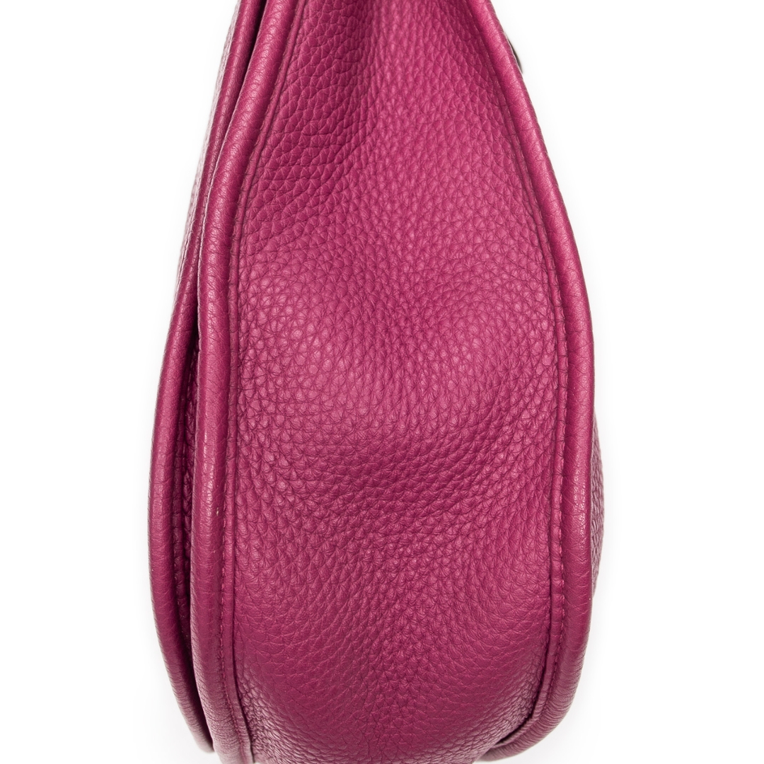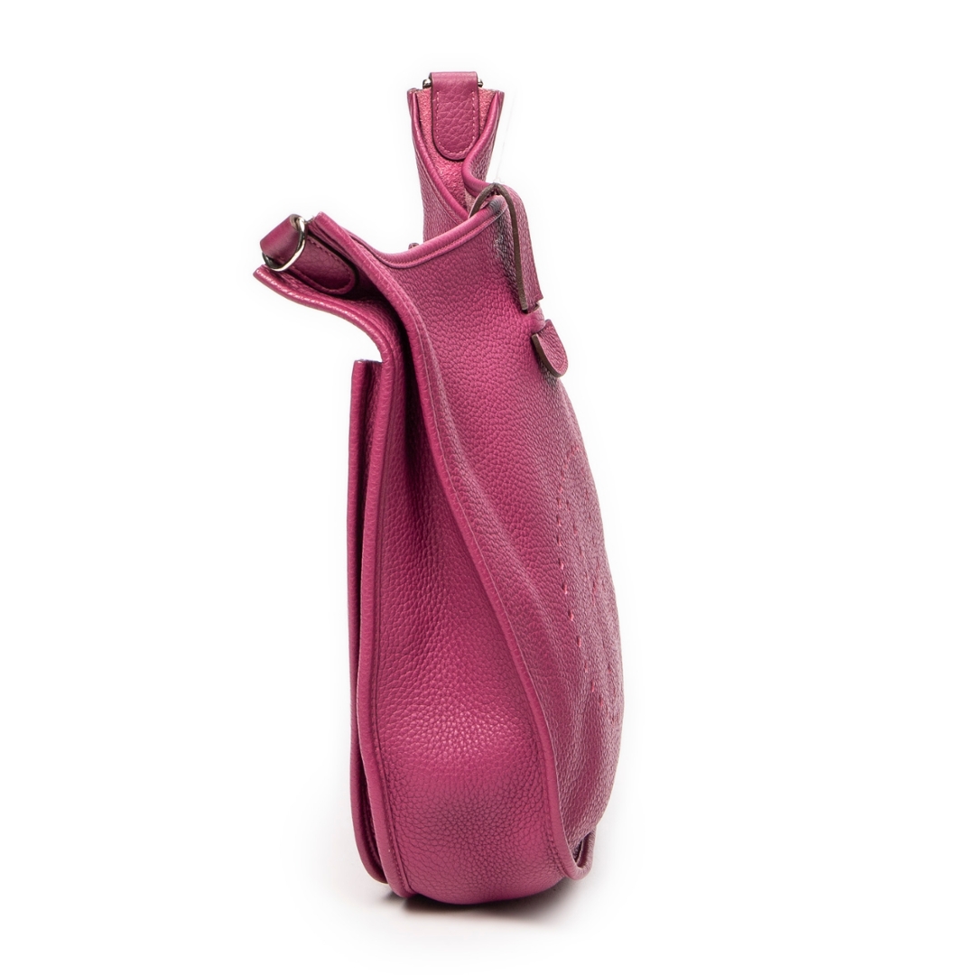 A Hermès Evelyne III bag crafted in rich anemone Clemence calf leather, showcasing the house’s iconic perforated “H” logo to the front. The softly structured silhouette is complemented by refined leather trim and palladium-tone hardware, while the deep pink-purple hue delivers a bold yet elegant presence. The natural grain of Clemence leather enhances both durability and texture, reinforcing its luxurious appeal.