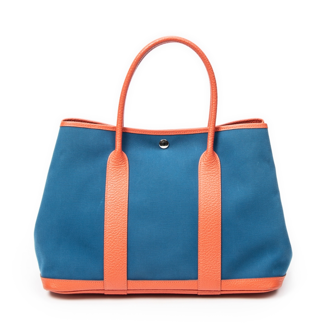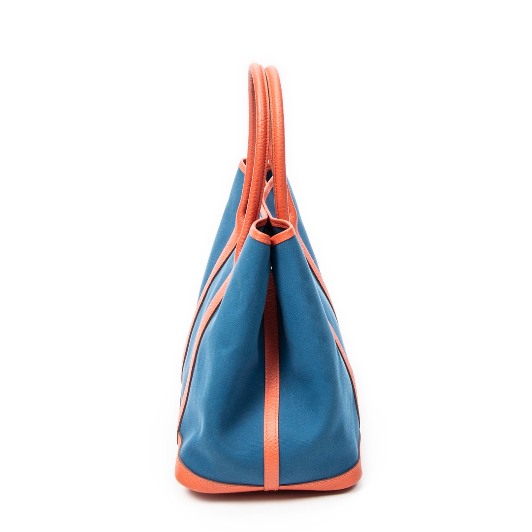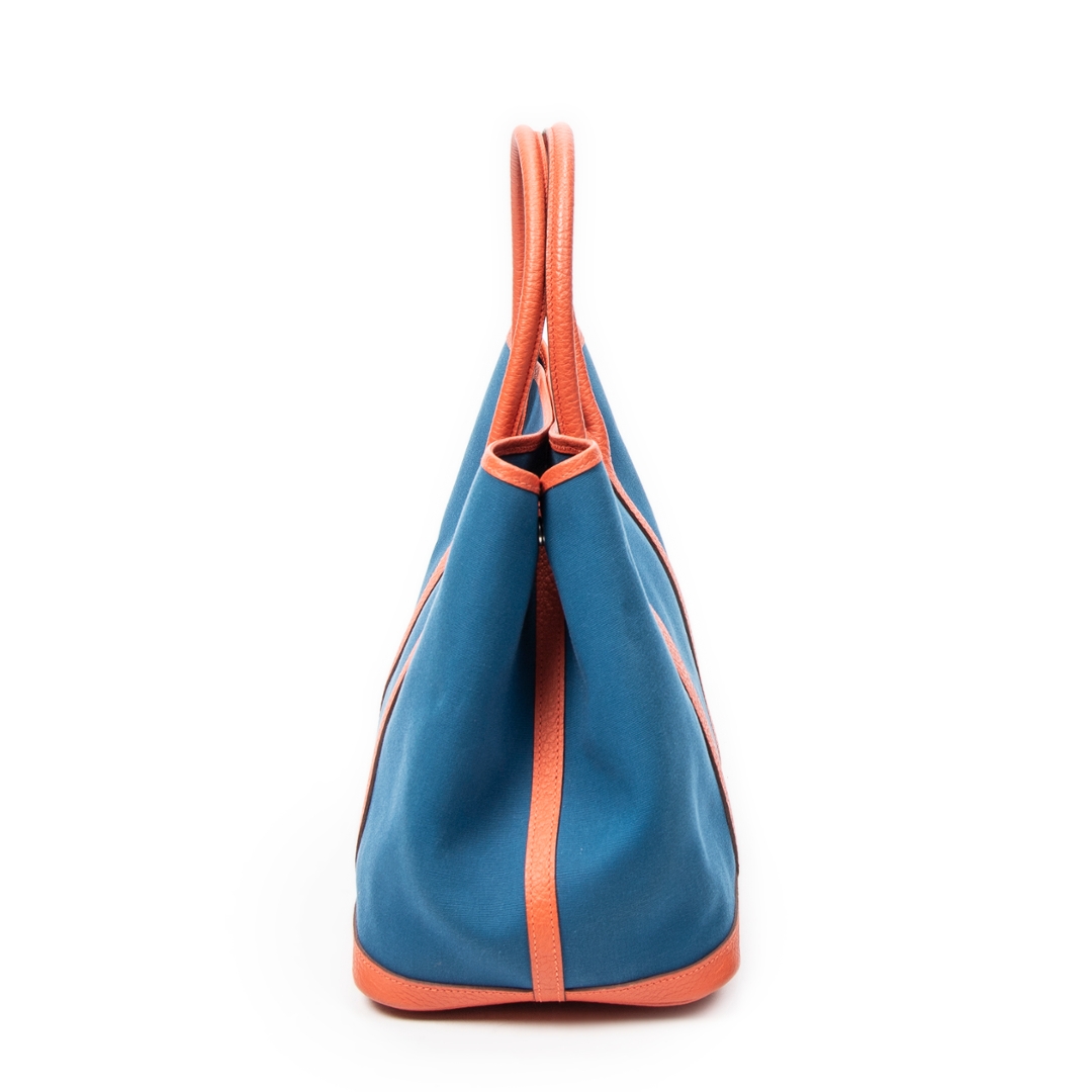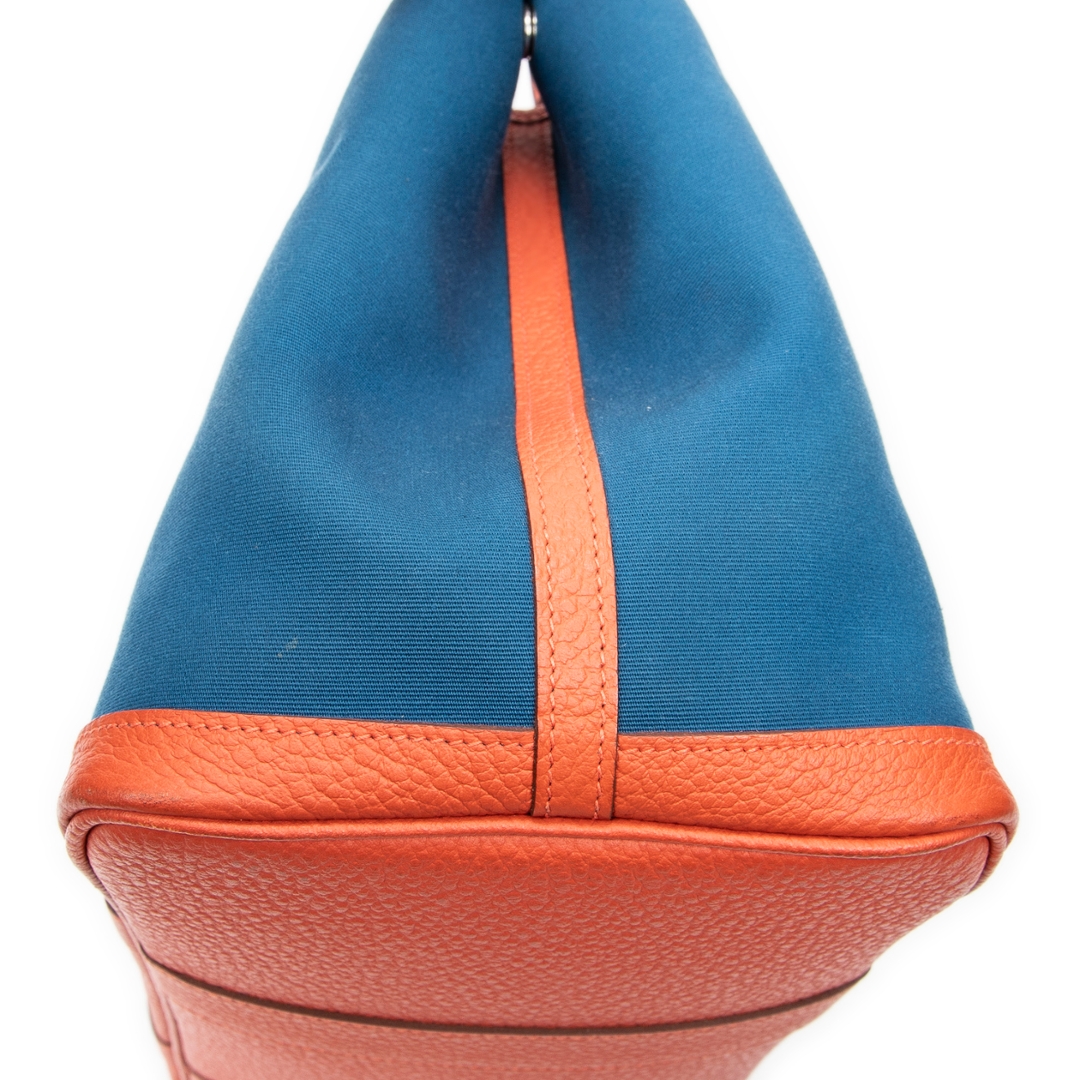 A vintage Hermes Bleu Outremer/Capucine Canvas Garden Party bag with a certificate of authenticity, Approx 25cm height, 36cm width.
