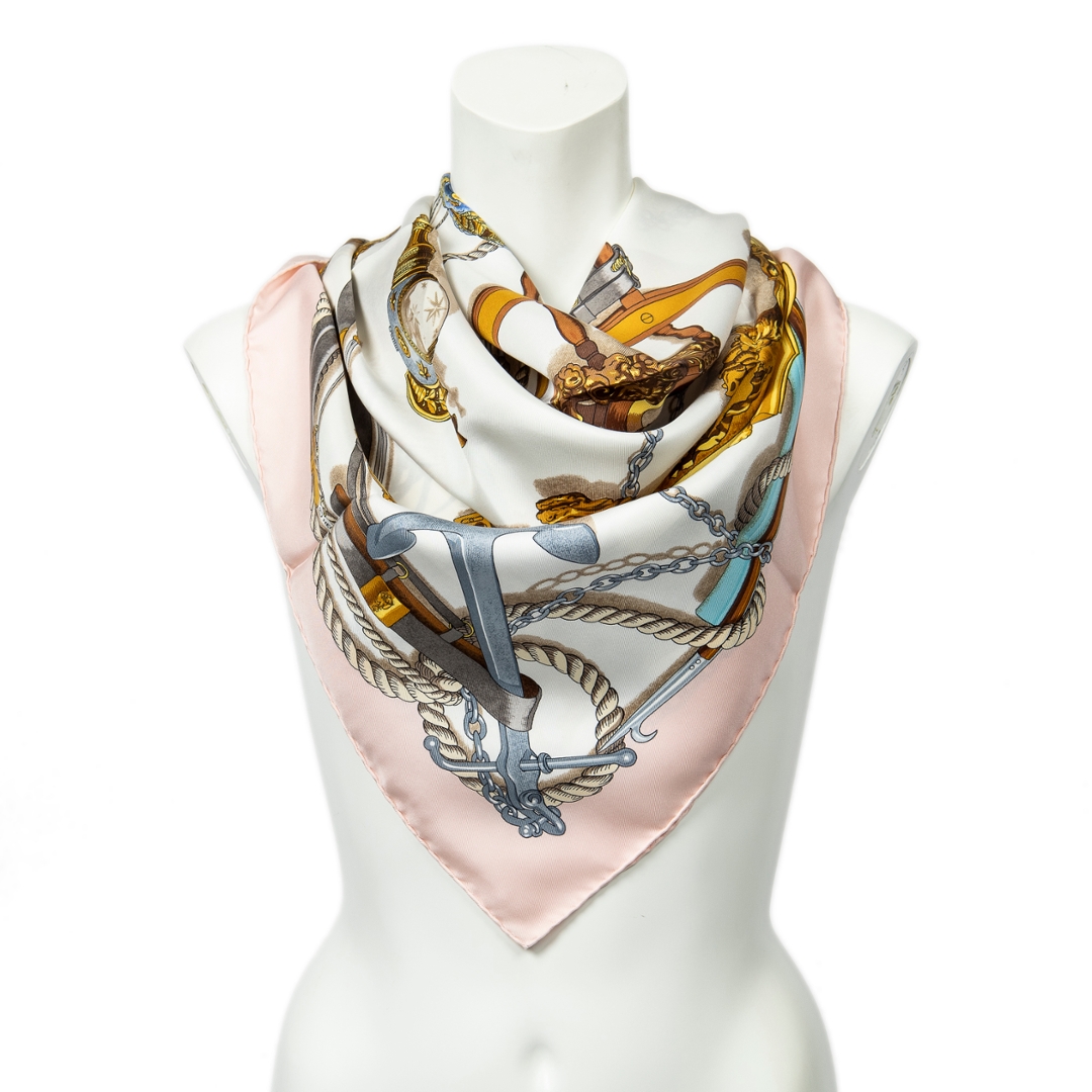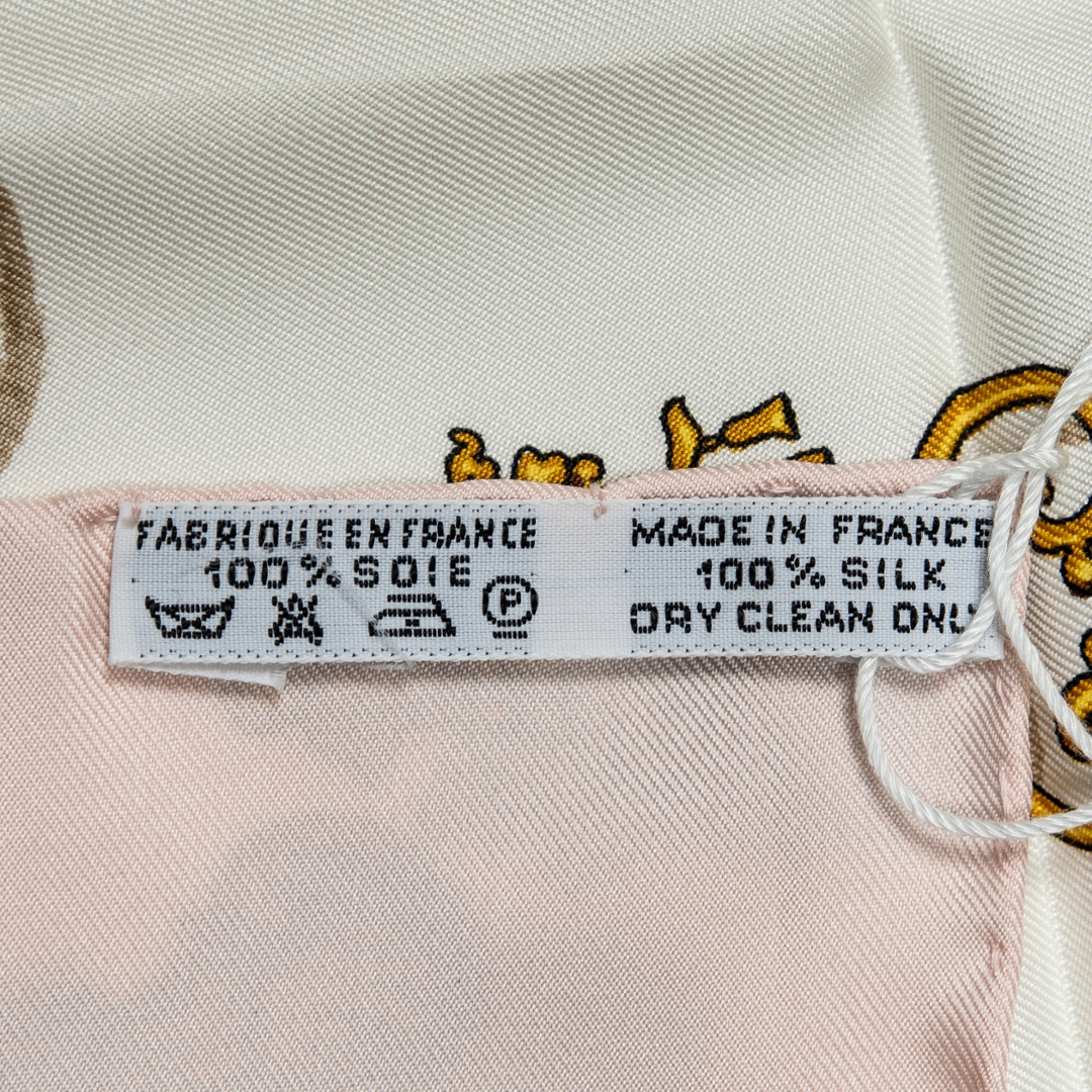 Accompanied by its certificate of authenticity, this Grade AA example is in excellent condition, showing only the lightest signs of careful use. A timeless and feminine piece, the Hermès pink and gold silk scarf is both a versatile accessory and a work of art, making it a coveted addition for collectors and a luxurious choice for those who appreciate enduring French elegance.