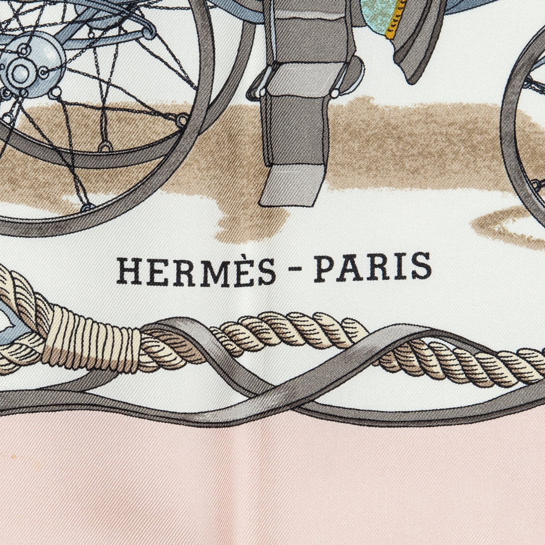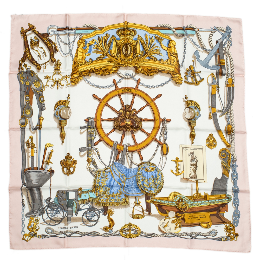 A vintage Hermès pink and gold silk scarf for the collector who values refined elegance and exceptional craftsmanship. Hermès is celebrated worldwide for its exquisite silk creations, and this piece beautifully showcases that heritage. The design features equestrian-inspired motifs in gold, silver, and soft blue tones, set against a crisp white background with a delicate pink border, creating a balanced and graceful composition.