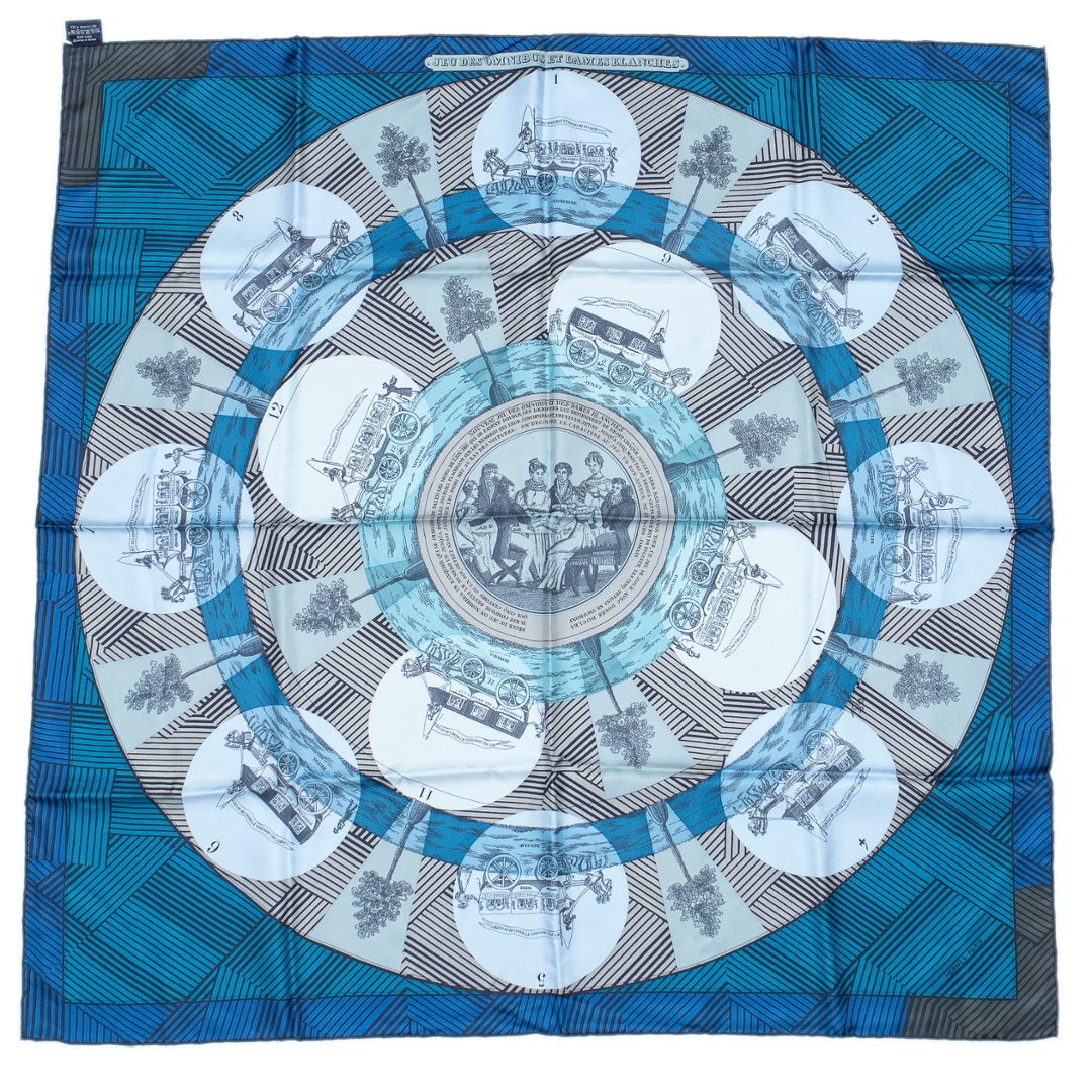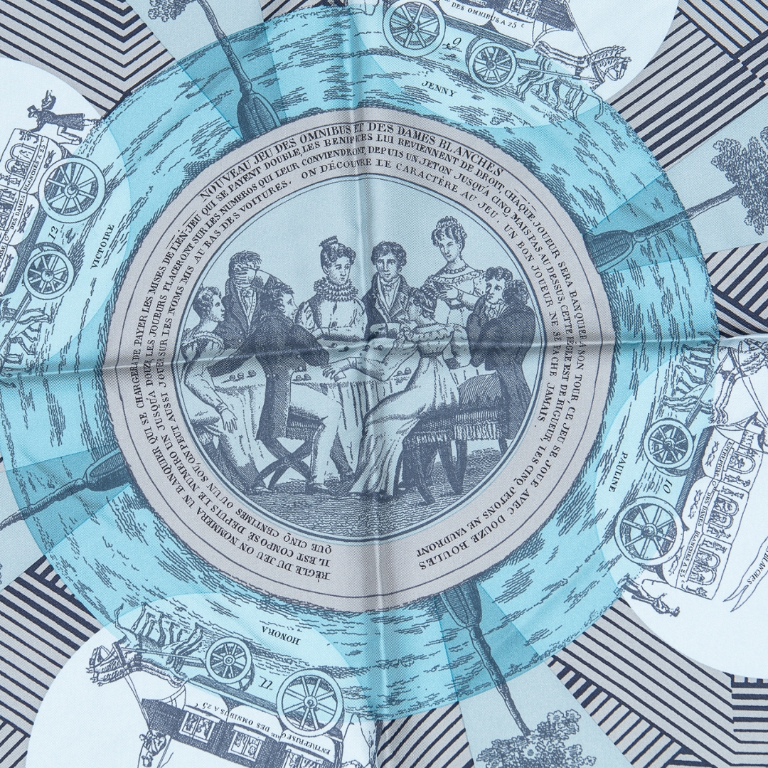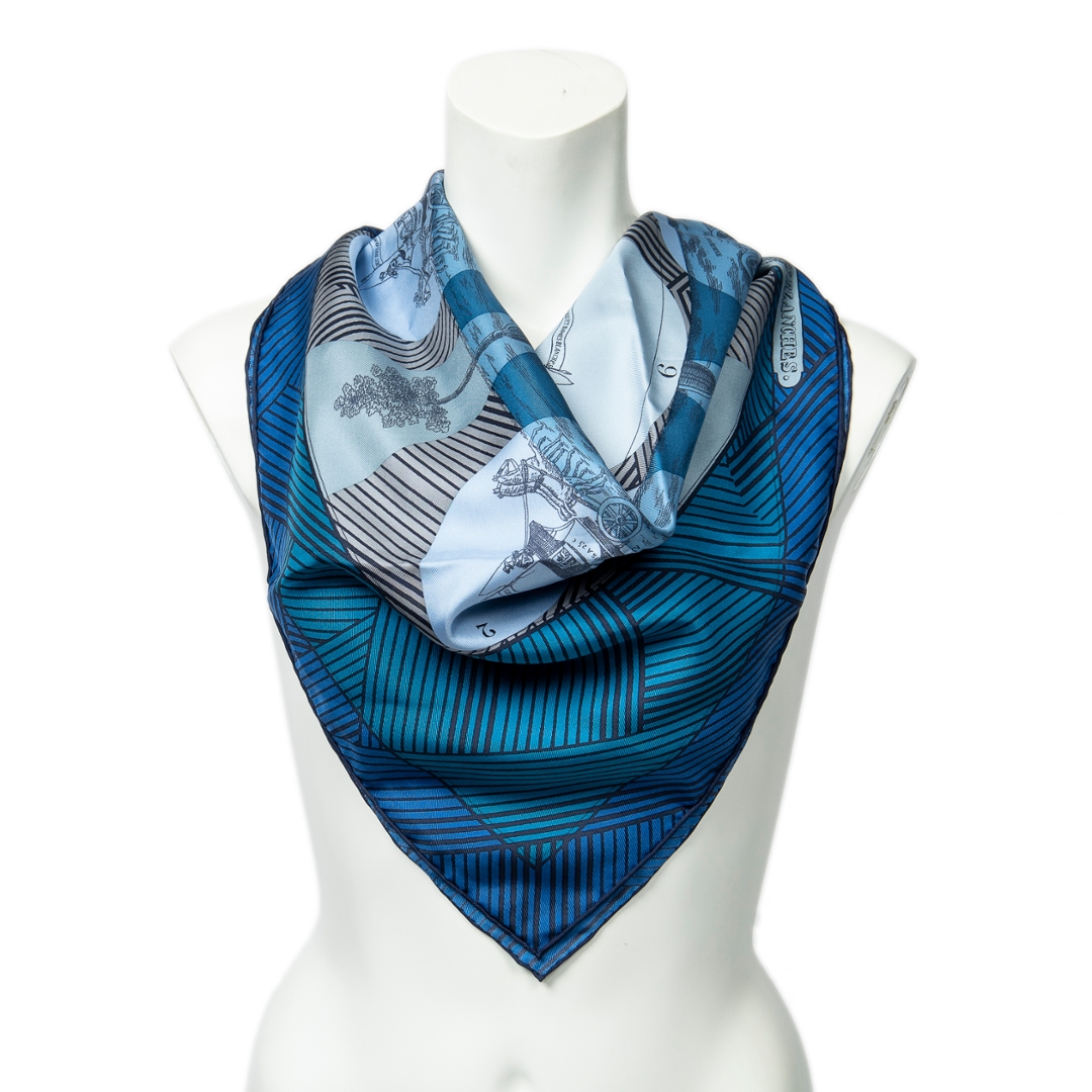 Accompanied by its certificate of authenticity, this Grade AA example is in excellent condition, showing only the lightest signs of careful use. A classic addition to any wardrobe, the Hermès blue and grey silk scarf combines artistry, heritage, and practicality, making it a highly desirable accessory for collectors and fashion enthusiasts alike.