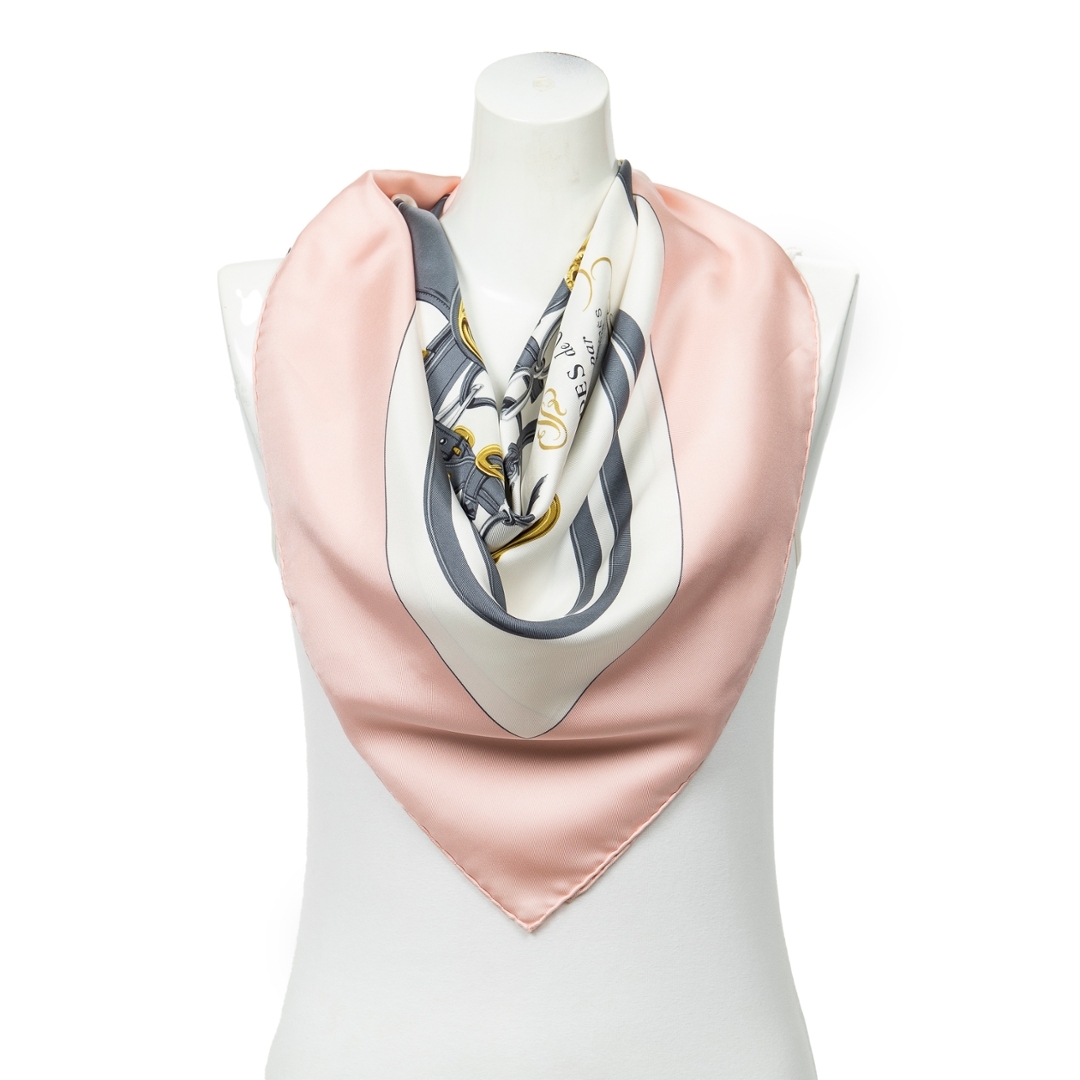 Measuring approximately 90cm by 90cm, it offers versatile styling options, whether draped gracefully around the neck, tied to a handbag, or worn as a statement headscarf. The lustrous silk texture enhances both comfort and elegance, while the subtle interplay of pink and ivory evokes a sense of refined femininity.