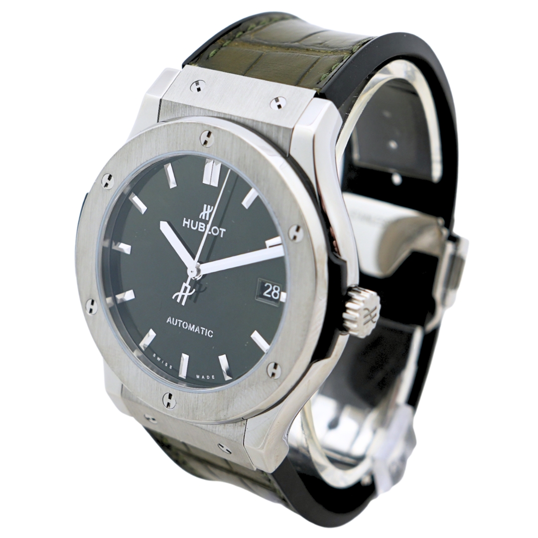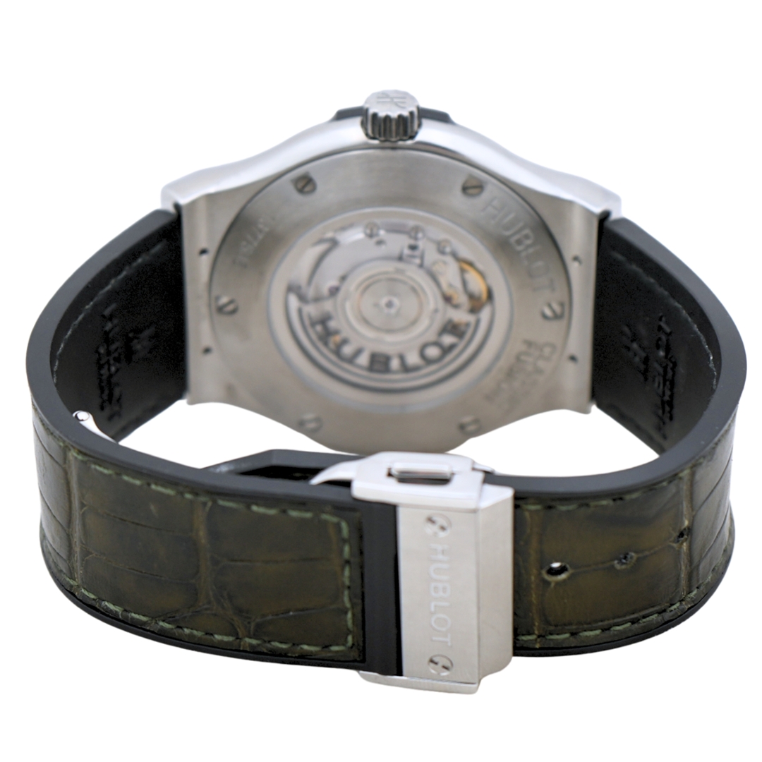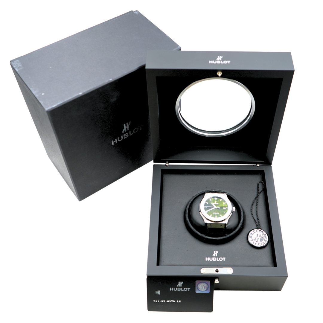 A Hublot Classic Fusion Titanium Green Watch, Green Rubber Strap with a Titanium Case & Clasp on a Green Dial