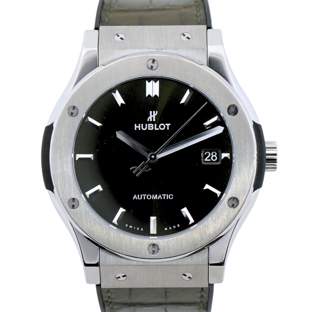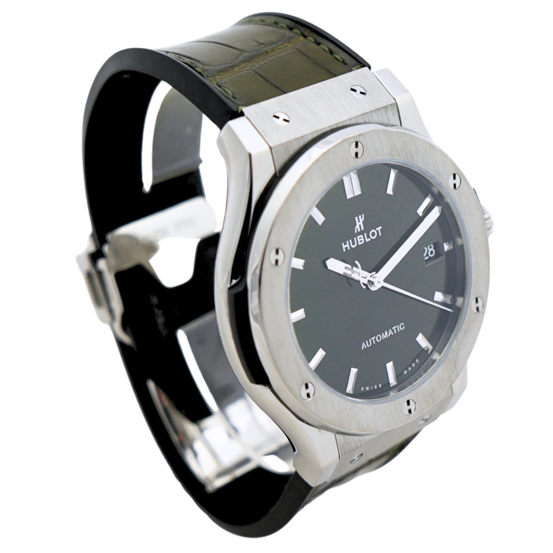 A Hublot Classic Fusion Titanium Green 511.NX.8970.LR is a bold yet refined statement piece, crafted with the modern collector in mind. Its 45mm case, made from lightweight and durable titanium, is paired with a matching titanium clasp and a green rubber-lined alligator leather strap, combining strength, comfort, and sophistication. The satin-finished green dial adds depth and vibrancy, beautifully complemented by rhodium-plated hands and indices, with a discreet date display at 3 o’clock.