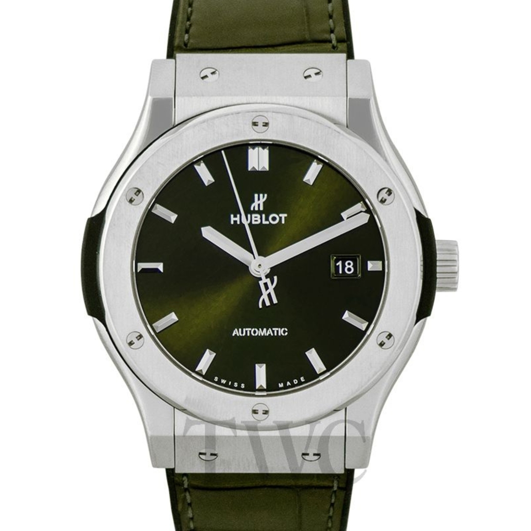 A Hublot Classic Fusion Titanium Green Watch, Green Rubber Strap with a Titanium Case & Clasp on a Green Dial