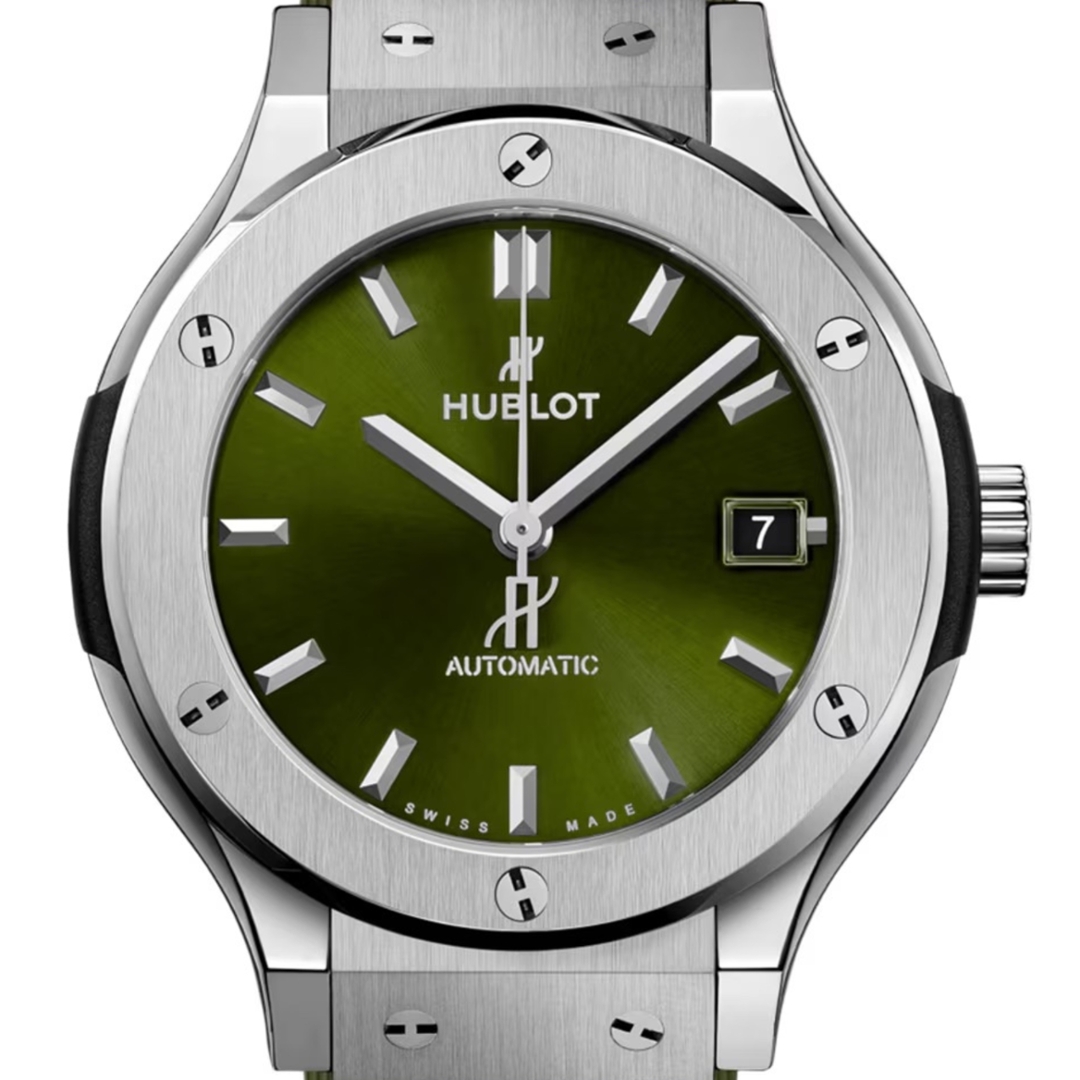 A Hublot Classic Fusion Titanium Green Watch, Green Rubber Strap with a Titanium Case & Clasp on a Green Dial
