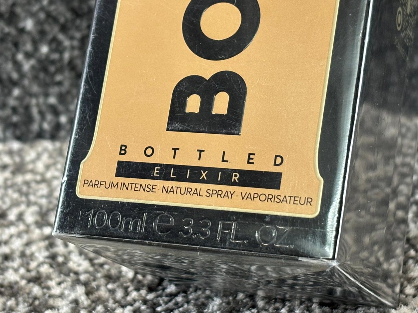 A 100ml bottle of Hugo Boss Bottled Elixir Parfum Intense, presented in its original presentation box and offering a powerful, refined evolution of the iconic Boss Bottled fragrance line. This elixir interpretation elevates intensity and depth, reflecting Hugo Boss’s modern vision of confident, self-assured masculinity.