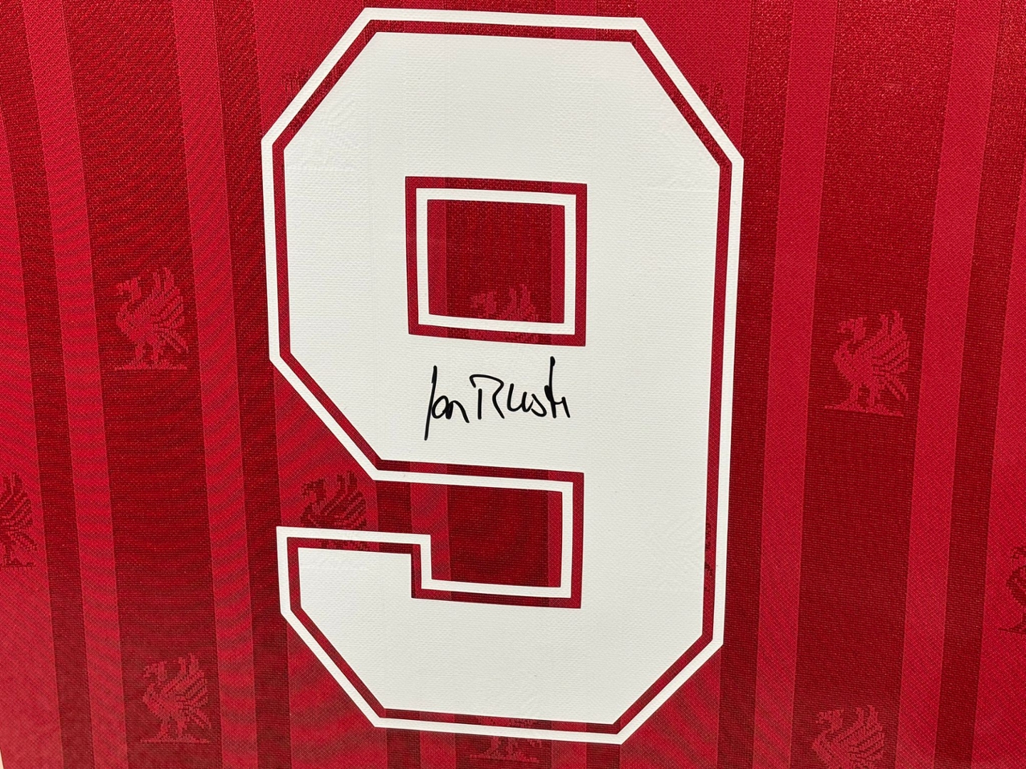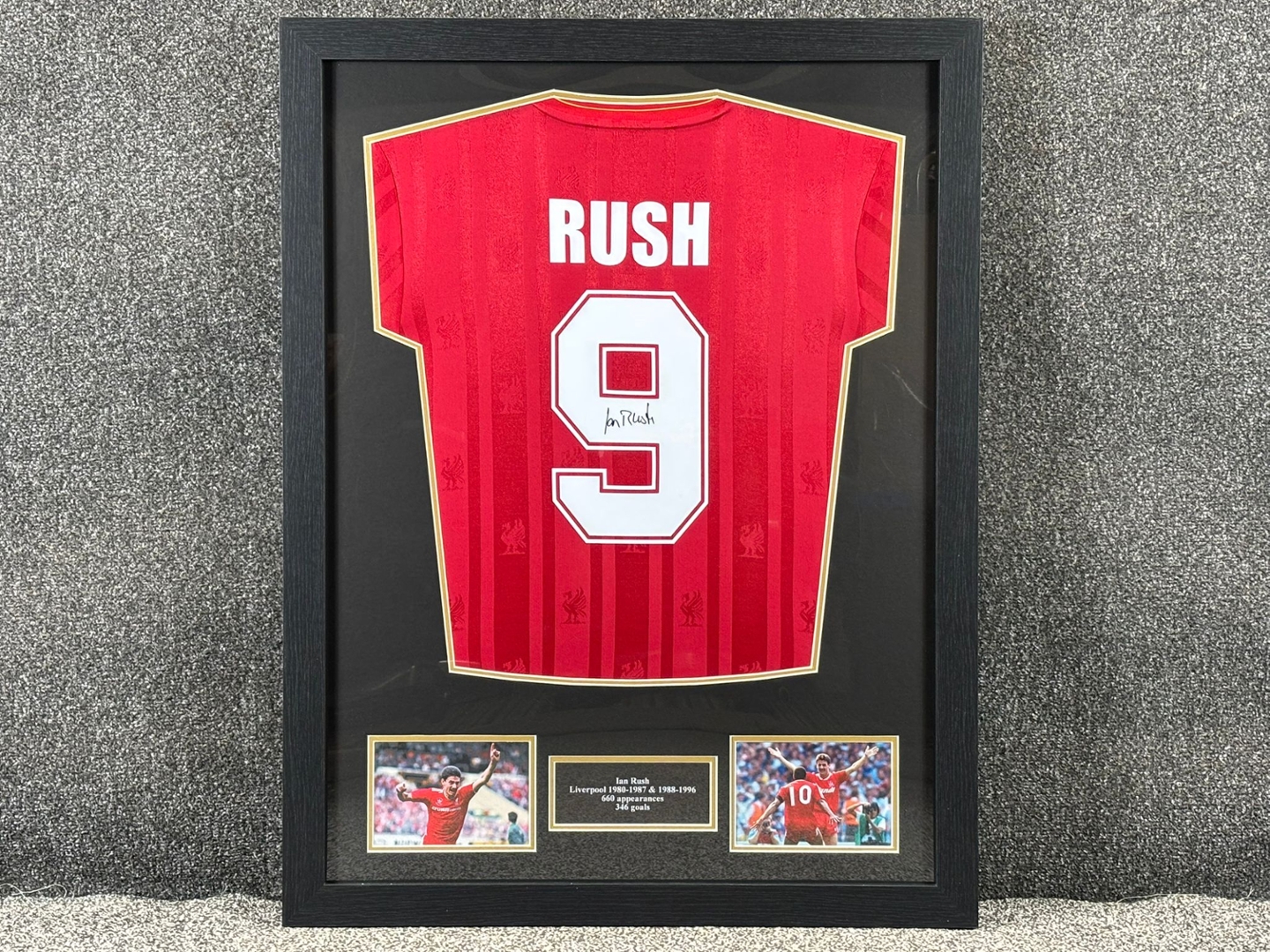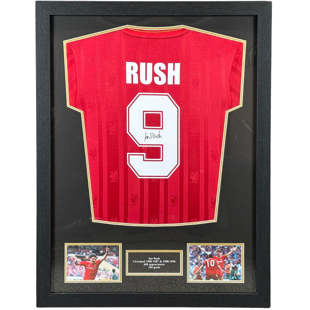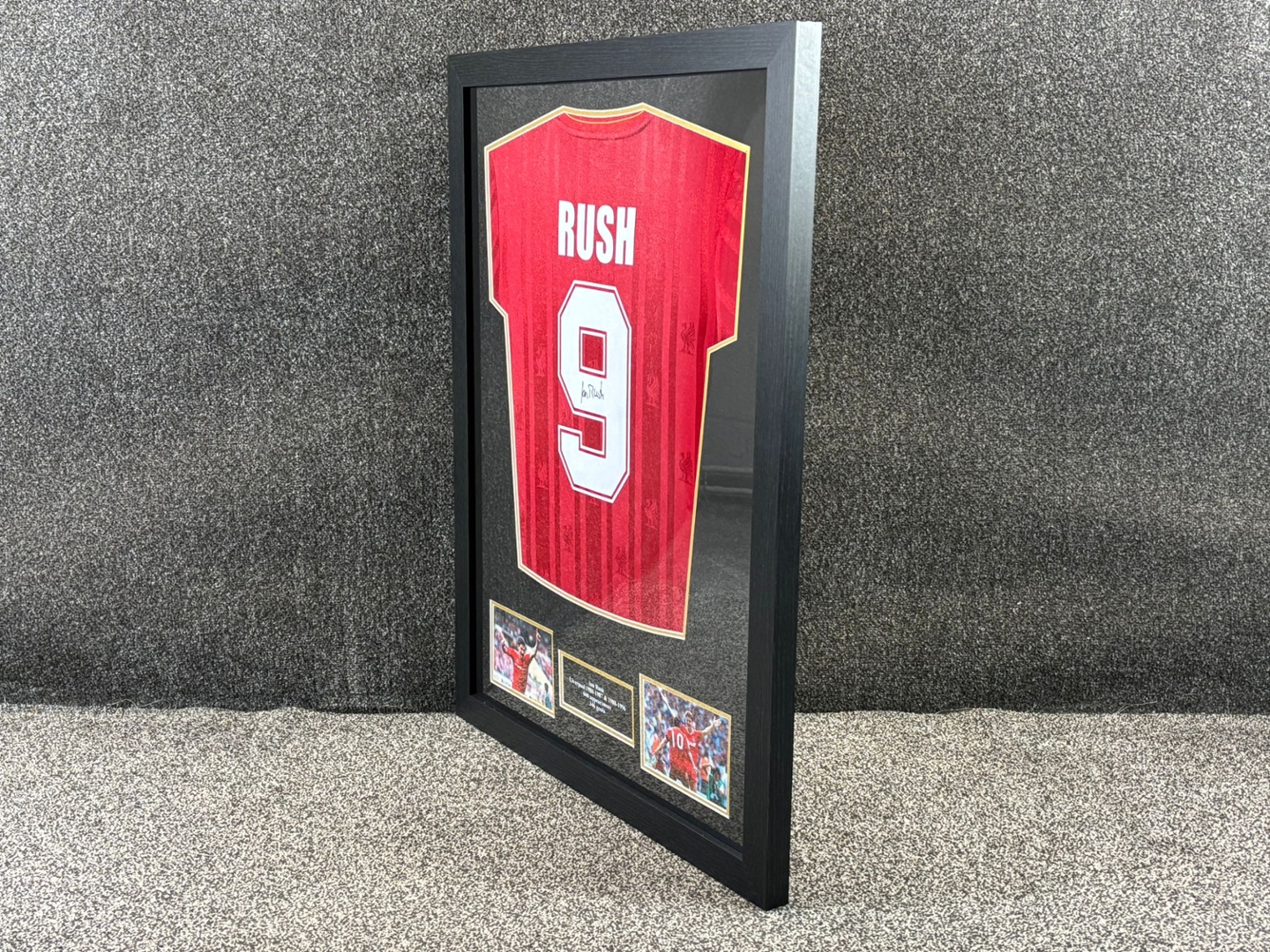 A signed and authenticated Ian Rush Liverpool Shirt in a presentation frame. Approx 87cm height, 67cm width.