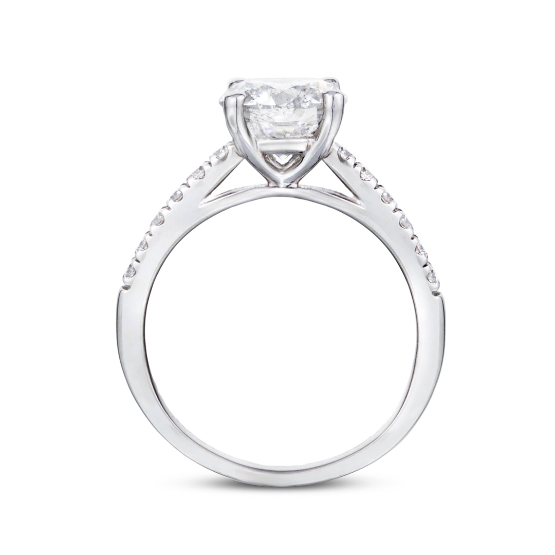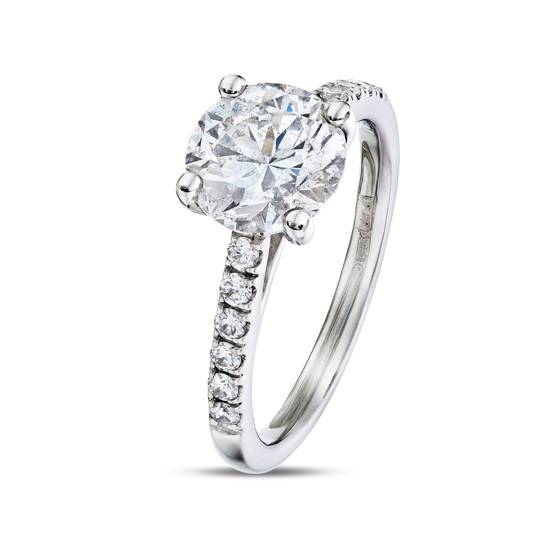 A brand-new, unused IGI-certified natural diamond solitaire engagement ring, set in platinum and centred with a striking 2.00ct brilliant cut diamond, complemented by a refined cluster of brilliant cut diamonds along the shoulders. The platinum setting provides a clean, contemporary foundation, enhancing the stones' brightness while ensuring lasting durability and a timeless aesthetic.