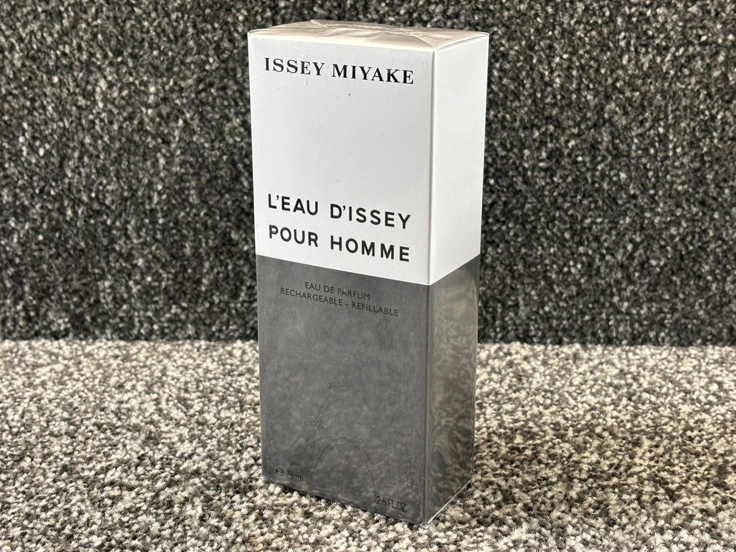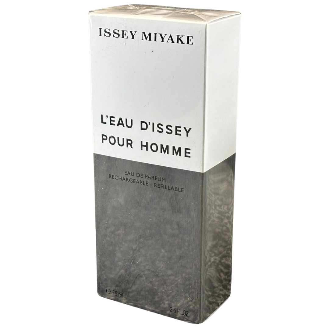A bottle of Issey Miyake L’Eau d’Issey Pour Homme Eau de Parfum, presented in its original presentation box and offering a deeper, more intense interpretation of this iconic fragrance. True to the Issey Miyake design ethos, it balances modern elegance with a confident and refined character.