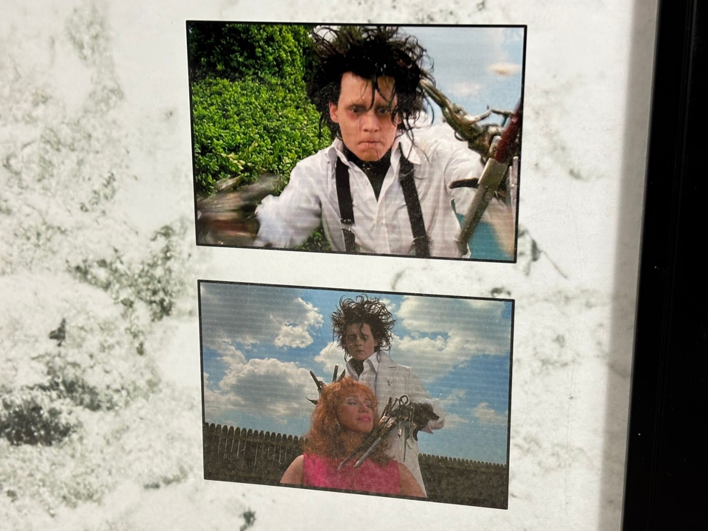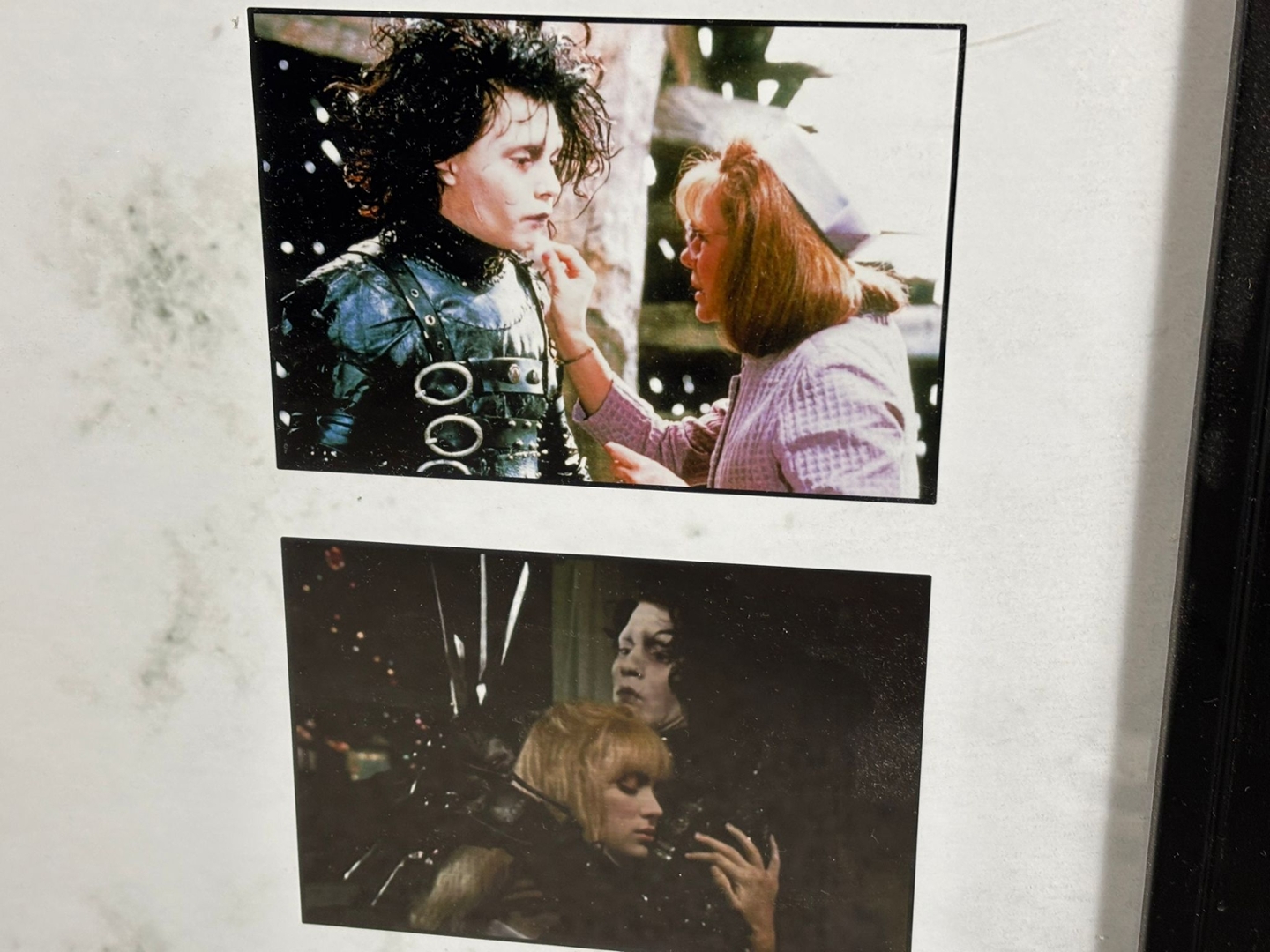 Framed to approximately 58cm in height and 83cm in width, the centrepiece features a haunting full-length image of Edward Scissorhands, personally signed by Johnny Depp. Surrounding this are four evocative stills from the film, capturing key emotional moments and the unique visual beauty that made the movie a cult classic. The bold Edward Scissorhands logo and snow-dusted background design add an atmospheric touch to the overall presentation.