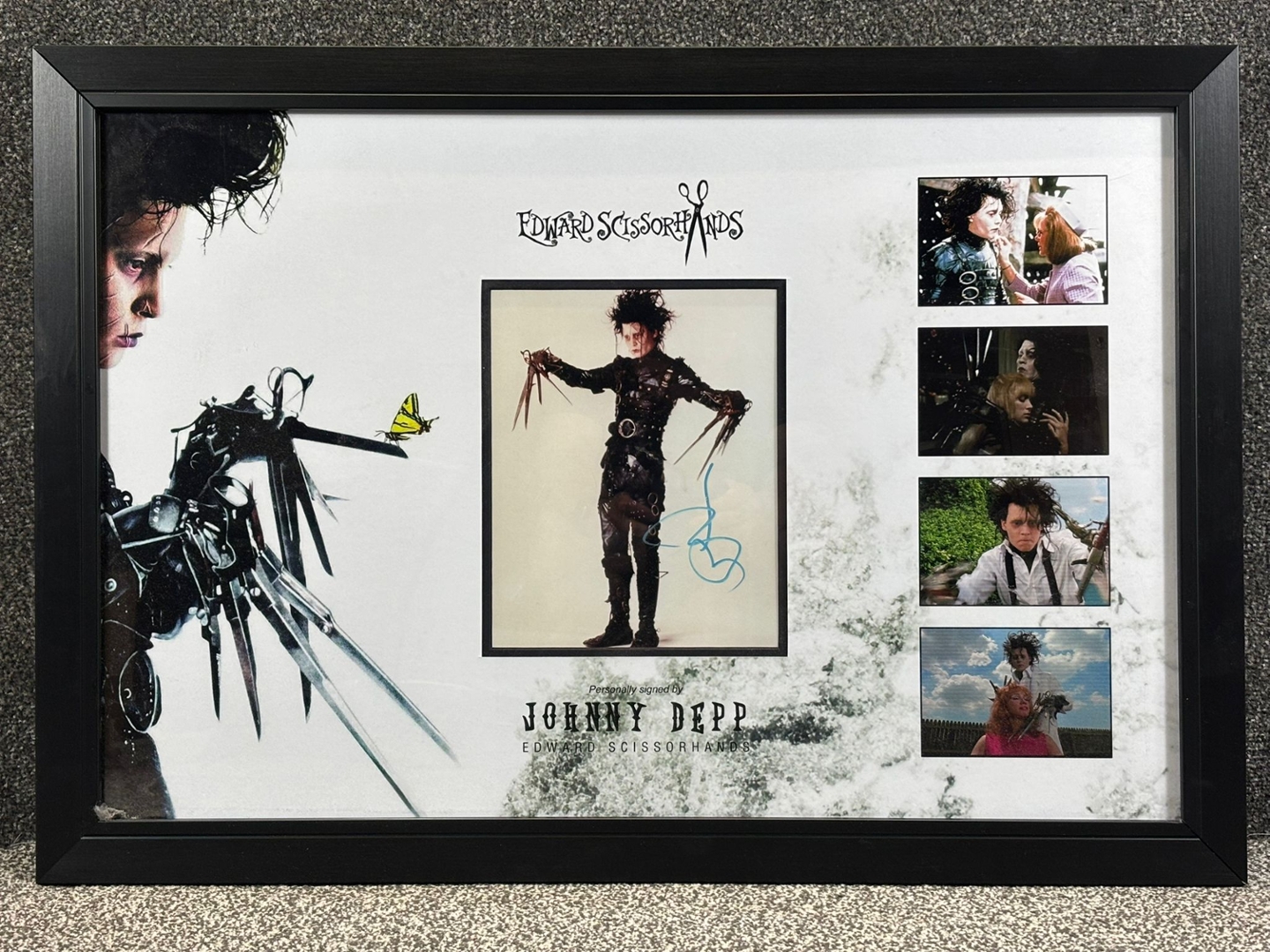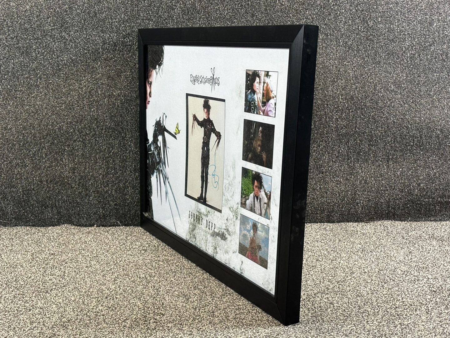 A signed and authenticated Johnny Depp 'Edward Scissorhands' Picture in a presentation frame. Approx 58cm height, 83cm width.