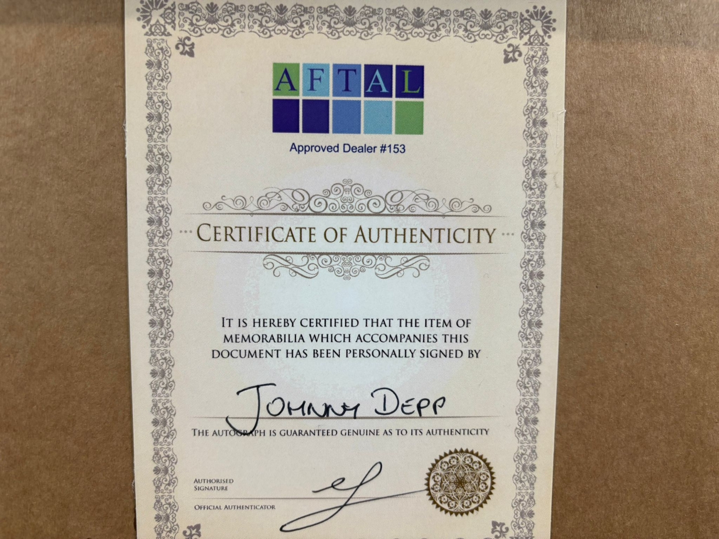 A signed and authenticated Johnny Depp Edward Scissorhands picture, dramatically presented in a premium widescreen frame. This captivating piece pays tribute to Depp’s iconic portrayal of the gentle, misunderstood Edward—a role that captivated audiences and defined a generation of storytelling.