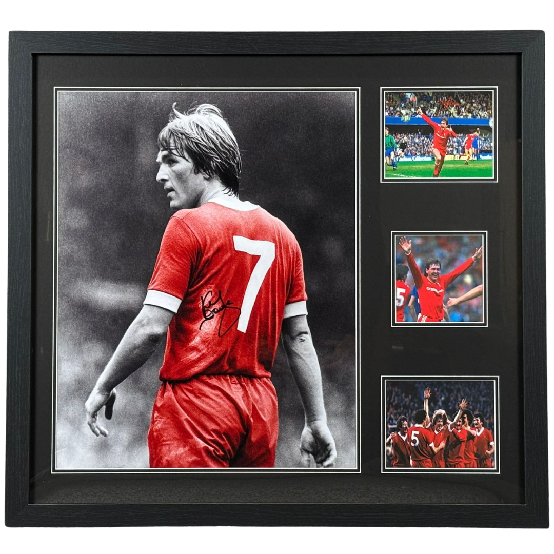 The striking main image captures Dalglish in action, with his autograph prominently displayed, surrounded by vibrant photographs celebrating his unforgettable moments and triumphs in Liverpool red. Every detail in this presentation reflects the pride and passion synonymous with both Dalglish and the club he defined.
