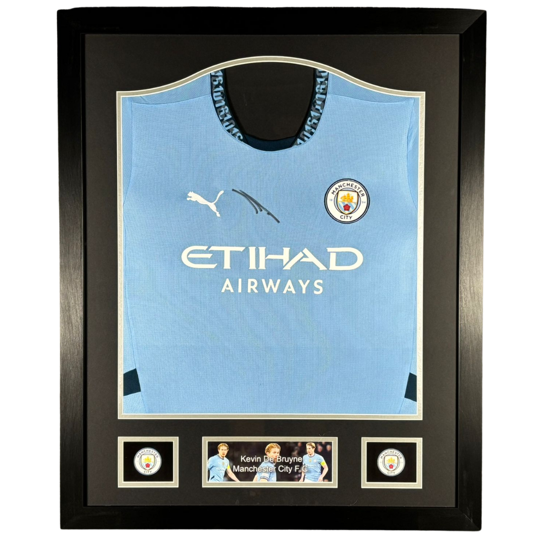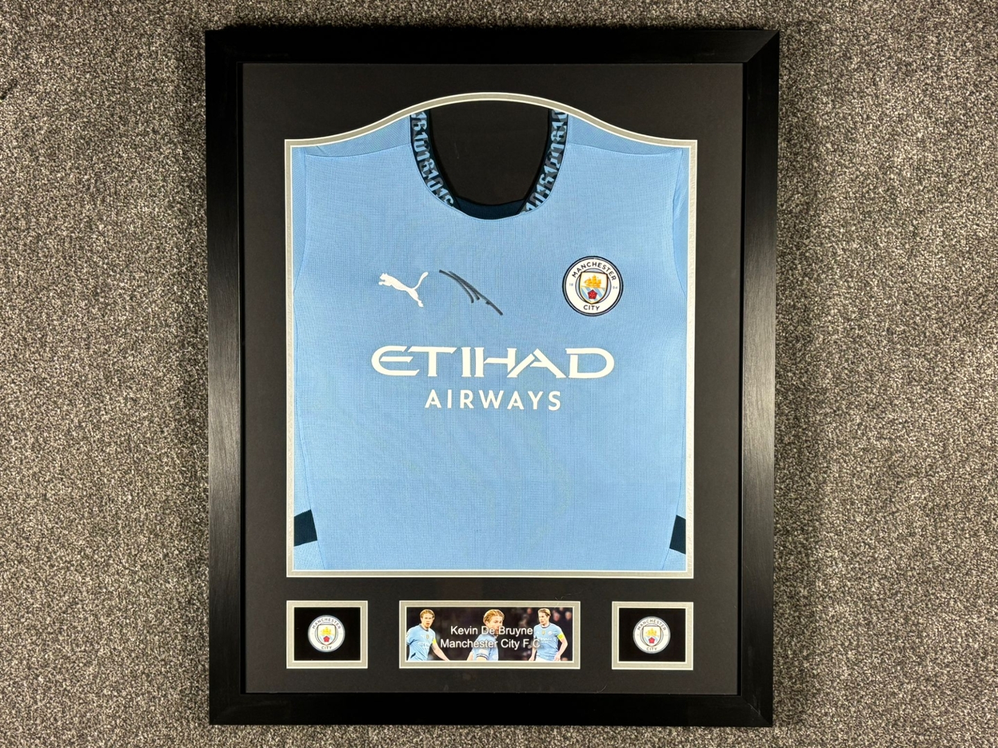 A signed & authenticated Kevin De Bruyne Man City shirt in a presentation frame. Approx 33" height, 27" width.