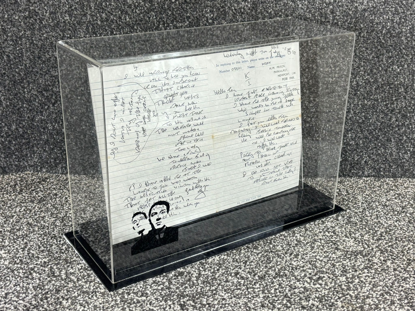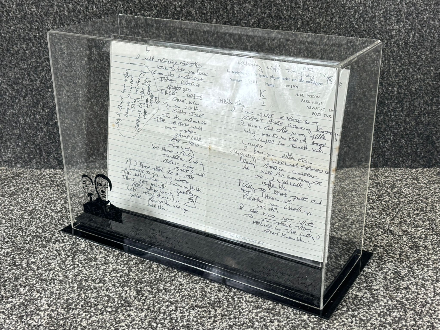 A signed and authenticated letter from Reggie Kray to his brother Ronnie from Prison in a presentation case. Approx 28cm height, 38cm width.