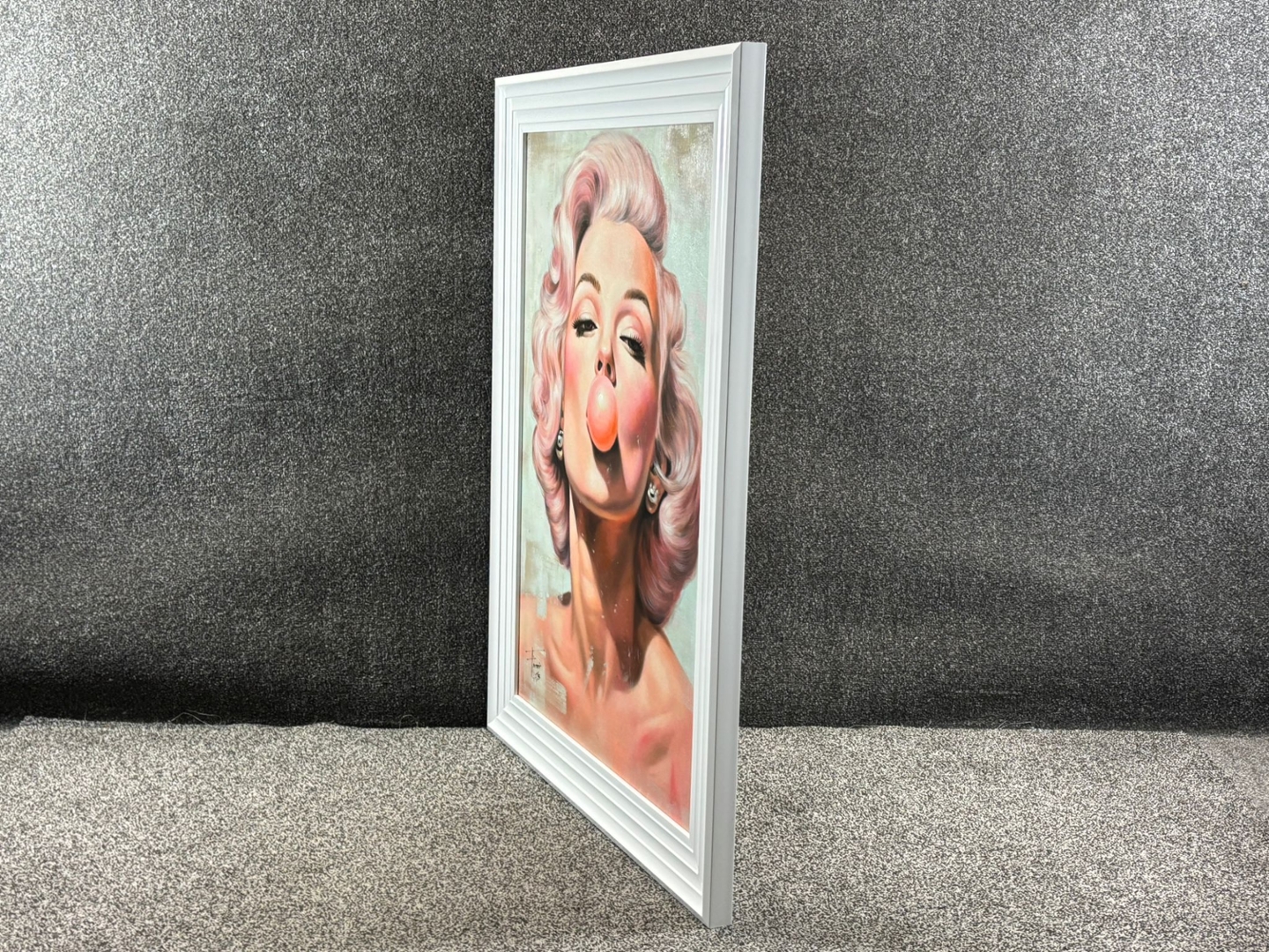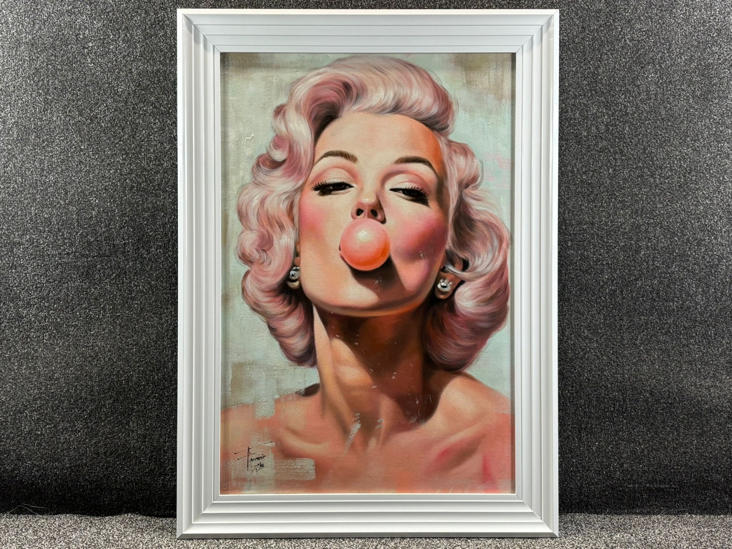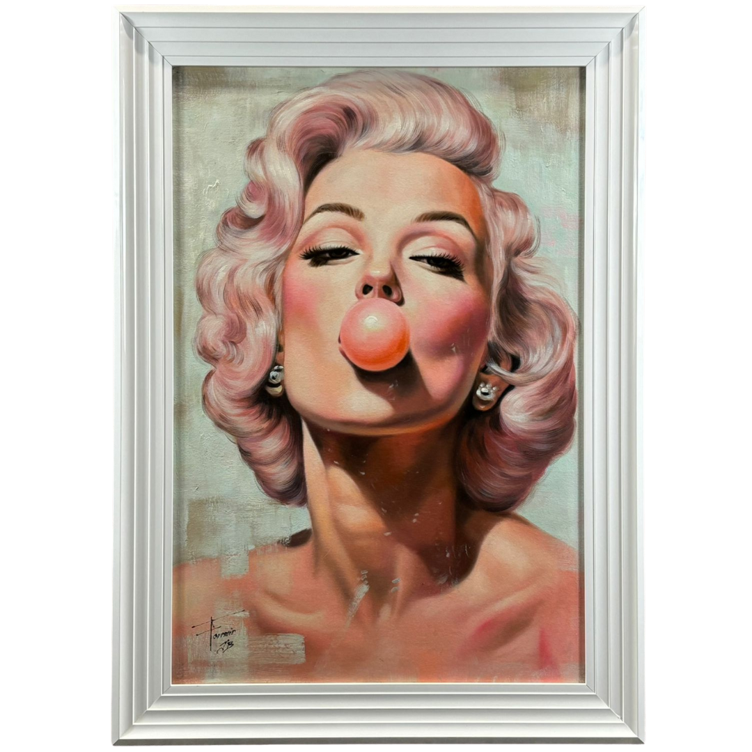A white-framed original oil painting by the celebrated artist Fournier, Bubble Gum L’Icone Pop is a radiant and playful homage to the timeless allure of Marilyn Monroe. Measuring 90cm x 60cm, this striking composition blends old Hollywood glamour with modern pop art attitude. Monroe’s iconic beauty is flawlessly rendered, from her softly curled platinum hair to her flawless skin, with a cheeky twist—a bubble of pink gum, perfectly centred, that transforms the portrait into a statement of bold individuality.