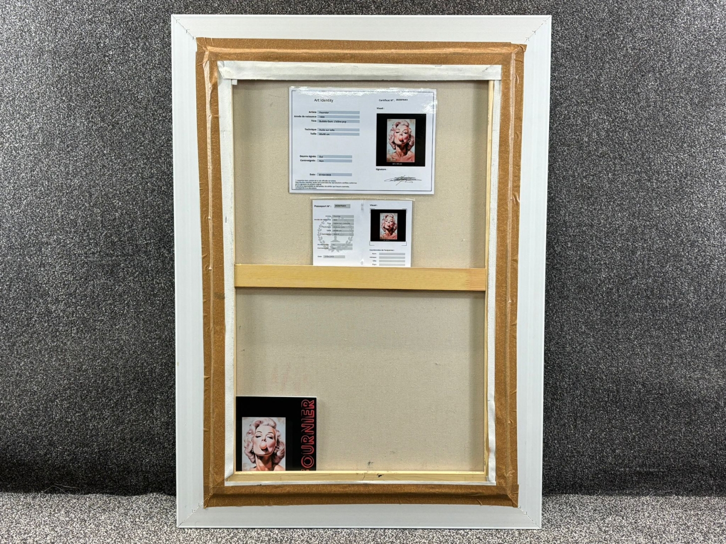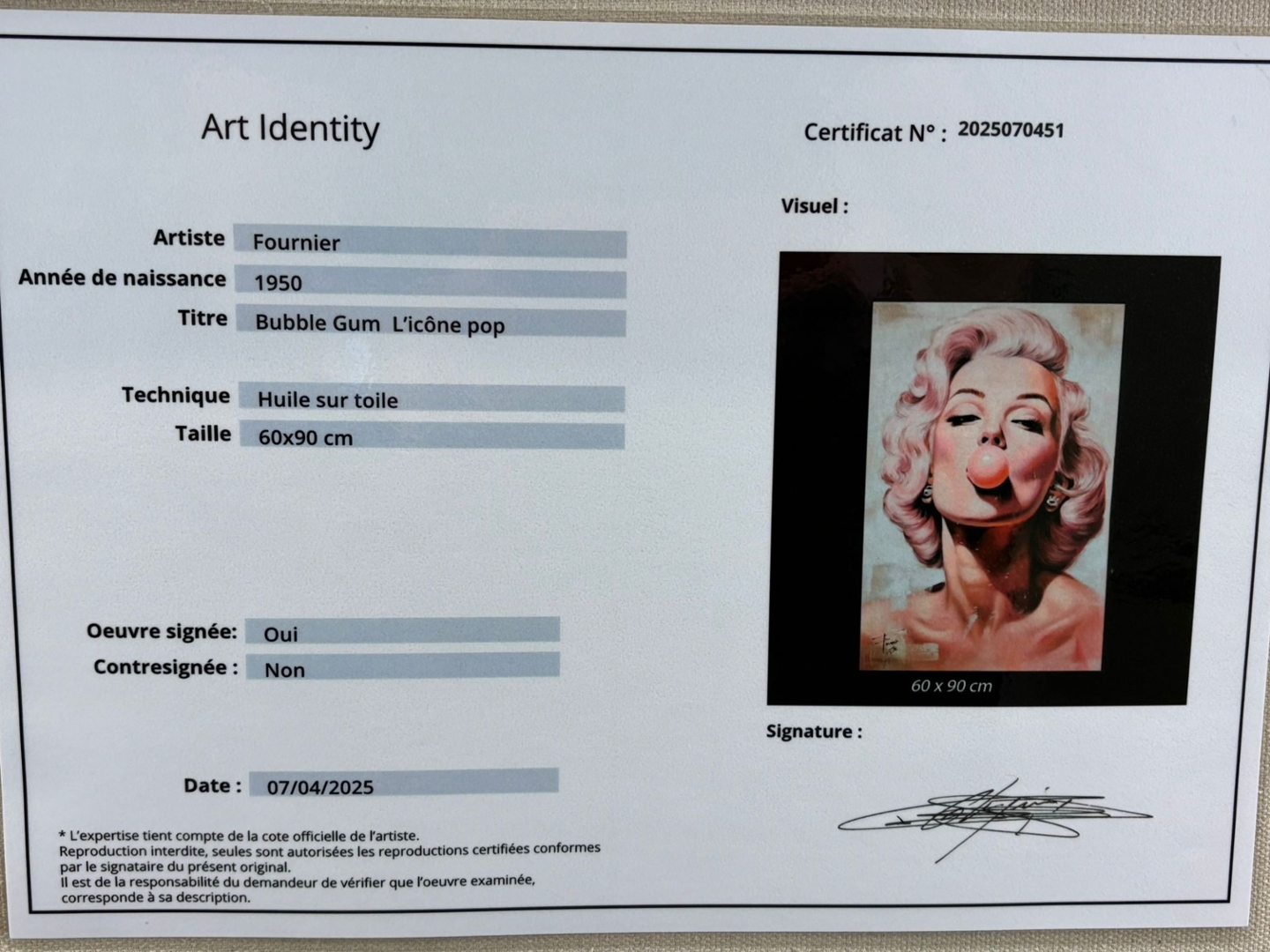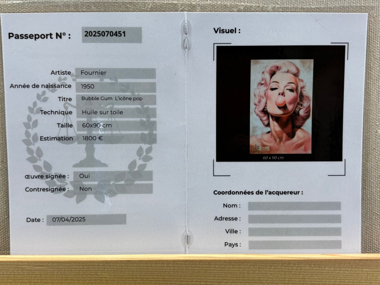 A white-framed original oil painting by the celebrated artist Fournier, Bubble Gum L’Icone Pop is a radiant and playful homage to the timeless allure of Marilyn Monroe. Measuring 90cm x 60cm, this striking composition blends old Hollywood glamour with modern pop art attitude. Monroe’s iconic beauty is flawlessly rendered, from her softly curled platinum hair to her flawless skin, with a cheeky twist—a bubble of pink gum, perfectly centred, that transforms the portrait into a statement of bold individuality.