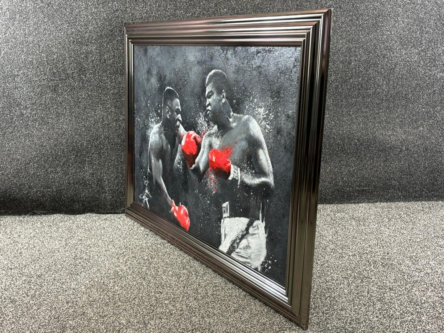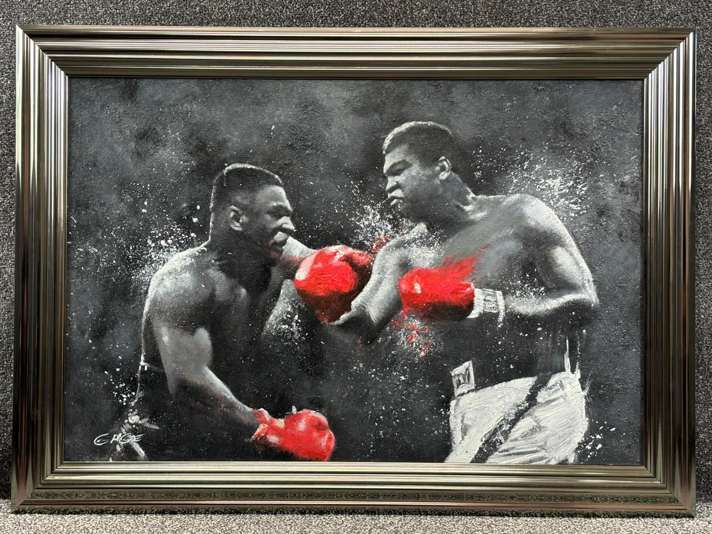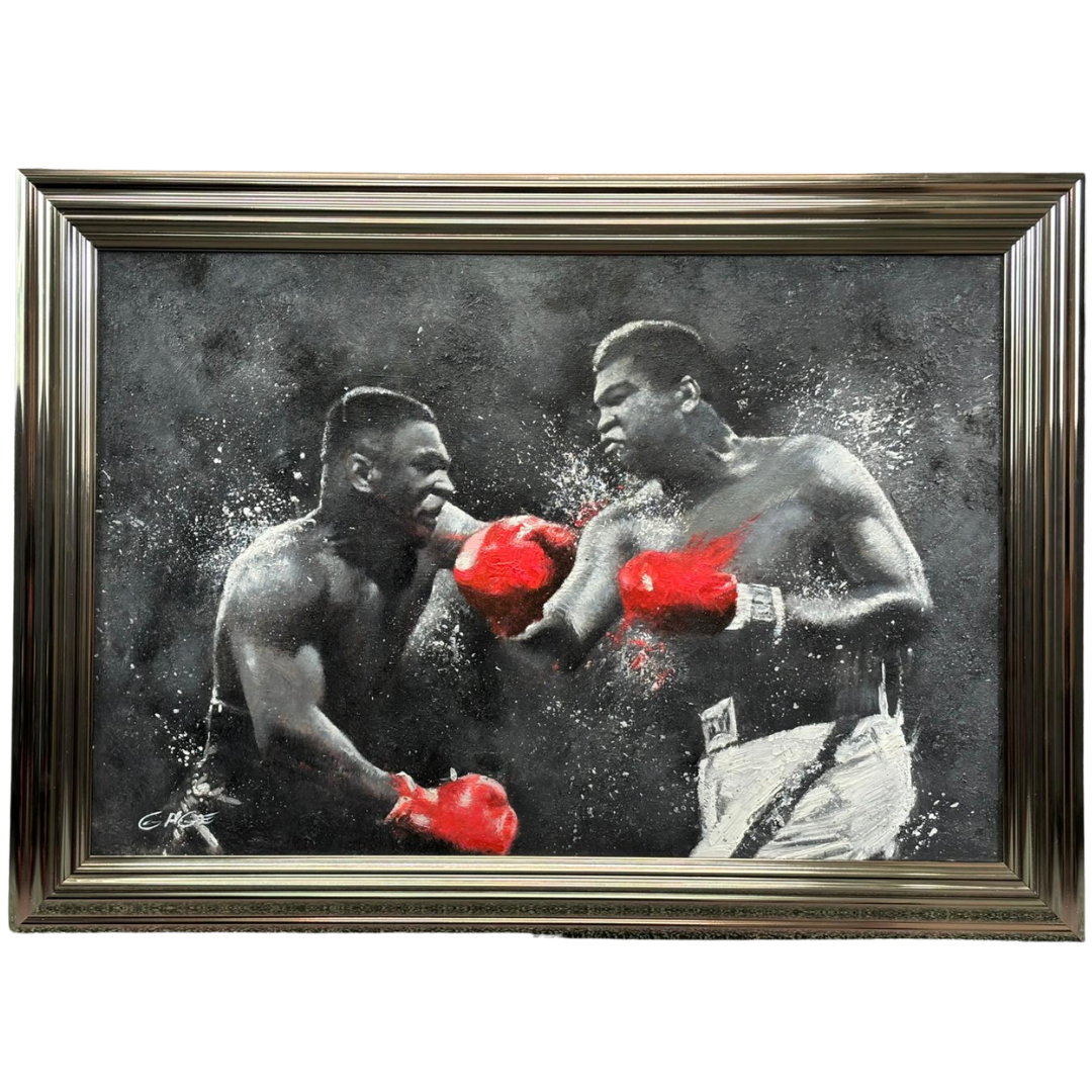 A silver-framed original oil painting by the acclaimed artist Gage, L’art du Knockout is a dramatic and imaginative tribute to two of boxing’s greatest legends—Mike Tyson and Muhammad Ali. Measuring 60cm x 90cm, this striking piece captures a dream matchup frozen in time, where raw power meets tactical brilliance. Painted in expressive black and white, the composition explodes with energy as vivid red gloves clash in a symbolic collision of eras.
