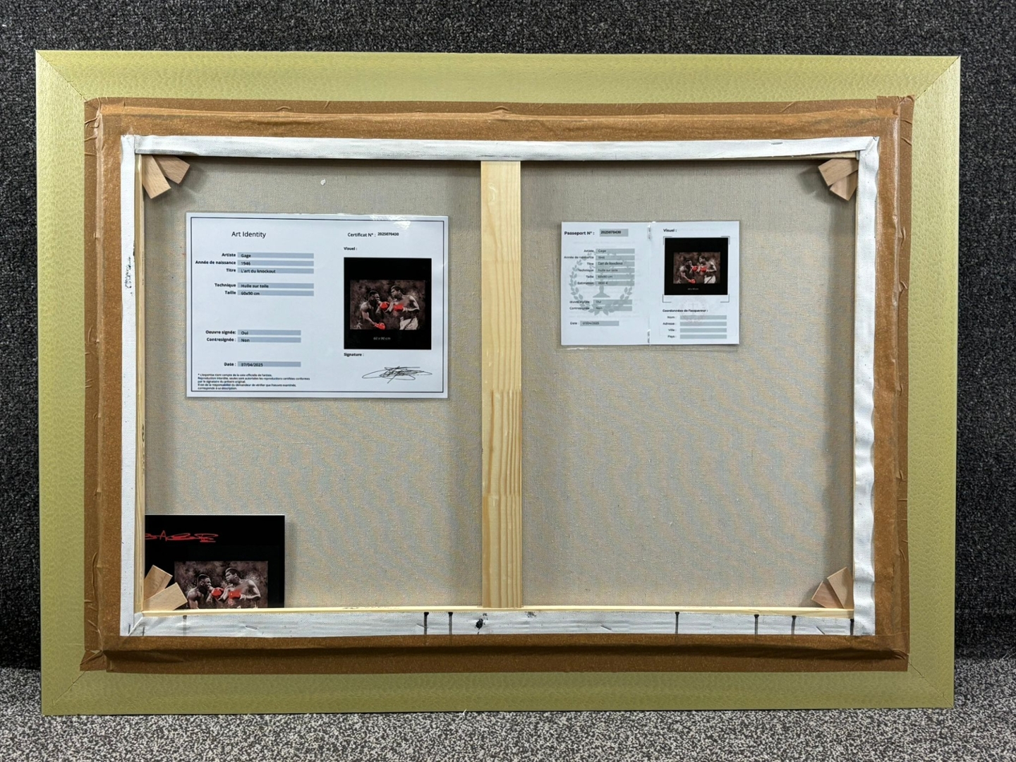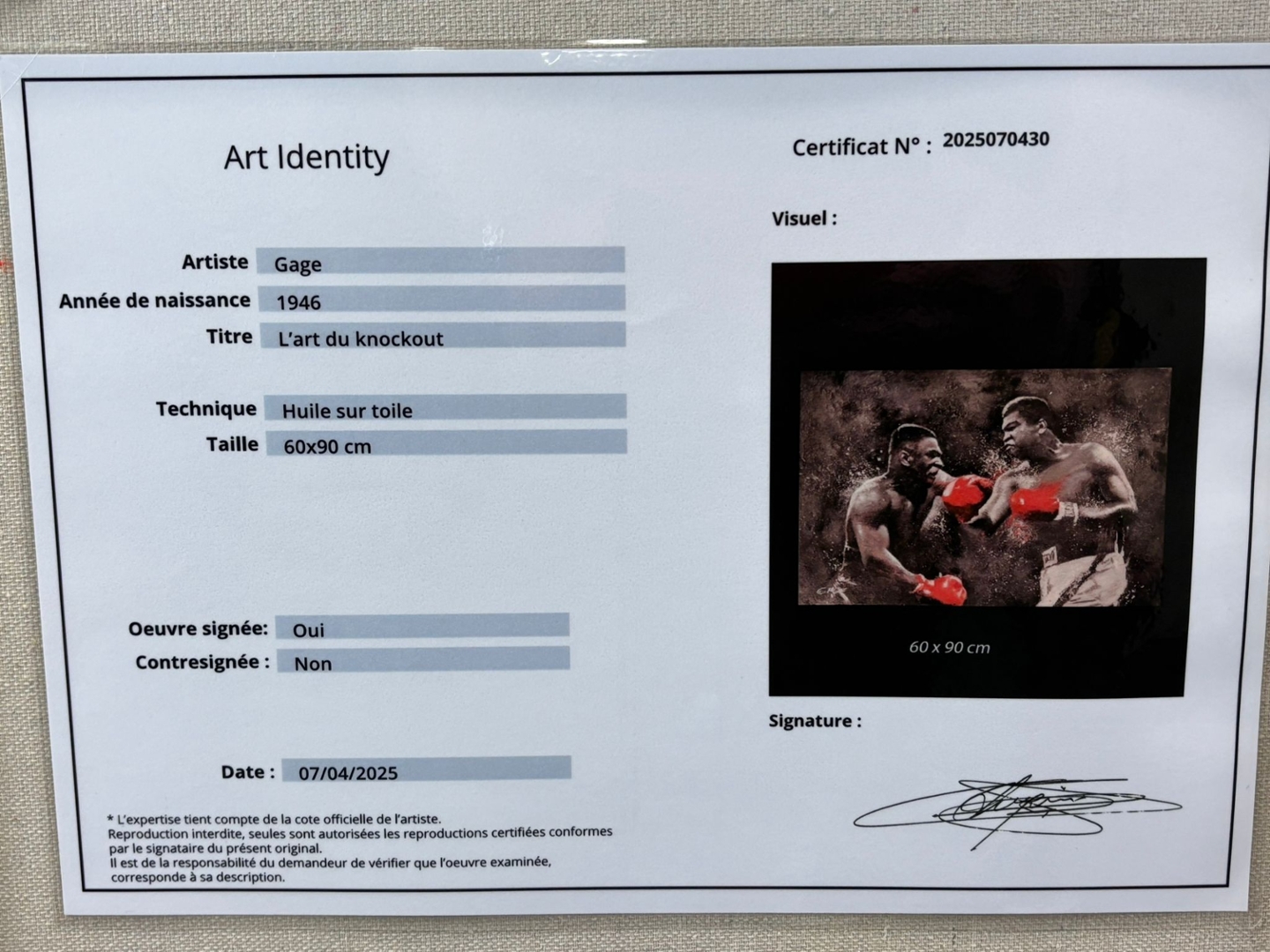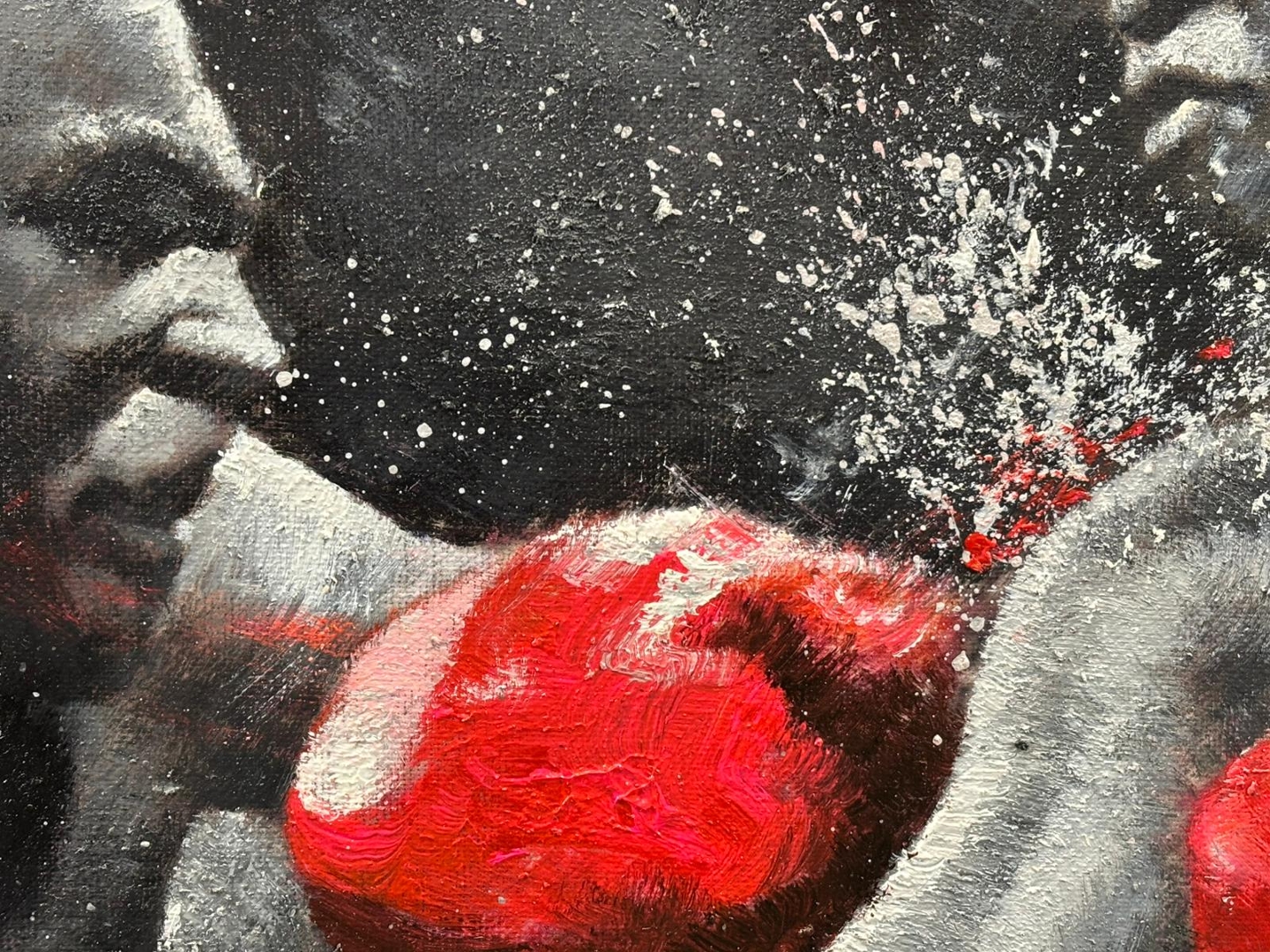 A silver-framed original oil painting by the acclaimed artist Gage, L’art du Knockout is a dramatic and imaginative tribute to two of boxing’s greatest legends—Mike Tyson and Muhammad Ali. Measuring 60cm x 90cm, this striking piece captures a dream matchup frozen in time, where raw power meets tactical brilliance. Painted in expressive black and white, the composition explodes with energy as vivid red gloves clash in a symbolic collision of eras.