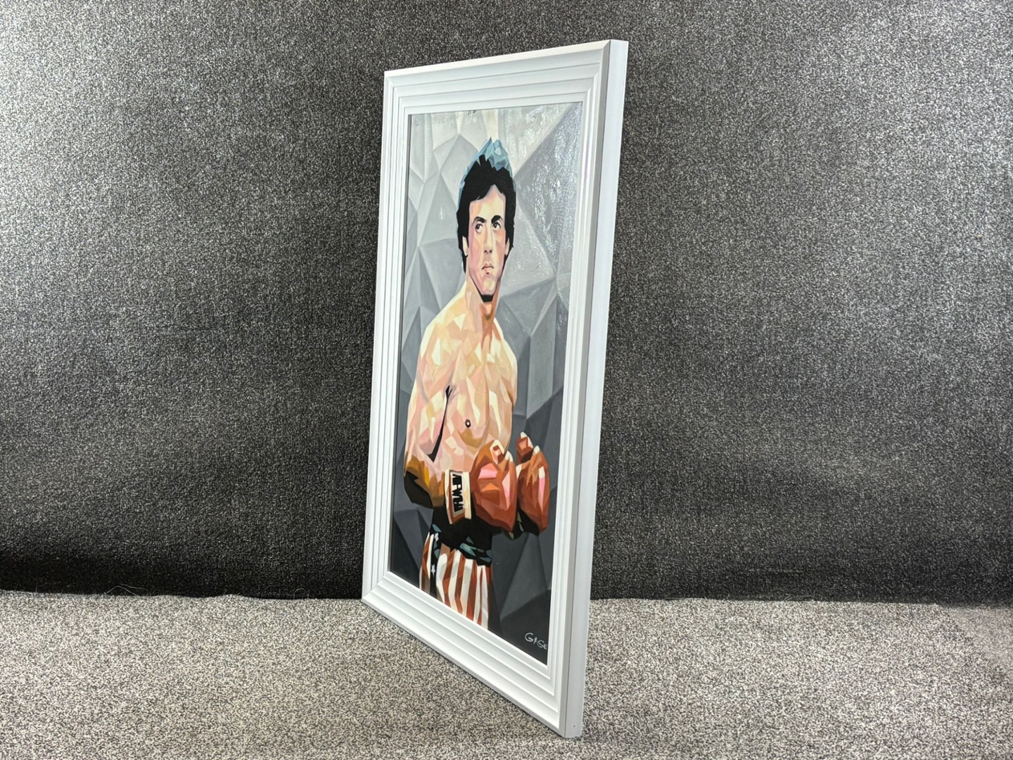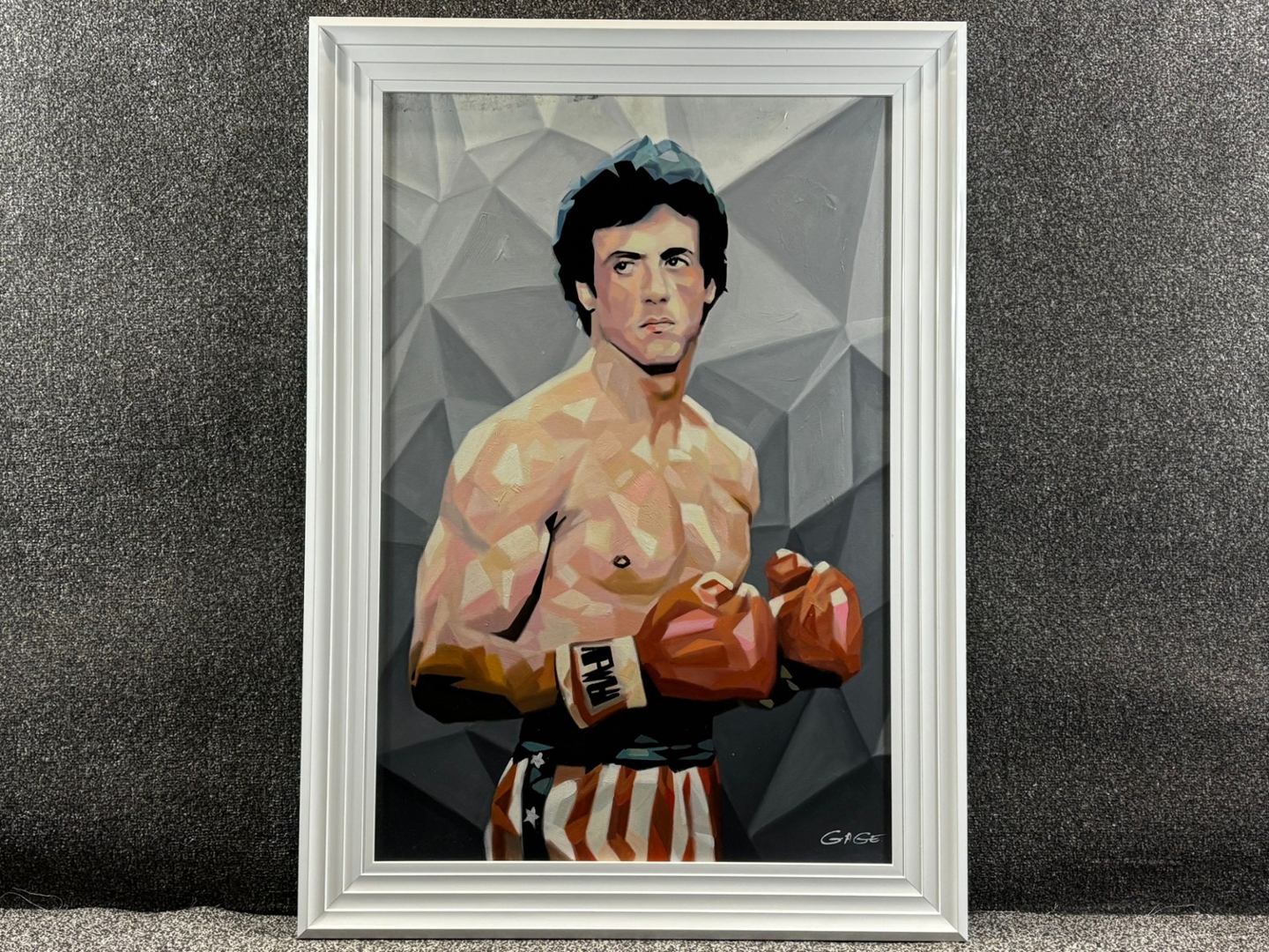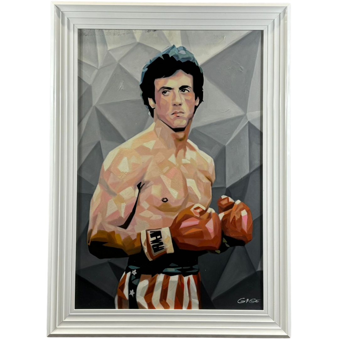 A white-framed original oil painting by the talented artist Gage, L’esprit de Rocky is a bold and modern tribute to one of cinema’s most iconic underdogs. Measuring 90cm x 60cm, this dynamic piece captures Rocky Balboa in his signature pose—gloves up, eyes focused, ready to fight. Rendered in a faceted, geometric style, Gage reinterprets the classic character with a fresh, contemporary edge.
